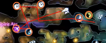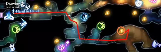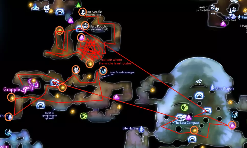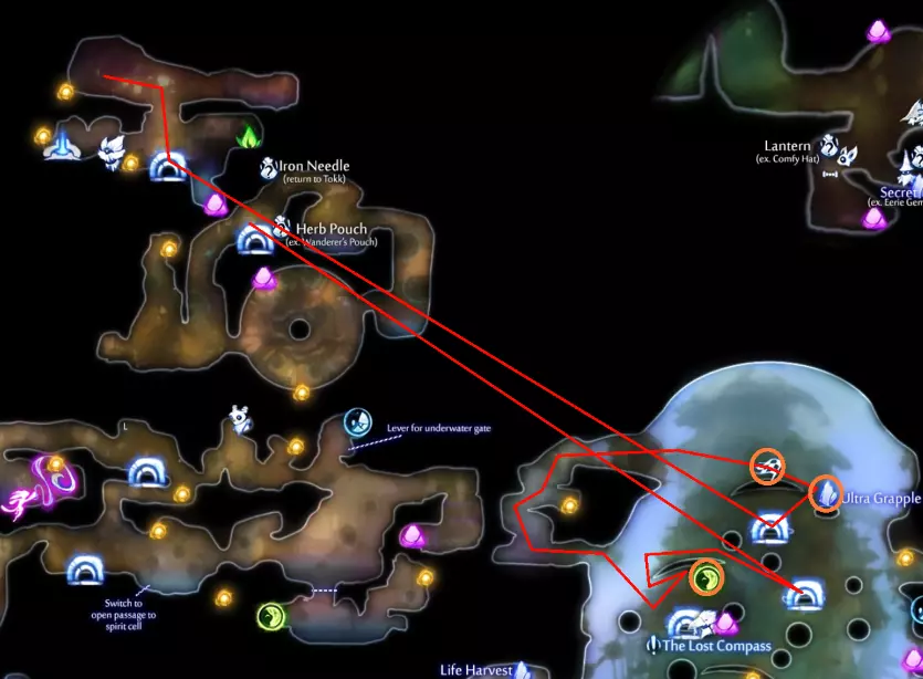 关于抓钩的说明 抓钩是一种需要谨慎使用的能力。频繁滥用会导致一些异常情况,你可能会迅速发现自己处于不想要的位置。 想象你确切想要到达的位置,并在脑海中勾勒一条从该位置穿过抓钩点的直线。你应该尽量让自己处于抓钩点正对面、与目标位置相对的一侧。由于你通常想要去往更高处,因此在使用抓钩前,应尽量让自己处于较低的位置。这需要一些练习来适应,但在尝试任何低死亡或无死亡挑战之前,掌握这项技能是值得的。 提示与技巧 此光源需要以特定角度使用抓钩。最佳方式是从这个轮子的下方接近。 注意这个生命细胞的角度。诀窍是先下落一段距离再使用钩爪。三段跳会有帮助,但并非必需。 爬回顶部收集追逐序列后的物品后,你可以向右下落进入灵界试炼区域。如果时机判断得当,你甚至能拿到顶部的灵火。 **危险区域**:第一个区域有一个陷阱门,需要你扳动上方的隐藏开关来排水。下方区域虽然有一些不错的物品(包括一个生命碎片),但**非常危险**。那里有一个蜂巢,在你仅有的狭小站立空间内,很容易将你淹没。最好的做法是**等待**,等你排干水、拥有更多生命值/机动性后再回来。此外,在获得“Swim Dash”后,你无论如何都得返回,去按下附近的一个按钮以获取最后一件物品。 **回溯** 路径