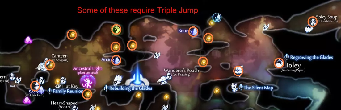 关于“发射”的说明:在该区域,“发射”应作为你的主要技能。这更像是一个解谜区域,而非平台跳跃区域。 关于“发射”需要注意的是,它会在与二段跳/冲刺相同的所有条件下重置,这些条件包括: - 当你接触地面时 - 当你接触墙壁时 - 当你进行猛击时 - 当你使用抓钩时 - 当你冲刺穿过沙地时 因此,尝试在发射时瞄准投射物和墙壁。如果你留意周围环境,在空中时应该永远不会遇到技能耗尽的问题。 关于“地雷”的说明:这些悬挂在地面和墙壁周围的小型炸弹可能会带来麻烦,因为它们会将你推开,使你陷入更多困境。必须小心处理它们,有时它们并不那么显眼。最佳方法是运用部分平台跳跃技巧进入它们的触发范围,然后使用剩余的技能躲避爆炸或退回之前的区域。 ### 技巧提示 由于整个区域都颇具挑战性,对于任何遇到困难的特定区域,建议参考顶部的视频。Willoh's End 部分从 4:52:50 开始。 理论上,你需要冲刺穿过传送门来获取这盏灯,但使用“发射”技能可以轻松绕过转轮。 使用“灵魂弧”及其三枚碎片可以轻松击败该 boss。