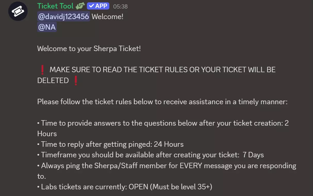 第二步 – 阅读服务器规则和夏尔巴人信息 进入后: 阅读规则、常见问题解答(FAQ)和夏尔巴人信息频道。这些内容会说明夏尔巴人可以做什么、不可以做什么,如何规范行为以及工单的使用方式。 确保你的Discord名称和《逃离塔科夫》游戏内名称清晰且易于识别。