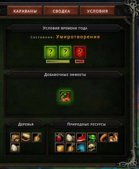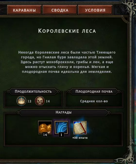 这里将提供一些基本信息: 时长——即获胜所需的分数以及失败所需的耐心值。这很简单。完成所有指令将为您带来最高12点声望(胜利)点数。请记住,完成所有指令并非总是轻而易举的任务,而且获胜所需的点数越多,就越需要思考如何从状态中获取更多点数。此外,通过向要塞运送箱子和居民也可以获得胜利点数,但这属于随机获得声望点数的方式。例如,在一局游戏中,你可能通过运送物资获得4点声望,也可能一点都得不到。 肥沃的土地——中等和大量的数量是良好的指标。你可以相当确定,获得的农场或花园图纸会对你有所帮助。如果某个生物群系中肥沃土壤较少,那么你要知道,获取植物、水果、蔬菜等资源将主要依靠采集。要是能在这样的生物群系中找到2片及以上的肥沃土壤区域,那就算你运气不错了。有时,在土壤数量中等的生物群系里,开了6片空地也可能只出现1片肥沃土壤。随机机制,真见鬼) 奖励方面——这里就不用多说了。为了生存,我们在城市中提升被动技能,经验值让我们能够解锁这些城市中的被动技能。印章碎片能让我们在周期结束时合成这些印章。这部分其实没什么好解释的。 3号标签页——条件。