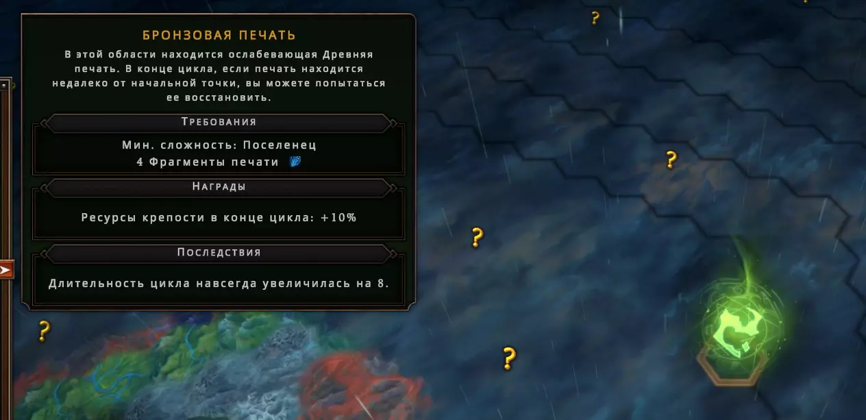 难度也是自动设置的。当你开始新的循环时,城市旁会显示“定居者”难度。定居点距离城市越远,难度就越高。请记住,难度通常可以提高,但无法降低。如果游戏为你设置的是“老兵”难度,那么这很可能就是最低难度了。难度提升体现在以下方面: - 暴风雪中可能出现的减益效果数量增加; - 获胜所需的声望点数增加; - 敌对度修正值提高(这意味着哪怕只是轻微靠近森林,敌对度也会大幅上升); - 增益效果数量减少。 在我看来,最可怕的就是敌对度,它在一定程度上决定了你的下属会以多快的速度死亡和陷入消沉。3 修饰符、事件、印记 修饰符。