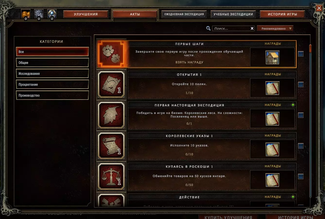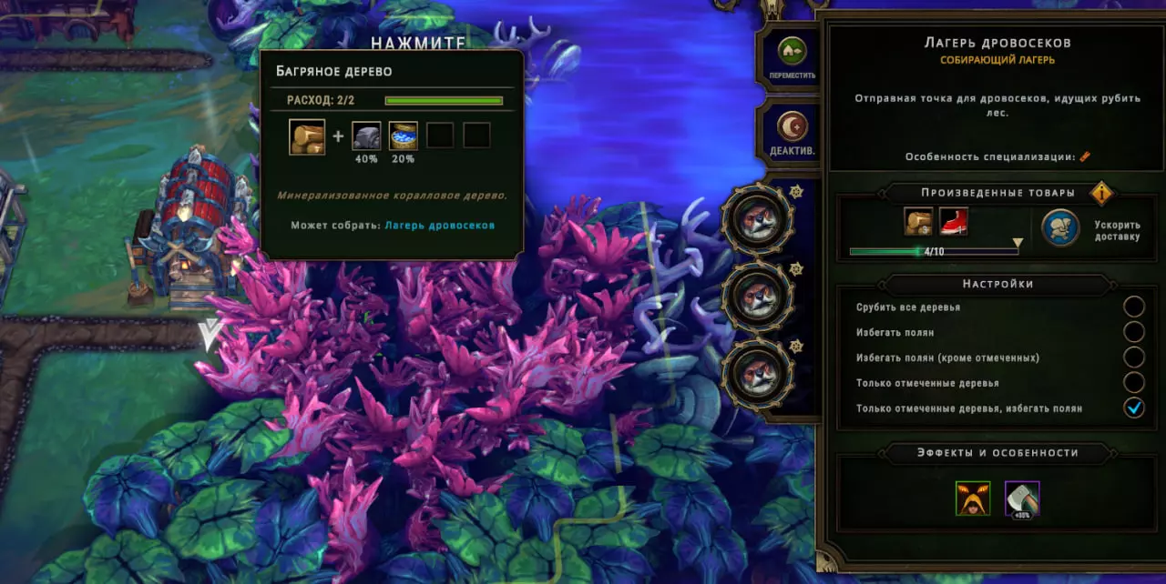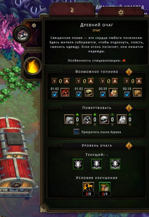 “行为”是成就与普通任务的结合体。完成“行为”可获得经验值和各种强化效果,因此完全不应忽视它们。如果您懒得完成某些特定“行为”,且不追求成就,那么可以只关注那些能提供游戏内增益效果(баффы)的“行为”,其余的可以不管。 若要追踪“行为”,可在相应“行为”右侧勾选标记。它会在您选择定居点位置前显示在地图上,并且在游戏过程中按Esc键打开的菜单里也能看到。游戏初期您可以不用理会它们,随着游戏的进行,它们通常会自动完成。 **升级** 升级需要花费金钱……呃,也就是游戏内的货币。这很简单——您进行游戏、建造定居点、获取资源,然后用这些资源解锁各种增益效果,以便更轻松地挑战更高难度的游戏内容。游戏中有一些强化效果能带来非常强大的增益(例如商队额外增加1个名额或种族初始技能),所以如果您感觉自己已经准备好挑战更高难度却无法获胜,也不必沮丧。或许正如常说的那样,您只需要提升一下自身实力。 3. 建设我们的定居点(位于列宁格勒州) 那么,恭喜大家,我们已经为“史莱克沼泽”定居点选好了地址。 3.1 篝火与仓库 篝火。必须维持篝火的燃烧,因为如果没有工作人员或燃料,居民的士气会下降-18到-20,所有人都会开始死亡。如果合理选择和分配燃料,并且篝火处有一个人工作的话,监控这一点并不困难。 要正确分配所有资源,只需在需要的地方勾选或取消勾选即可。如果您已经储备了多种燃料,并且有剩余的话,始终可以通过箭头来设置优先级。如果某种资源的优先级至少高出一级,那么将只会使用该资源(直到耗尽为止)。