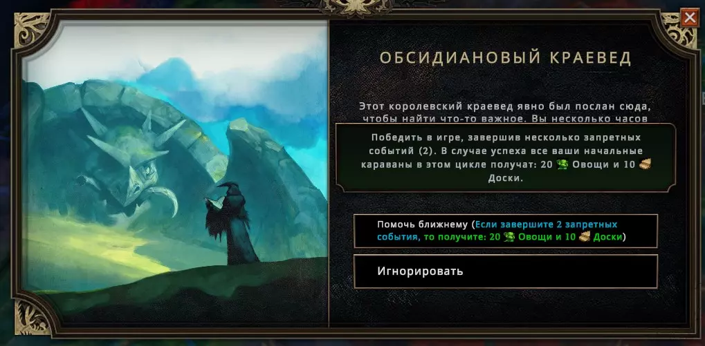 除了生物群系外,你还会遇到各种修饰符。它们会在你成功占领定居点后提供额外资源(包括 artifacts和equipment)。修饰符有正面效果的,也有负面效果的。 提前剧透一下:你必须至少体验所有修饰符一次。所以如果某个修饰符的效果描述看起来不会让游戏变得过于困难,那就大胆去收集它们吧。我特别建议将它们建在尽可能靠近市中心的位置,这样在必要时,你就能以最小的难度应对某个麻烦的修正器。 事件: 事件与修正器类似,但你的定居点会正好位于感叹号标记的位置。它通常不会直接影响生物群系的条件,一般会要求你赢得游戏并额外完成一些任务,如下方截图所示。