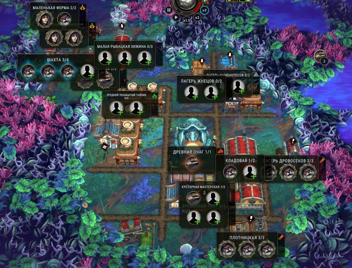 营地可以随意拖动且无需付费,因此无需建造10个相同的营地。单独说明一下伐木工营地:在这里可以设置伐木工砍伐特定种类的树木,或者让他们依次砍伐所有树木,但不会开辟空地。具体选择哪种方式完全取决于您的喜好。 小技巧:点击特定营地后,屏幕上会高亮显示该营地可以收集的所有资源。如果你开垦了许多空地,又担心遗漏了某些资源——请记住这一点。 菜园: 看到肥沃的土地就建造菜园。菜园的耕种需要特定的建筑:农场、花园等。它们的运作方式相同,分为三个阶段:风暴期间施肥,细雨期间播种,及时在“光时”收获。如果你在“光时”期间建造农场,那么你的工人会一直无所事事,直到风暴来临。当一座建筑与带有农场的菜园重叠时,工人会优先处理他们首先看到的东西,遗憾的是这里没有相关设置。唯一的设置是,你可以选择需要种植的作物和不需要种植的作物。 贸易站:会有商人定期前来,向你提供各种资源、建筑图纸和增益效果。所有物品都需要付费购买,但不一定必须使用金币。有时候在游戏开始时,如果我看到非常需要的增益效果或蓝图,我可以卖掉几个多余的齿轮和一些火焰精华,这样就能多赚十几枚金币。 你可以攻击商人并从他那里抢夺很多物品。当然,你不会得到他所有的东西,但能获得他原有物品总量的60%左右。在此过程中,你可能会失去两三名居民,而且下一个商人可能在游戏结束前都无法抵达,所以请务必权衡自己的决定。袭击商人也不一定能得到你想要的东西。 此外,贸易站还提供了开辟贸易路线的功能(可在城市升级中找到)。完成贸易路线后,你只能获得金币,无法交易资源。此外,贸易路线还需要干饲料,建议用草药或谷物来制作,反正居民们不会生吃这些东西。 商品销售目录每个季节都会更新,所以别忘了查看这个选项卡。懒得检查也没关系——贸易路线图标上会显示数字,提示你有多少可用的贸易路线选项。如果仓库里没有干饲料,就不会显示任何内容。
