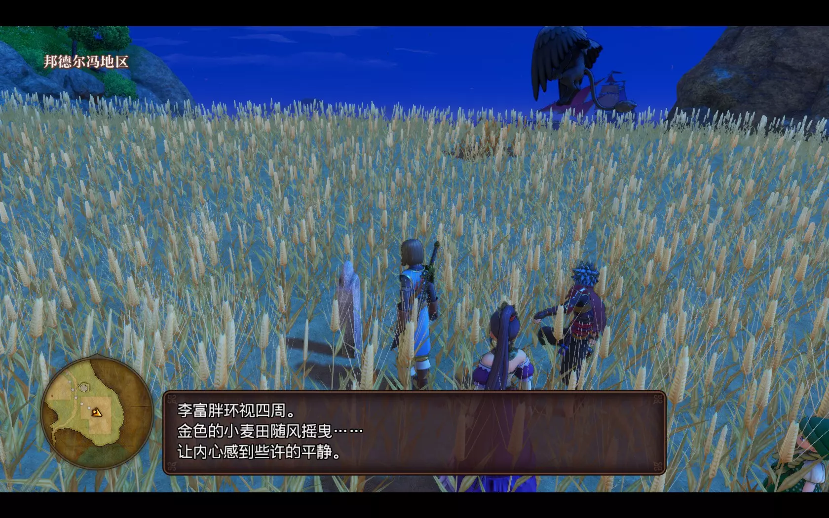 限定时期的隐藏任务:无家可归的少女 溜滑助的秘宝 在“幽灵少女的最后愿望”支线任务中,幽灵少女萝丝想知道溜滑助留下的传说秘宝究竟是什么,于是委托主人公帮忙寻找。随后,主人公一行在邦德尔冯的小麦田中央发现了溜滑助的墓碑,上面刻着: “为追求小徽章而环游世界的我,打从心底热爱的宝物只有两件。一件是金光闪闪的小徽章,另一件则是与之相似的金色小麦田……也就是我故乡邦德尔冯的风景。收集小徽章,就等同于了解世界。在了解世界并正视自我后,我回到了心爱的故乡。——徽章爱好者溜滑助记” 这段文字字里行间都透露出溜滑助对故乡的热爱,这份热爱甚至胜过了任何豪华的宝物和壮丽的风景。