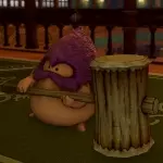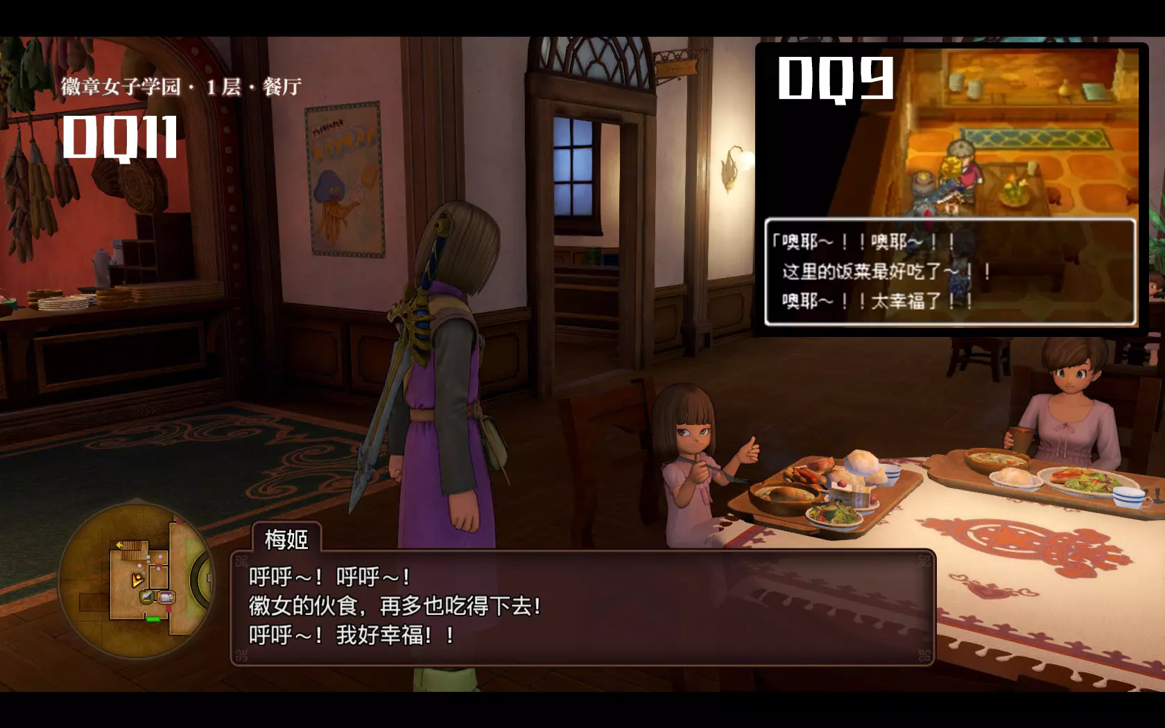 《勇者斗恶龙11》日文版中的“フフィーッ!(呼呼!)” 这是在致敬《勇者斗恶龙9》中艾鲁希昂学院食堂内的干饭男。这位NPC每句对话中都会出现语气词“フフィーッ!”,在《勇者斗恶龙9》中文版中翻译为“噢耶!”。虽然是个没有名字的路人角色,但莫名获得了很高的人气并获封“食堂守护者”的称号。制作人员觉得这个设定很有趣,就把它沿用在了《勇者斗恶龙11》当中。凑巧的是这两位都是餐厅的食客,同样钟爱着美食。特别是夜晚访问徽女餐厅时,梅姬更是直接复现了《勇者斗恶龙9》中的场景。