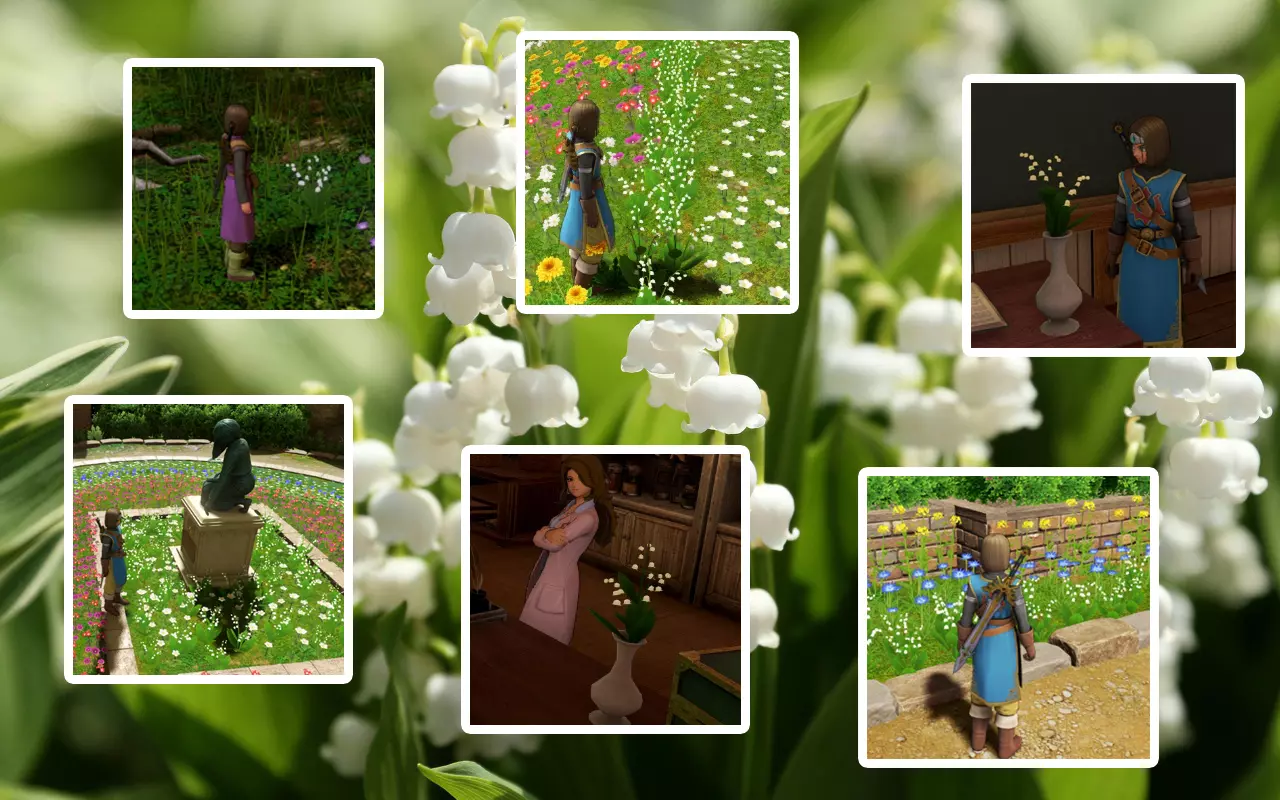 无处不在的铃兰元素 徽女制服 白天学生们身穿的徽女制服为深蓝色的百褶裙套装,搭配红色丝带和平底鞋,显得知性淑女又不失青春气息。看到这些充满朝气的学生,罗不禁回忆起了和妻子在书店见面的场景。 新晋入学的女孩会戴上代表低年级生的帽子。到了晚上,学生们则会换上粉红色的睡裙。 徽女制服与睡裙均由当红设计师卡尔文·尚保罗提(カルバン・ジャンポルテ)设计。这个名字是在致敬《勇者斗恶龙6》中选美大赛的主办人(日文写法相同,在《勇者斗恶龙6》中译作贾博尔特)。其灵感可能来源于时尚品牌卡尔文·克莱因(Calvin Klein)和让-保罗·高缇耶(Jean Paul Gaultier)。校园中只有汉娜身穿改良版的红色长裙徽女制服。不良少女穿长裙的最大实用考量是避免走光,毕竟要是一蹲下就露出内裤,那么无论说多少不良用语来威胁别人,也毫无震慑力可言;短裙在打斗时也会显得很尴尬。虽然有裙内藏武器的说法,但通常不会做到那种程度。 腐烂尸体柯儿特是唯一身穿制服的魔物,不过由于酸液的腐蚀,它的衣服已经破破烂烂,即便到了晚上也不会更换成睡裙。 初次进入学园的维罗妮卡被误认为是前来报名就读的小姑娘。当收到低年级学生的制服时,她十分生气,但转念一想,自己好不容易变年轻了,或许来这里上学也是个不错的选择。在与妹妹重逢后,卡缪在对话中表示希望康复后的玛雅也能来这里读书,虽然知道她不会同意,但他觉得妹妹穿制服一定很适合。 主人公团队的三位生理女性都可装备徽女制服。维罗妮卡穿上后会像低年级学生一样戴着帽子,公主穿上后则是沿用了高跟御姐的设定——黑色高筒袜搭配高跟鞋。 游戏后期可获得传说中的徽女制服,主色调从深蓝色变为了白色,拥有着不俗的防备力和魅力加成。这里的“传说”前缀只说明品质,和稀有度并没有什么关系。只要荷包充裕,传说的徽女制服可以从商店无限量购买,反倒是普通的徽女制服在正常流程中只能获得三件,显得更加稀有。