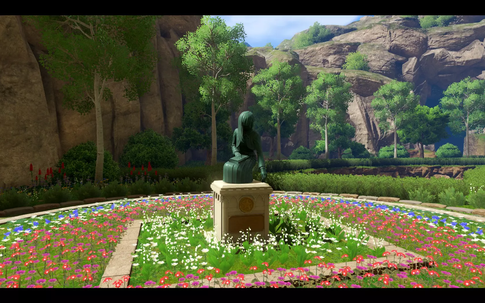 拾徽章少女铜像 “要成为窈窕淑女该怎么做,思考这点时,希望大家能想到的便是小徽章。寻找小徽章时,我们会先展开手头的世界地图。然后思考……要去哪里寻找。我要说的就是关于世界的知识和思考的力量。寻找小徽章的好奇心可以说便是成为窈窕淑女的第一步。了解小徽章,亦即了解世界。仅只是高雅优美,并非成为窈窕淑女的道路。”——《窈窕淑女 萝姿·克罗迪亚语录》 铜像的姿态就是理想的少女姿态。异变前,窈窕淑女社的成员们在操场练习拾小徽章体操。教室后方的黑板上也有此动作的示例图。