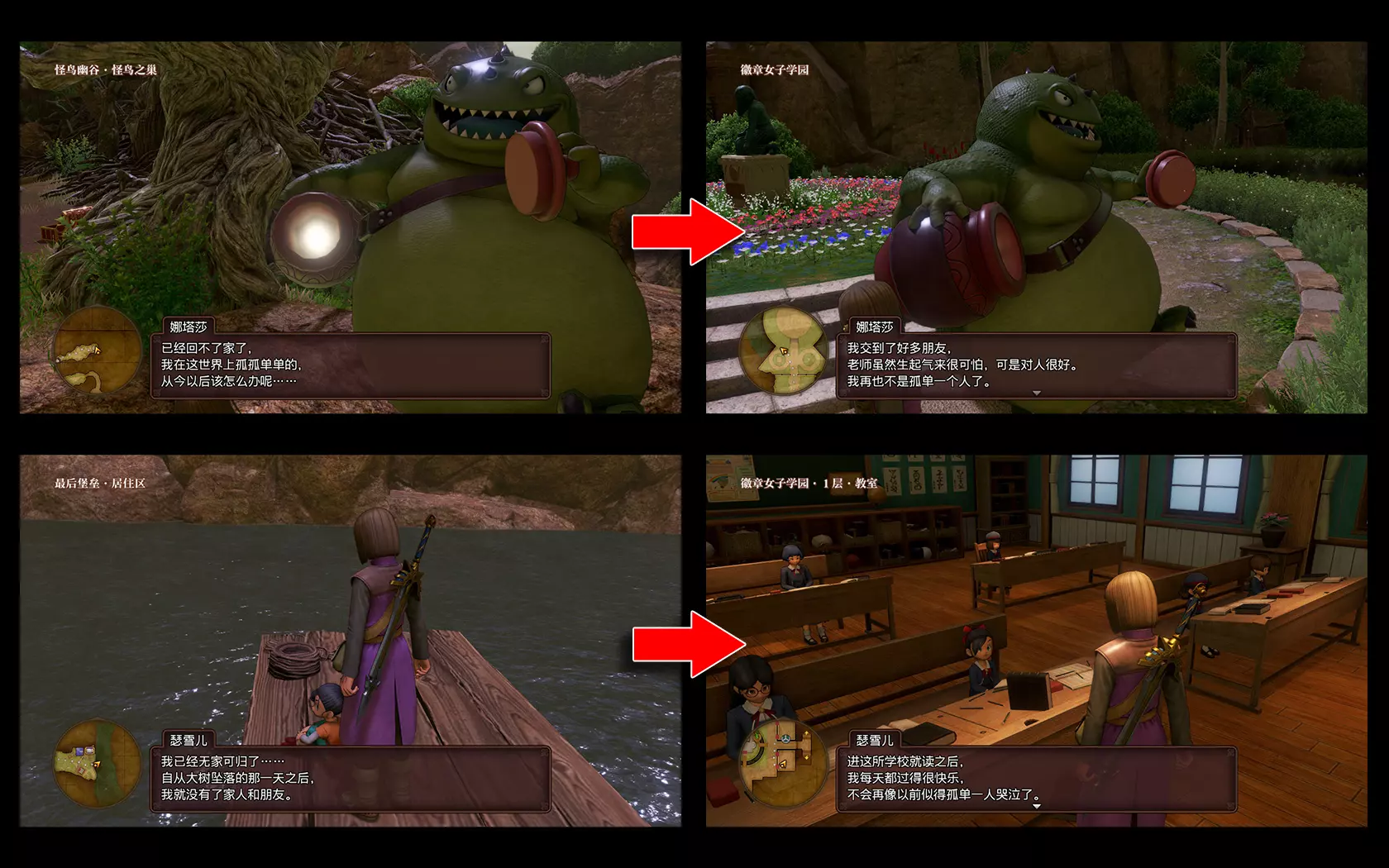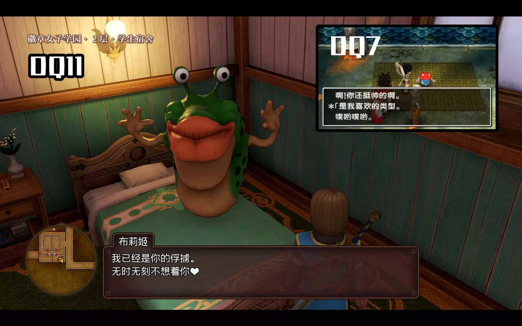 妲莉亚安抚不愿入睡的好友 面对怀慈的土味情话,妲莉亚从不戳破而是积极配合,这也是珍惜美好时光的一种表现吧。 参考资料和致谢 1. DQ维基:http://wikiwiki.jp/dqdic3rd/ 2. Himemomoko的《勇者斗恶龙11》音乐帖:https://bbs.a9vg.com/thread-5312328-1-1.html 3. 关于不良少女长裙的考证来自于B站 astrol(大民) 4. 《勇者斗恶龙11S》日文版截图来自于Youtube うちだのおうち/内田敦子 5. 《勇者斗恶龙9》中文版截图来自于B站 z之树 6. 《勇者斗恶龙7》中文截图来自于B站 乐游诗人 7. 《勇者斗恶龙5》《王宮のトランペット 夜ver.(チェンバロ)》的音乐来自于Youtube A.O.music 写在最后 如果说从校长室能看到整个洛特泽塔西亚,那么从徽女学园就能看到整个《勇者斗恶龙》系列。而《勇者斗恶龙11 寻觅逝去的时光》中耐人寻味的剧情和向前作的致敬不胜枚举,这所小小的校园仅仅是冰山一角。 码了那么多字,并不是在吹捧《勇者斗恶龙11 寻觅逝去的时光》的制作是多么考究,我相信现今市面上的游戏大多都不乏这样的细节描写,只是大部分玩家(或主动或被动地)仅仅是查着攻略风卷残云般推进剧情而忽视了它们的存在罢了。 每次来到徽女学园,走进校门奔向主楼,看着花坛中飘舞的蒲公英和大道上惊起的白鸽,不管心情多么阴郁都会明朗起来。