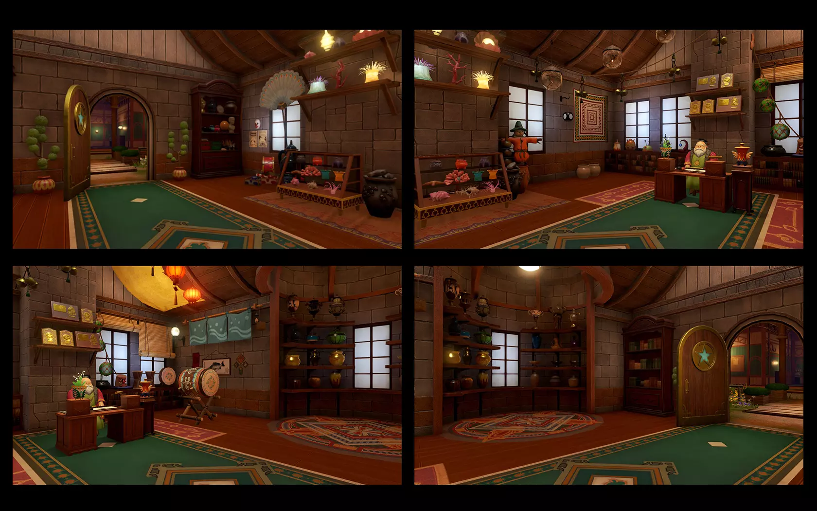 徽女学园校长室外部 校长室内摆放着众多来自世界各地的小物件,称之为整个洛特泽塔西亚大陆文化的缩影也不为过。在这里你可以看到: - 来自萨马迪王国的地毯; - 来自神民村的盆栽和饰品; - 来自马戏团的海报、小丑面具、羽毛扇、小军鼓、杂耍棒和手抛球; - 来自海底王国穆雷亚的珊瑚、贝壳和饰品; - 来自邦德尔冯王国的稻草人; - 来自纳吉姆拿村的吊灯、太鼓和大缸; - 来自杜尔达乡大师宫殿的香炉; - 来自火焰之乡的人形面具和挂帘; - 来自普恰劳村的灯笼和水墨画; - 以及游戏内出现过的各种罐子。