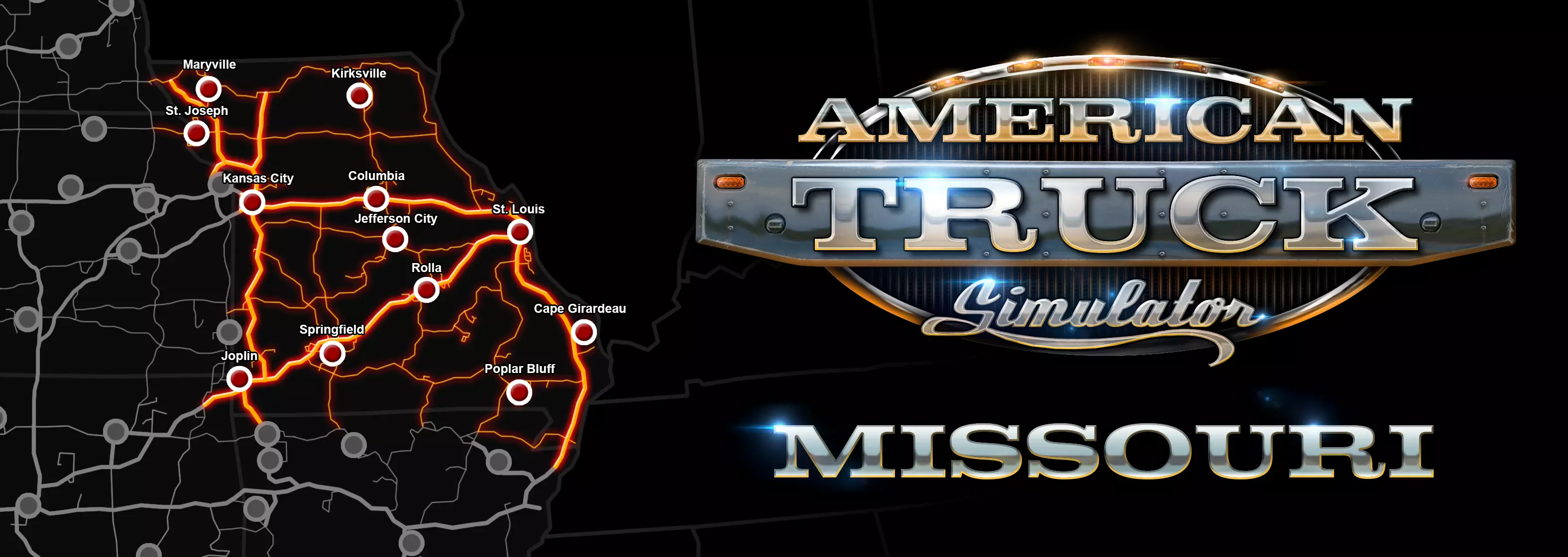 《欧洲卡车模拟2》密苏里州特种运输DLC路线 全新州份——全新挑战! 随着该DLC的推出,将新增数条路线,您可以在这些路线上运输《特种运输》DLC中的重型货物(若您尚未拥有该DLC,可通过以下链接购买): https://store.steampowered.com/app/962750/ 密苏里州将有三条路线: 起点 终点 堪萨斯城 罗拉 开普吉拉多 斯普林菲尔德 圣路易斯 柯克斯维尔 “给我看看”州