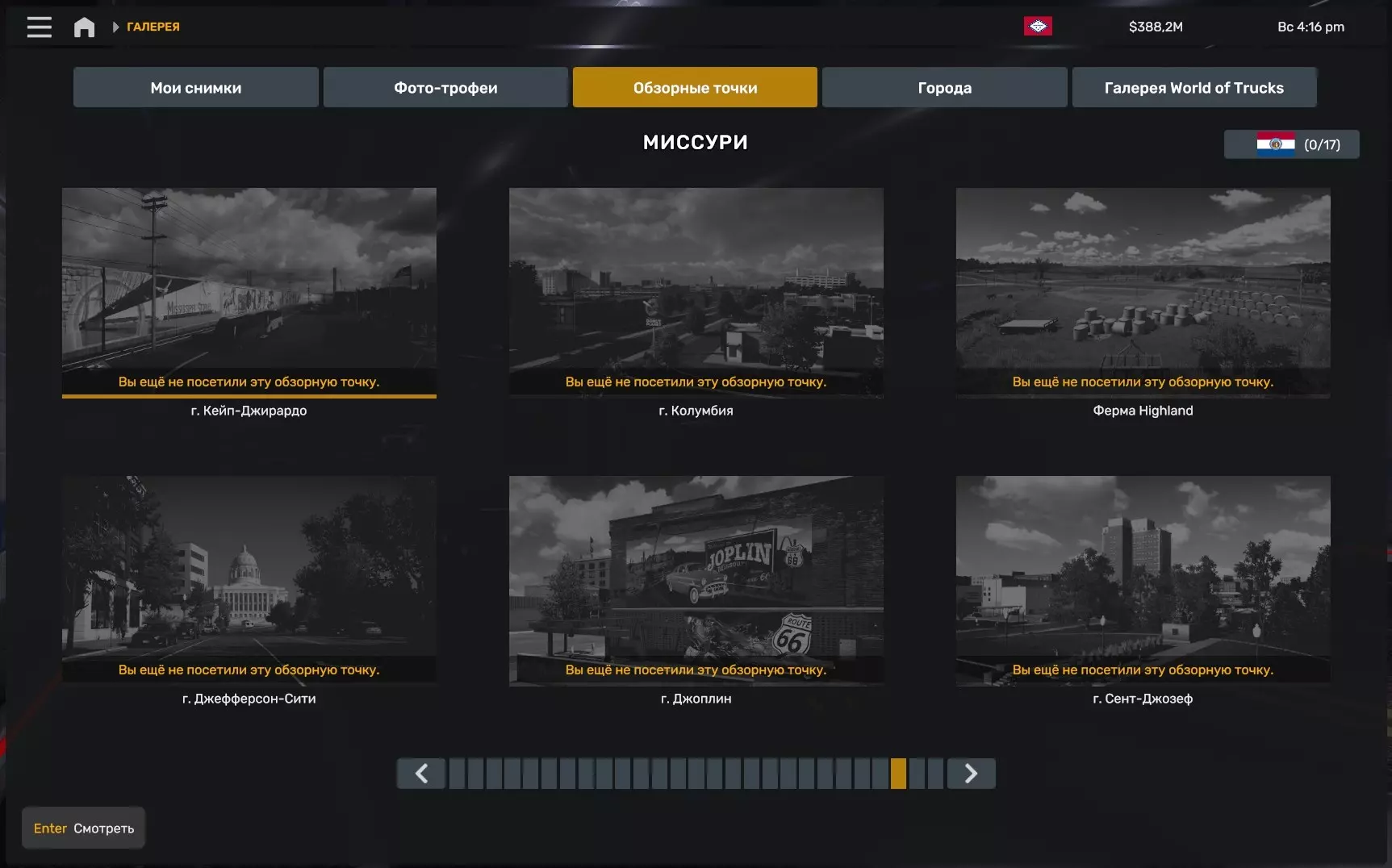 观看密苏里州至少12个景点的过场动画 在密苏里州的道路上行驶时,我们会遇到当地景点的新观察点,要获得成就,需要访问至少12个地点并观看过场动画(总共有17个)。 一个小提示:在1.46补丁中,开发者更新了画廊,现在可以在画廊内查看各个地点的位置。在下方截图中,你可以看到已解锁的包含观察点的页面,以及这些观察点的位置(提示以照片卡片形式呈现,而具体位置需要你自行寻找)。 更新:在1.50版本补丁中,界面发生了一些变化,但画廊功能保持不变。