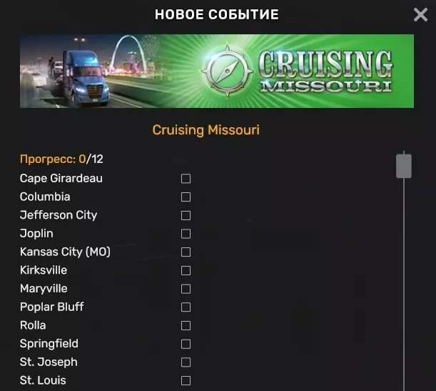 密苏里巡航活动规则: 如果您曾参与过类似活动,那么您应当知道规则并未改变。通过与已连接至World of Trucks的档案进行外部合约(详见上文),您需要完成往返密苏里州12座城市的货物运输。货物可以是任意类型,并且您也可以使用自己的挂车。重要须知:为确保运输任务被记录,货物运输距离必须至少为100英里(若您使用欧洲单位,则约为161公里)。 您的个人目标是完成12次运输,社区总目标为125,000,000英里(201,168,000公里)。您可以在主菜单的顶部面板(1.50补丁更新后的界面中,活动现在可在右上角追踪)查看已完成的运输次数,同时也可在此处承接运输任务。