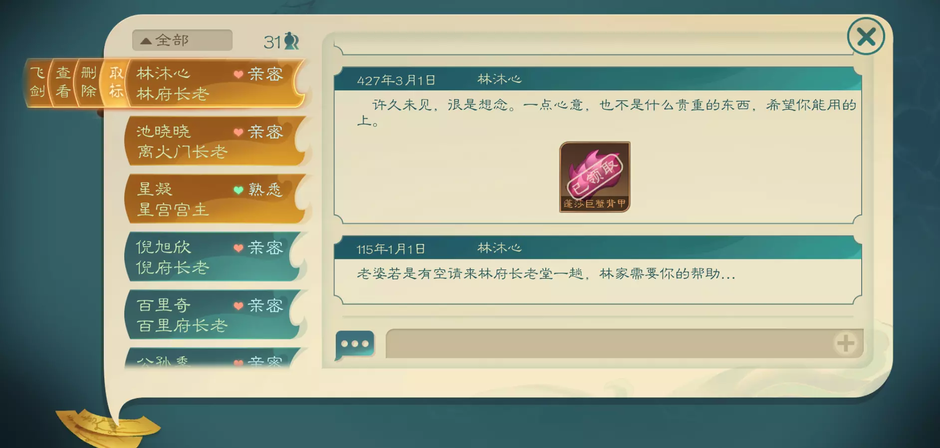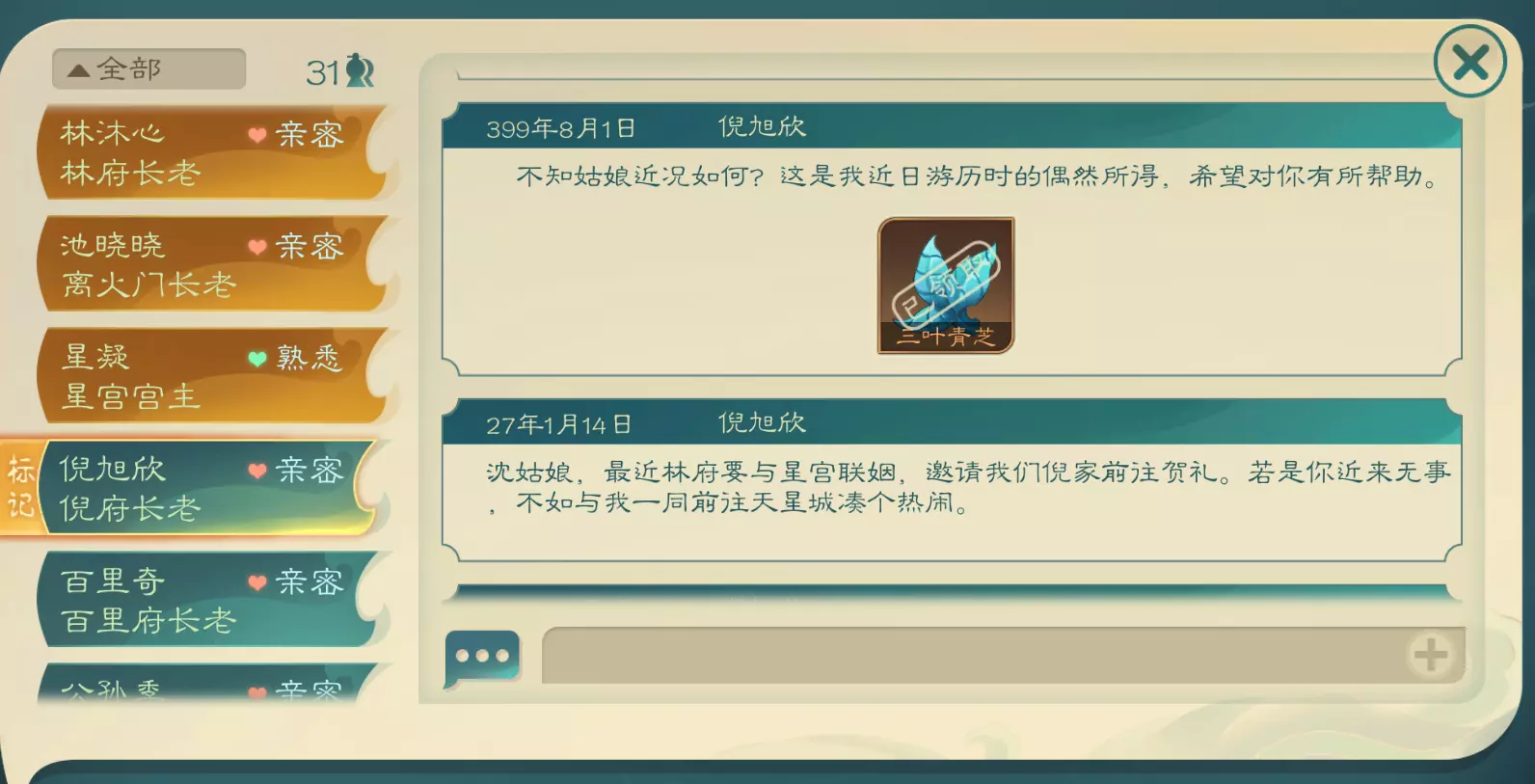 奕星终局:游戏时间第450年接到林沐心的传音符后触发,游戏时间496年过期。操作方法如上。 最后把时间改到自己原本的时间即可。 完美流程需在游戏时间第5年至第23年之间完成“星宫有铃”,40年之前完成“再见星铃”后续任务。 “仙与鸳鸯”中进入林府后和林沐雪交谈!“星冲生魔”要找星铃儿帮忙。最后的“奕星终局”救宫主时不要乱逛,直接到地图高亮点打爆冲到虚散人的头部。 完结。 教程到此结束。