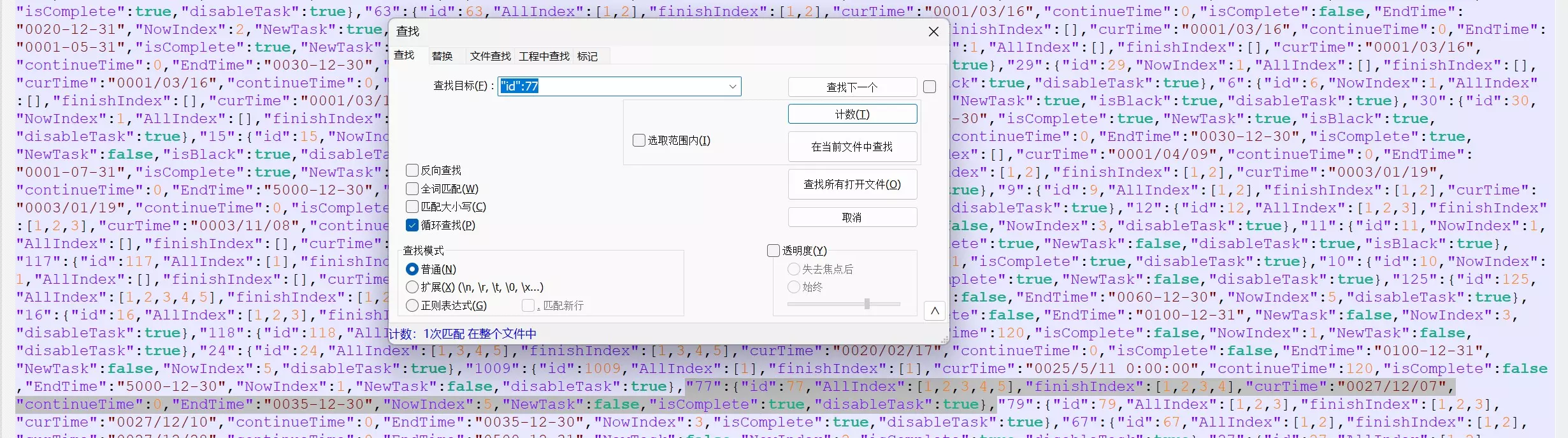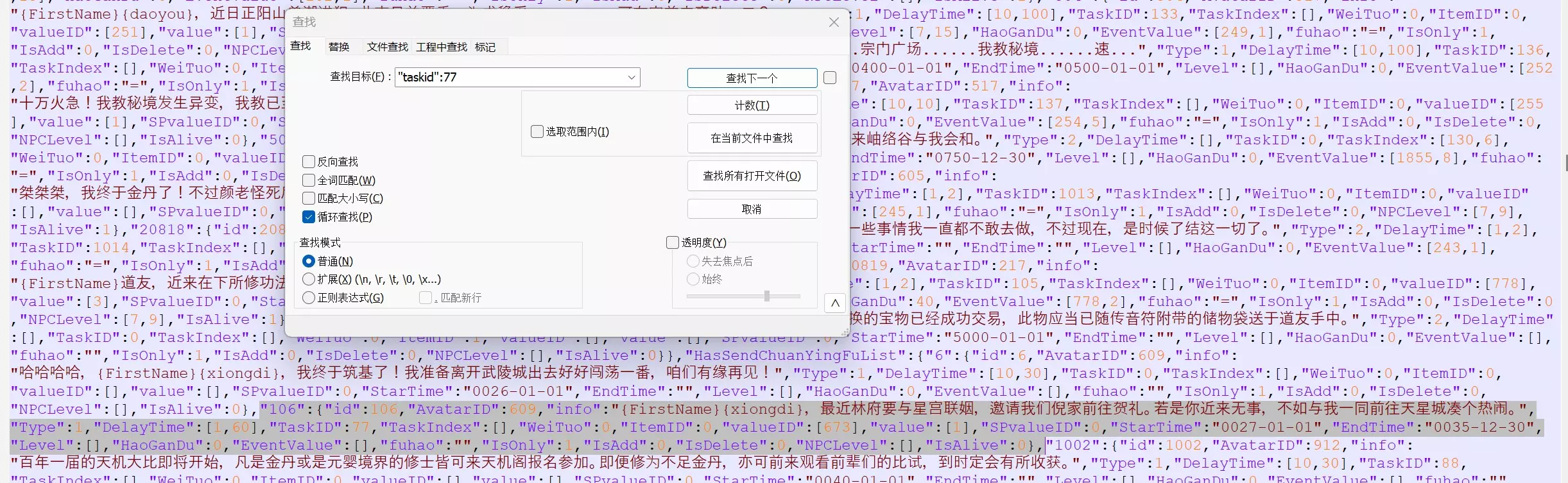 别告诉我你从来没有按F5快速存档过!!! 进入后我们会发现有个Avatar.json文件,这就是我们要修改的文件。 第二步:修改文档 准备工具:notepad++。要是不想下载的话,用系统自带的记事本也完全可以,就是有点费眼XD。原理是删除传音符中的内容,这样穿越时空后林二就会重新给你发一遍微信消息^ ^。 “taskid\":77”和“id\":77”“id\":79”对应“仙与鸳鸯”;“taskid\":83”和“id\":83”对应“星冲生魔”;“taskid\":86”和“id\":86”对应“弈星终局”。 我们先查找(快捷键Ctrl + F):"taskid\":77,找到整个事件所对应的事件id,从“106”开始选中到最后的逗号,也就是下一个事件id之前,注意不要误删其他事件内容(;′⌒`)。