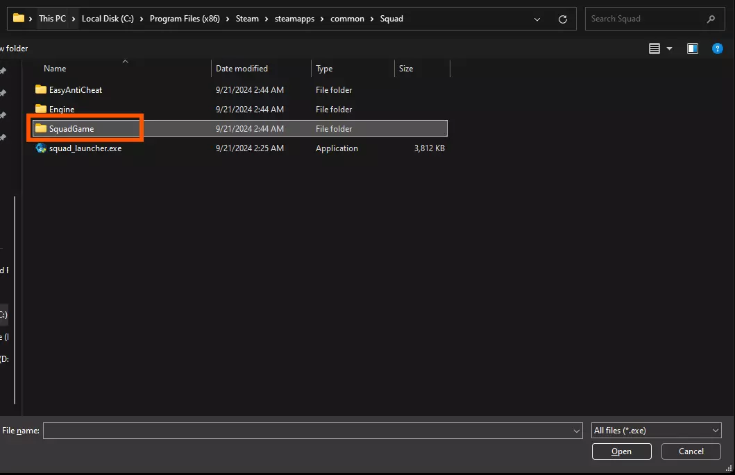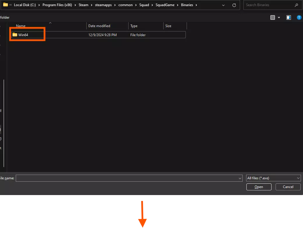 添加另一个程序。这次,导航至“SquadGame”文件夹(与之前相同的目录),然后进入Binaries -> Win64。