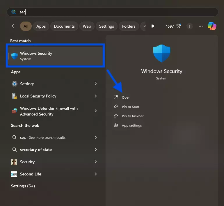 从搜索栏打开Windows安全中心