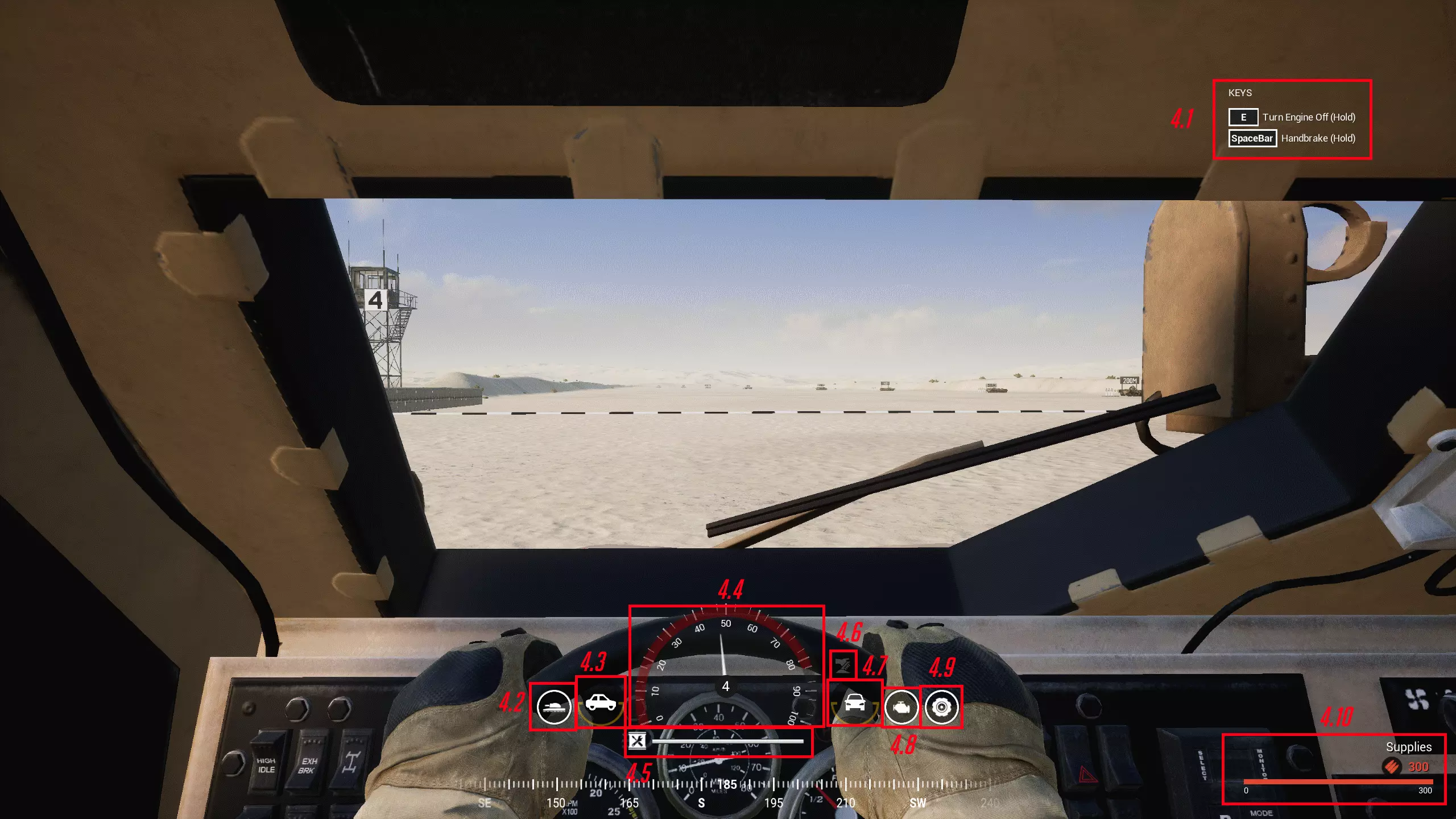 4.1 按键提示 4.2 装甲状态 4.3 载具俯仰角度(前倾/后仰) 4.4 速度表与当前挡位 按住Shift键可保持当前挡位。 4.5 载具整体状态 4.6 手刹指示灯 4.7 载具侧倾角度 4.8 发动机状态 4.9 轮胎状态 4.10 载具运输资源显示 5. 控制台按下键盘上的 ~ / ё 键可打开控制台,控制台字符串显示在屏幕底部,再次按下该键可将控制台全屏显示,同时也会显示日志。