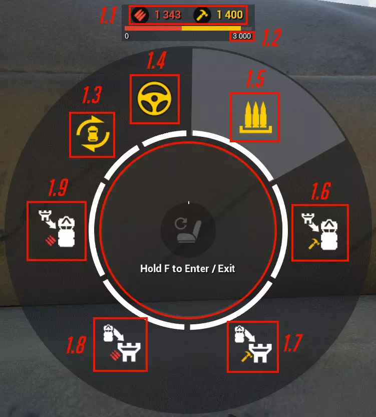 3.1 您所在区域的信息会显示枢纽是否处于激活状态、资源数量以及区域状态。若区域呈红色,那么在环形计时器结束后,该区域将会烧毁(消失)。 3.2 您所在触发点的信息会显示当前该触发点属于哪个阵营以及占领进度。 3.3 您所查看的玩家昵称,仅显示队友信息。 3.4 此处将显示发言者及其所在语音频道。 3.5 指南针。 3.6 指南针上的“火力查理”标记,测试版标记外观相同,但为紫色;小队标记为绿色,其下方会显示到该标记的距离。 3.7 你的耐力值。它的值越小,手中的武器抖动就越厉害。接近敌方可能的位置时,最好积攒它,不要奔跑,而是步行移动,这样在突然交火时,武器的抖动就不会妨碍你。 3.8 你的武器名称、其配件、射程、射击模式、弹匣数量以及弹匣中大致的子弹数量。 3.9. 角色状态显示(坐、躺或站立),若该指示器呈橙色闪烁,则表示角色正在流血。 4. 载具界面。