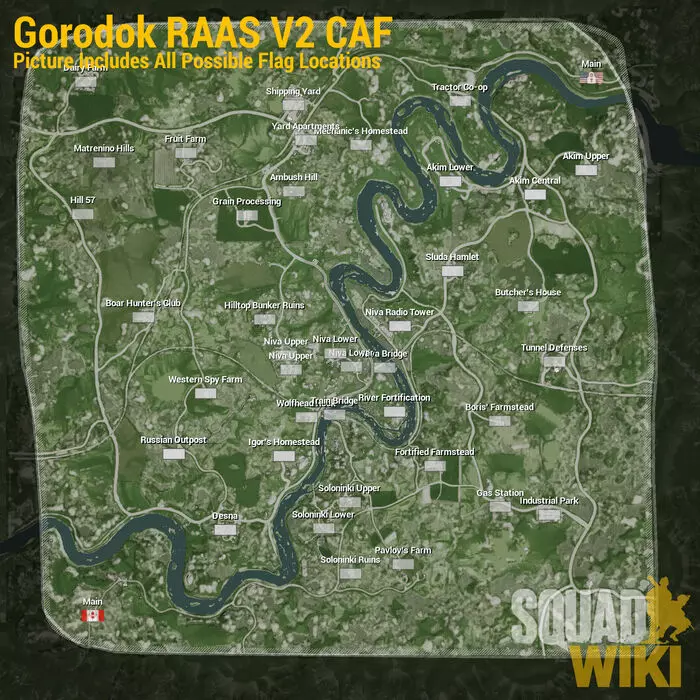 这是“小镇”地图上非常常见的点位布局,这里没有一个争夺点,而是直接有两个。在拥有两个位置相近的争夺点的地图上,很少会有精彩的对局,通常由于这些点位位置接近,其中一方会直接占领两个点,这导致对方队伍彻底崩溃,夺回这些点位的机会微乎其微。随机攻防战(RAAS)是继AAS之后第二受欢迎的模式。服务器满员时的平均时长为40-50分钟。 本质上,该模式与AAS相同,只是所有据点均为随机生成。并且在许多服务器中还启用了战争迷雾,仅显示下一个当前据点,而非全部据点。因此,如果你在游玩RAAS时能看到所有据点,说明该服务器的战争迷雾功能已被关闭。