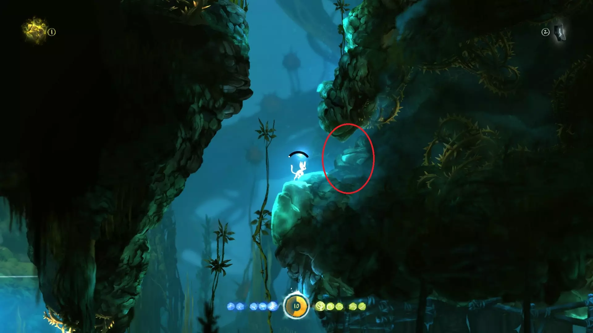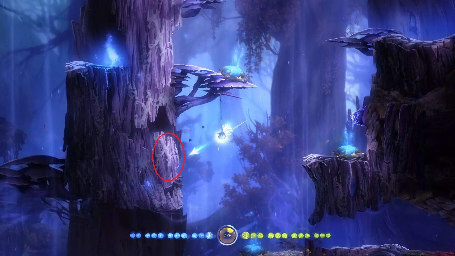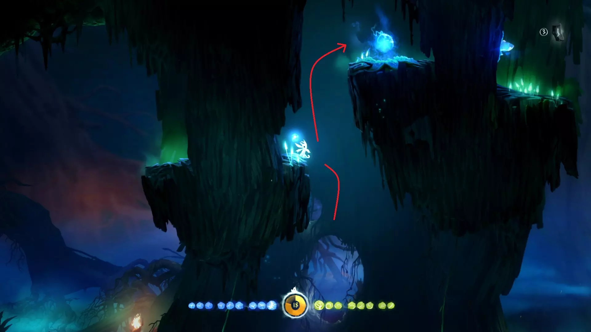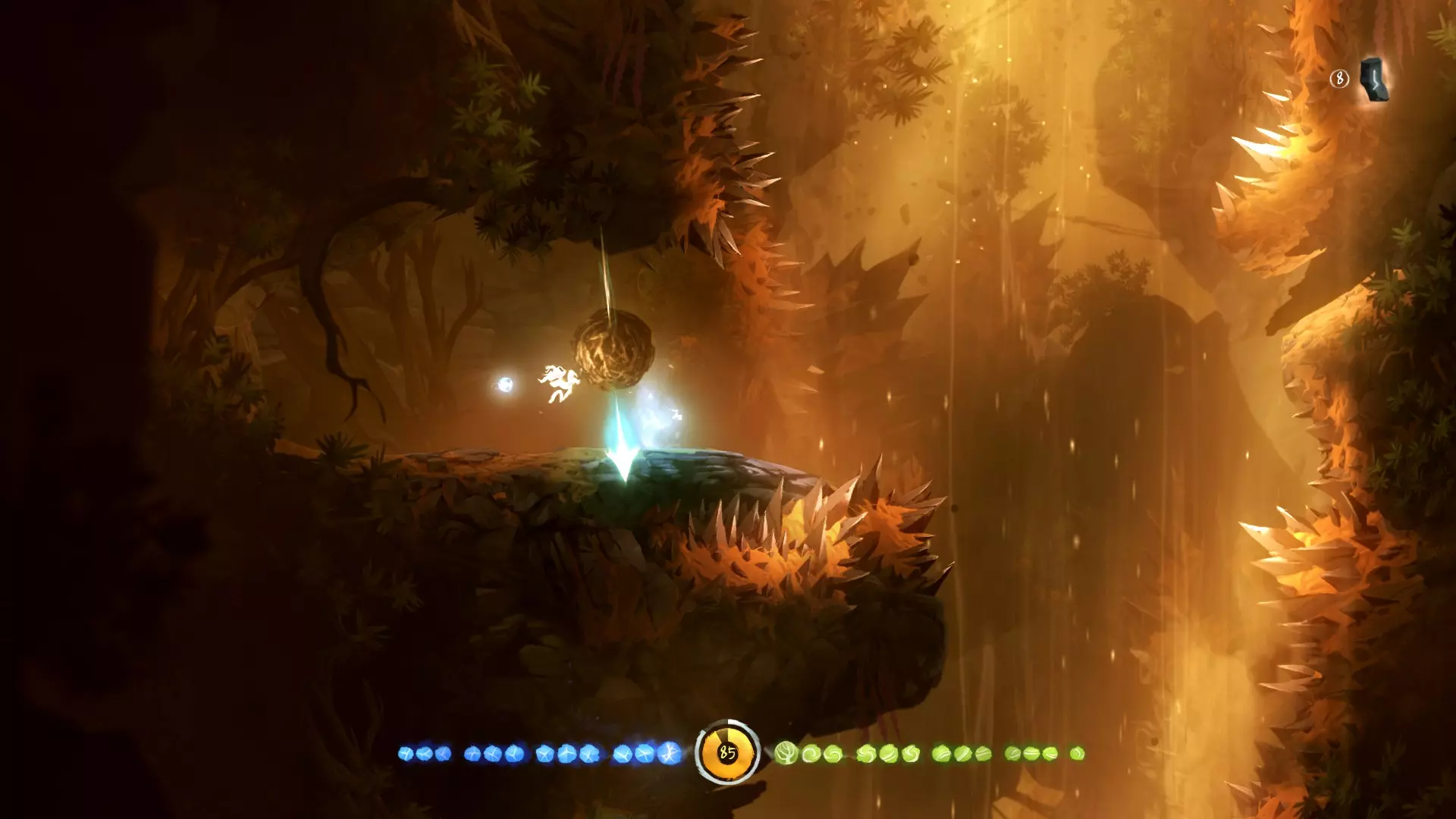 允许奥日像投掷手榴弹那样扔出一个蓝色能量球,该能量球在落地或碰到物体后便会炸开。使用时需先划定抛物线,随后蓄力、摆臂并抛出! 整个地图中存在部分收集品和解谜内容需要运用此能力。