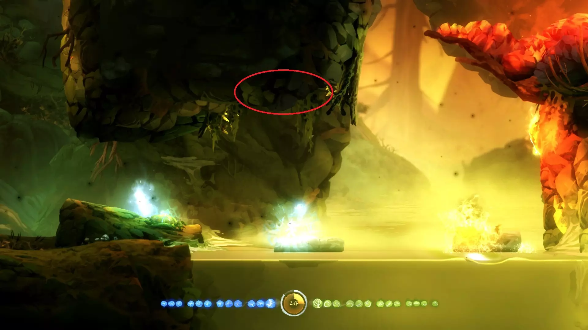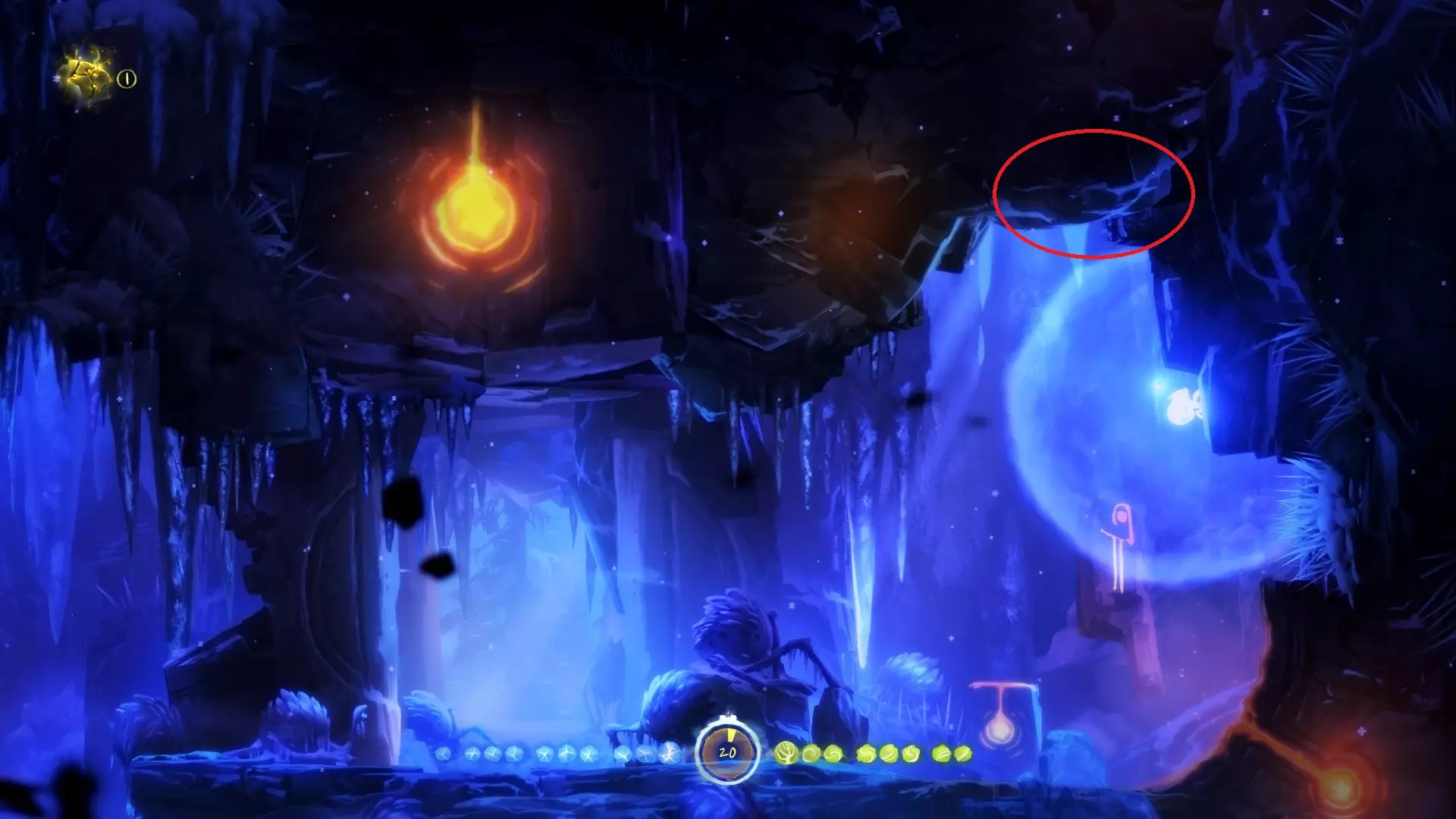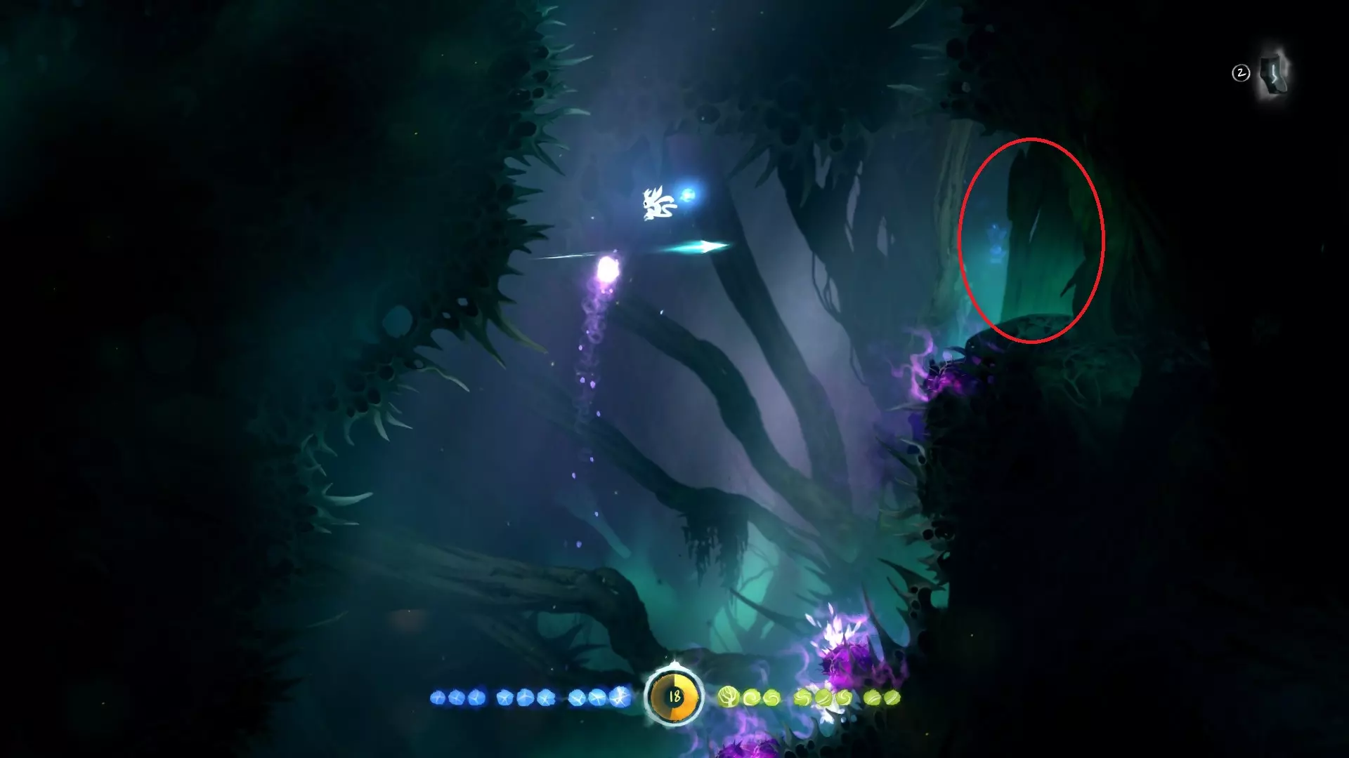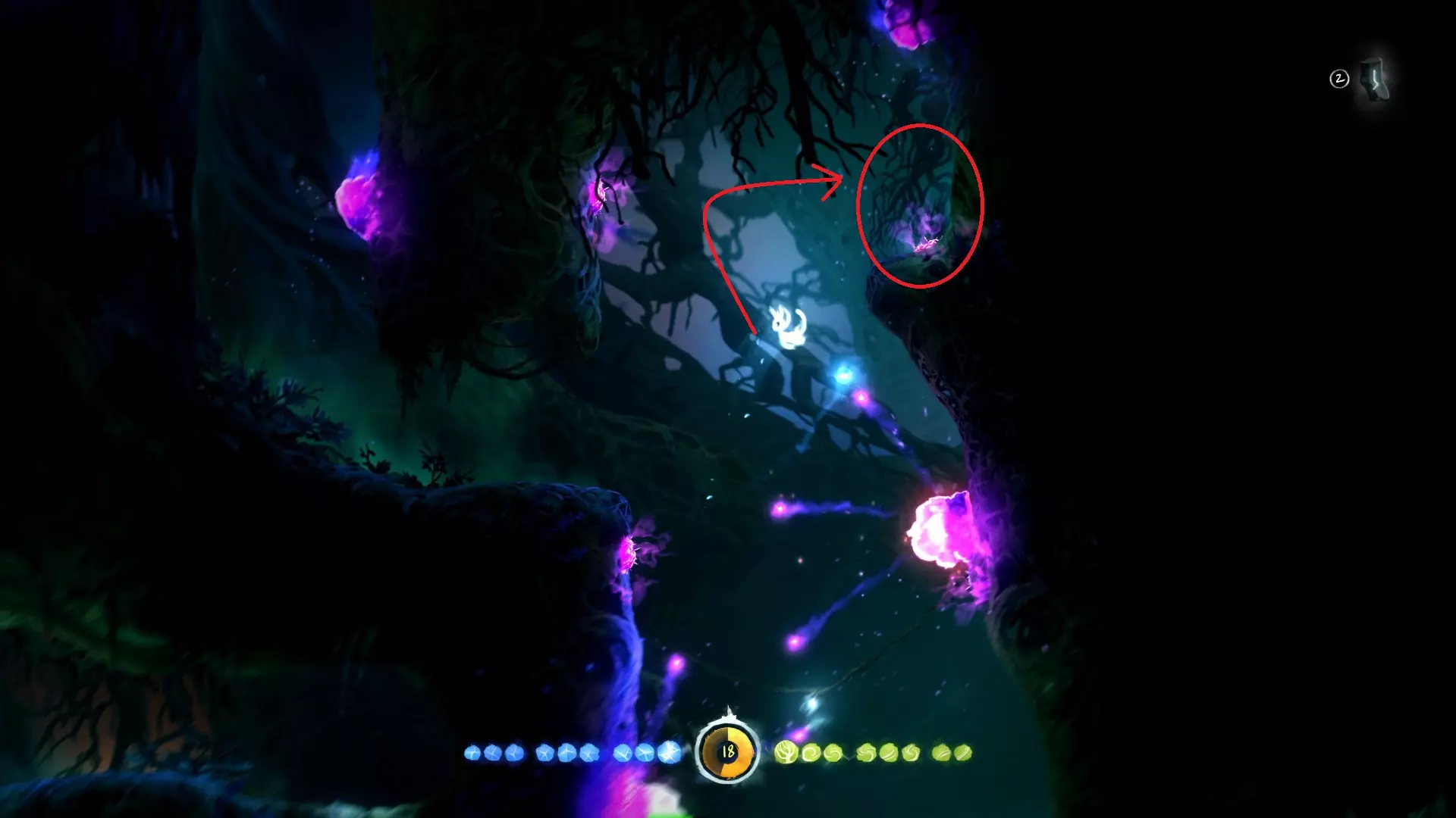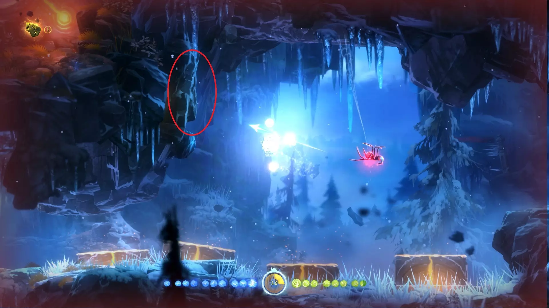 允许奥日像投掷手榴弹那样扔出一个蓝色能量球,该能量球在落地或碰到物体后便会炸开。使用时需先划定抛物线,随后蓄力、摆臂并抛出! 整个地图中存在部分收集品和解谜内容需要运用此能力。