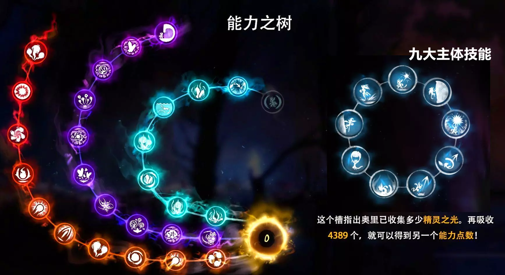 【士国无双】成就。整个技能树全部点亮后获得 点满功效共需要15点能力值,点满效率需要17点能力值,点满攻击需要18点能力值。也就是说点满所有需要50点能力值,而全图只有33个技能核心,意味着剩下17个技能点需要你打怪和收集精灵之光获得,假如你想一个存档搞定的话。 ===全要素收集之生命&能量&42个隐藏跳点=== 相关成就如下: