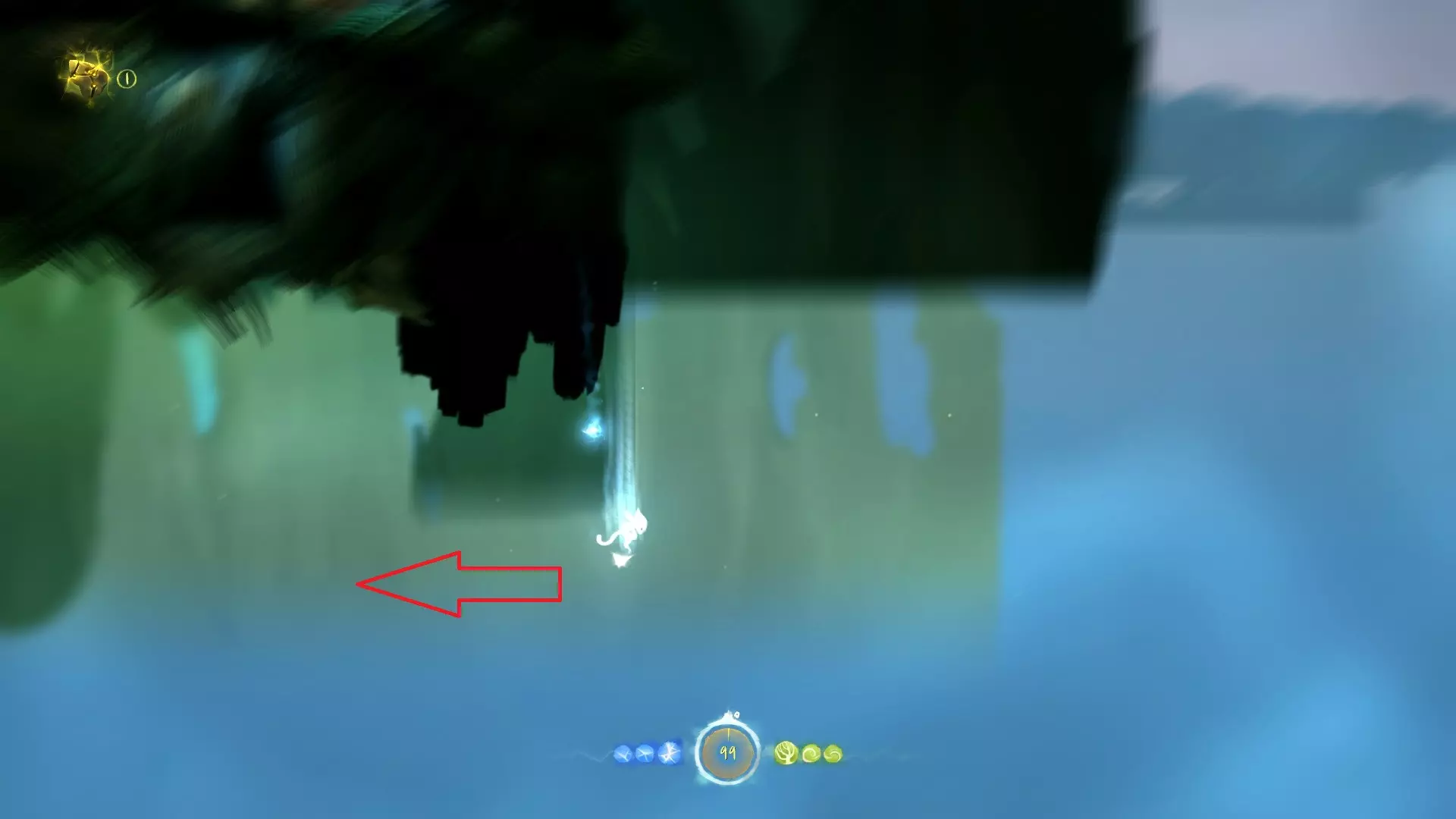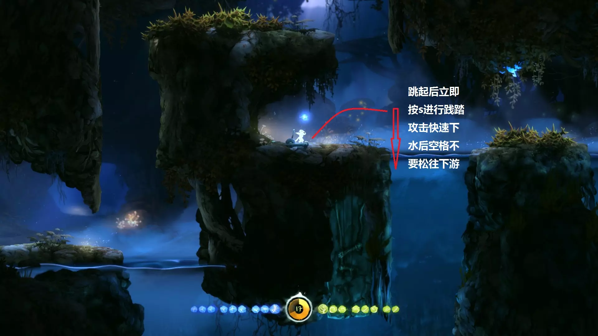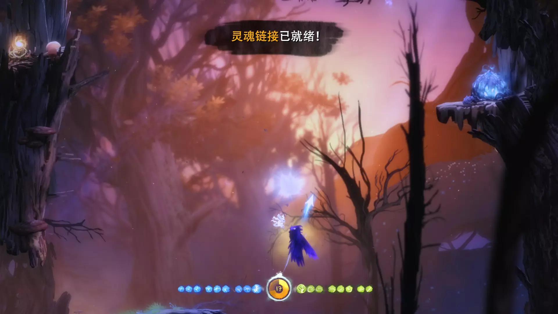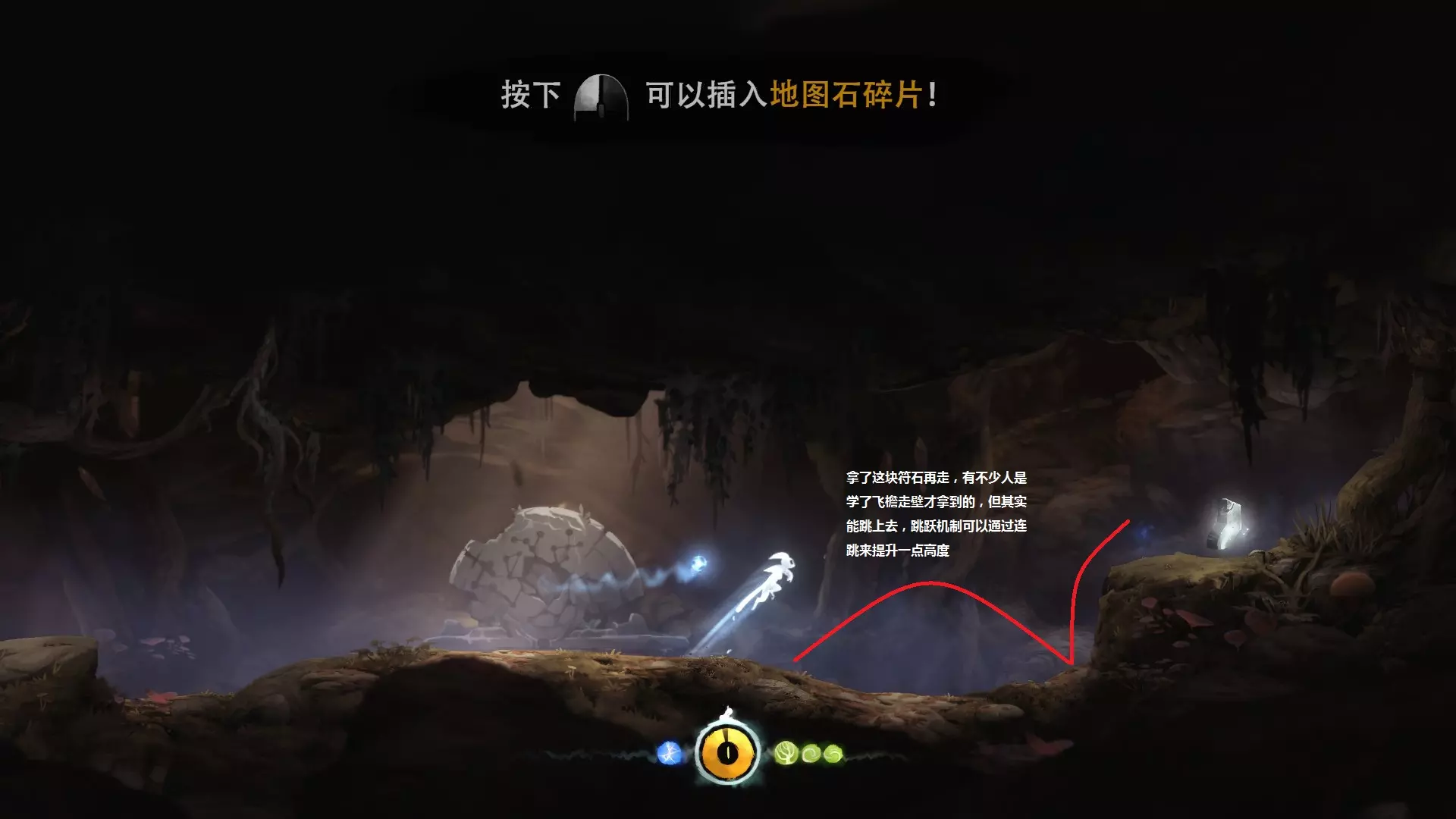 2. **新的技能 - 冲刺** 冲刺可以让奥里(Ori)在地面上瞬间移动一段距离,能够大大缩短跑路时间。