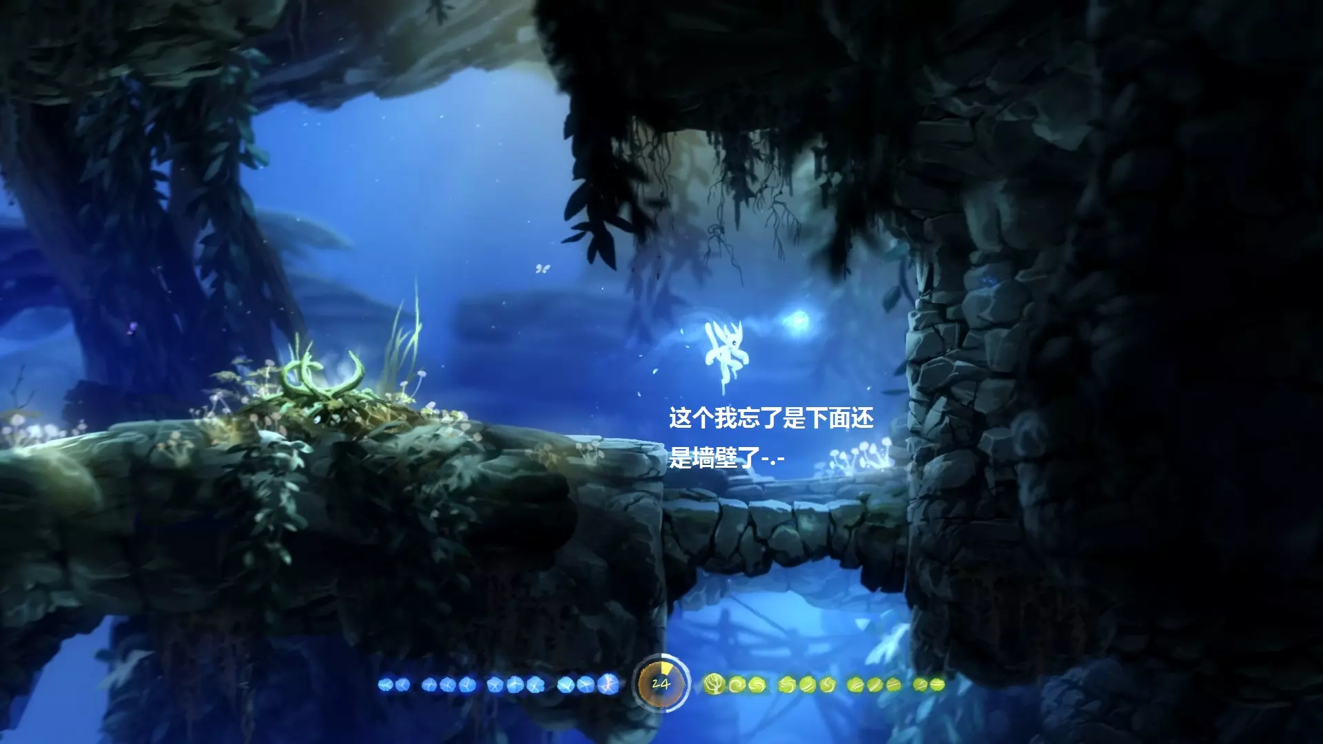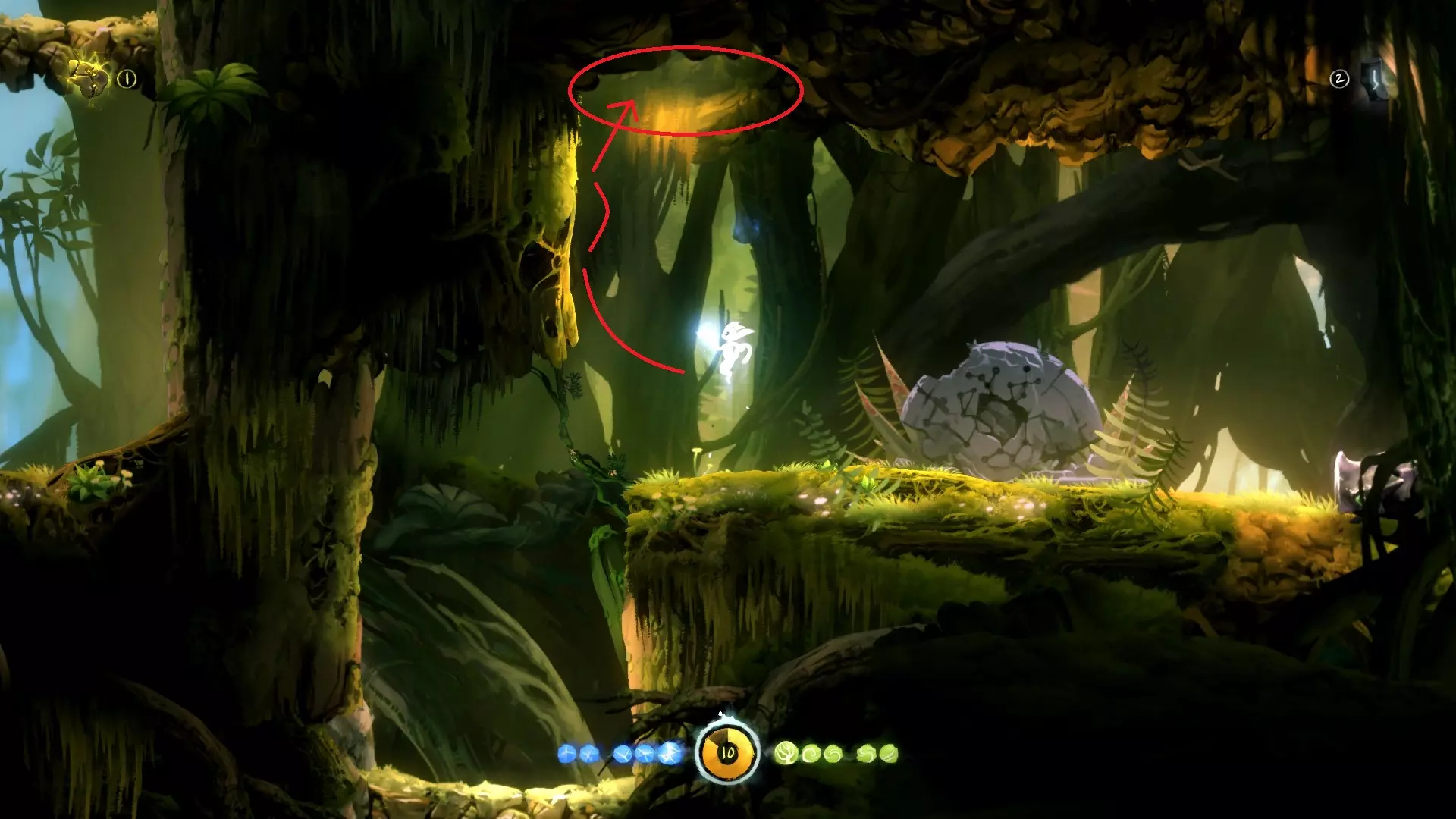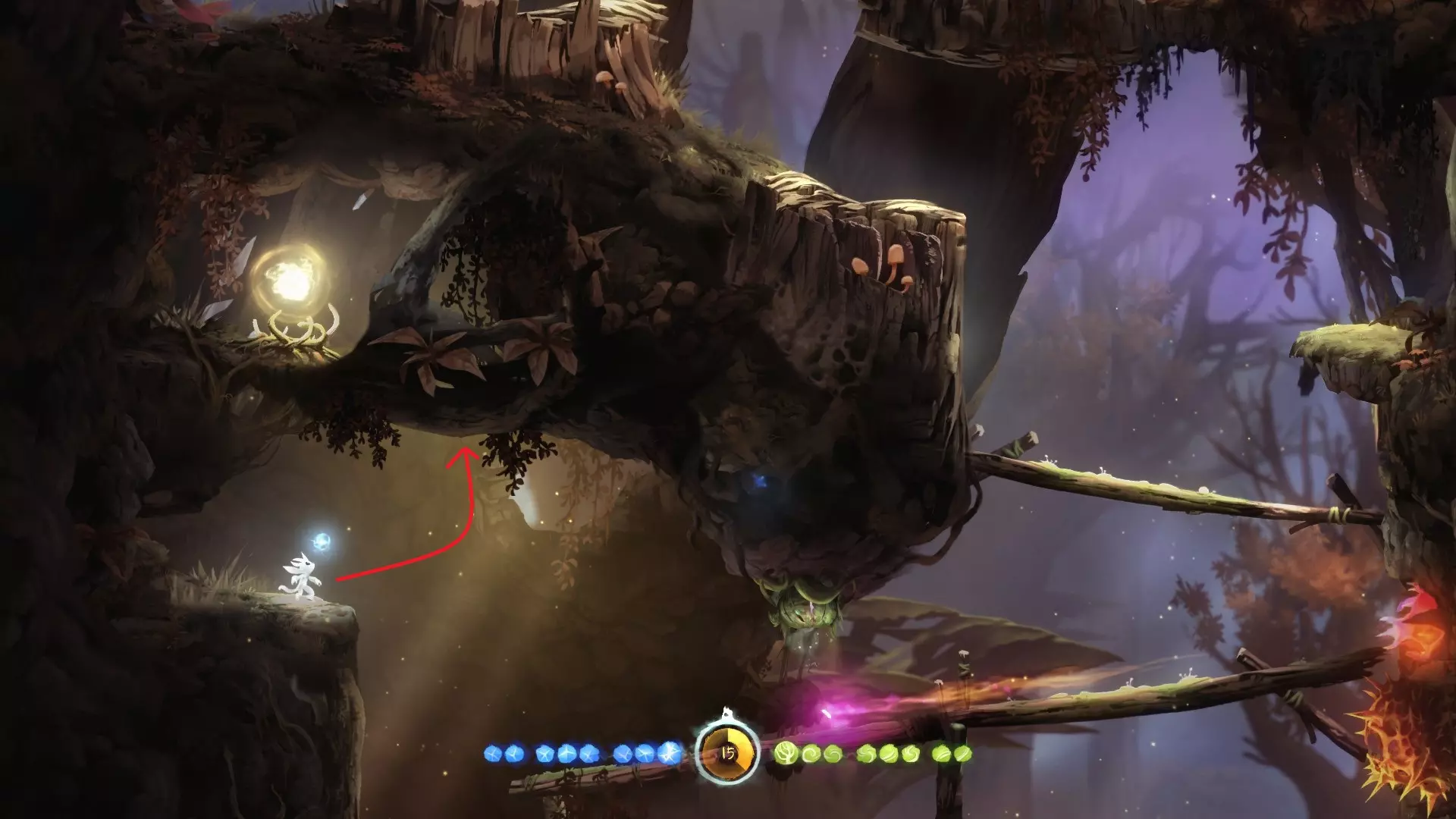 2. **新的技能 - 冲刺** 冲刺可以让奥里(Ori)在地面上瞬间移动一段距离,能够大大缩短跑路时间。