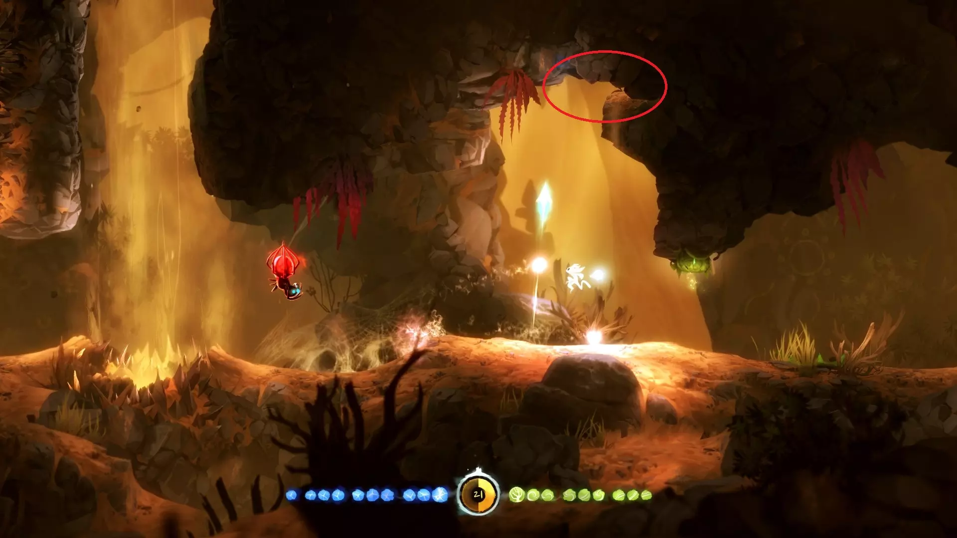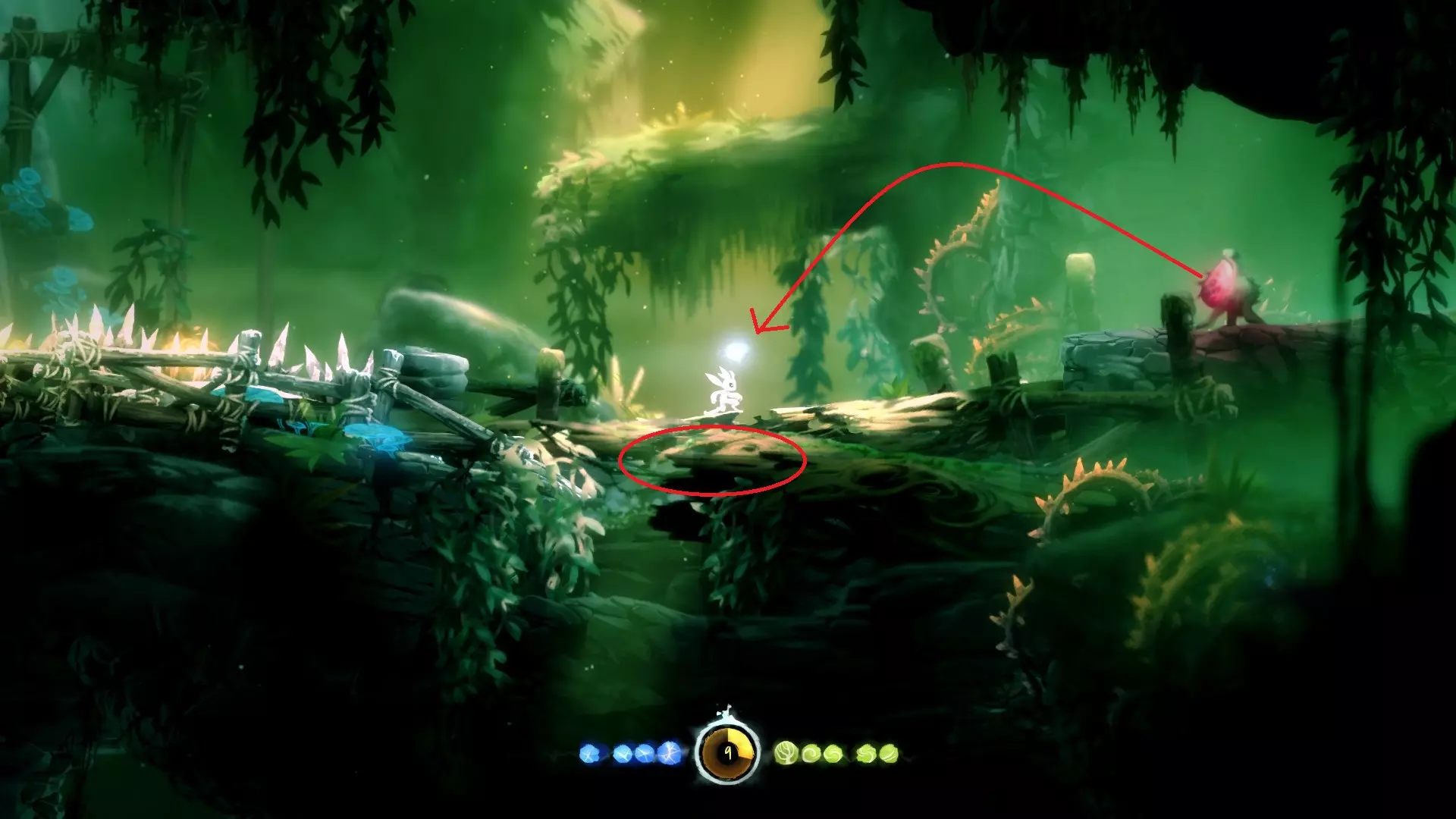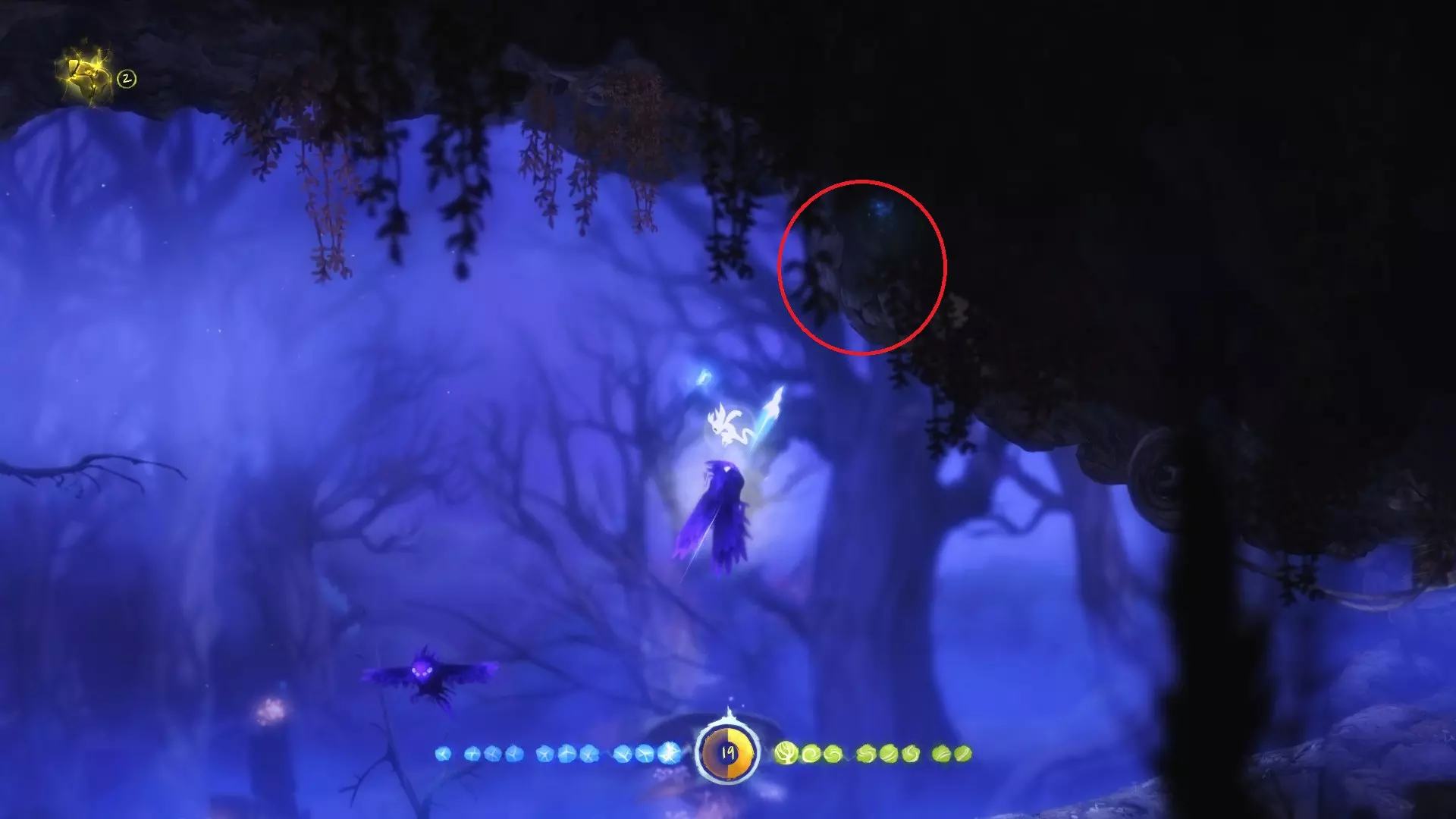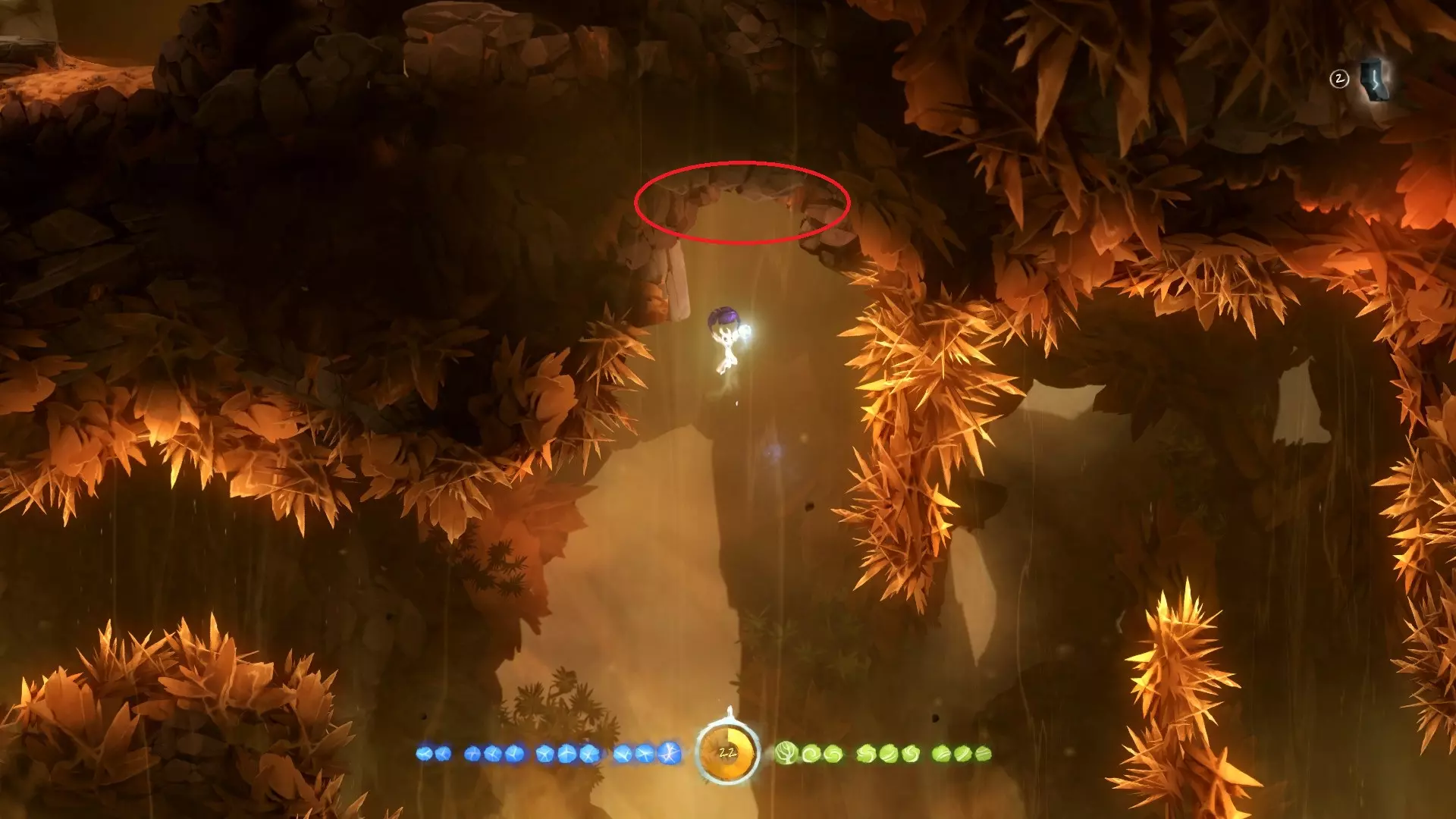 2. **新的技能 - 冲刺** 冲刺可以让奥里(Ori)在地面上瞬间移动一段距离,能够大大缩短跑路时间。