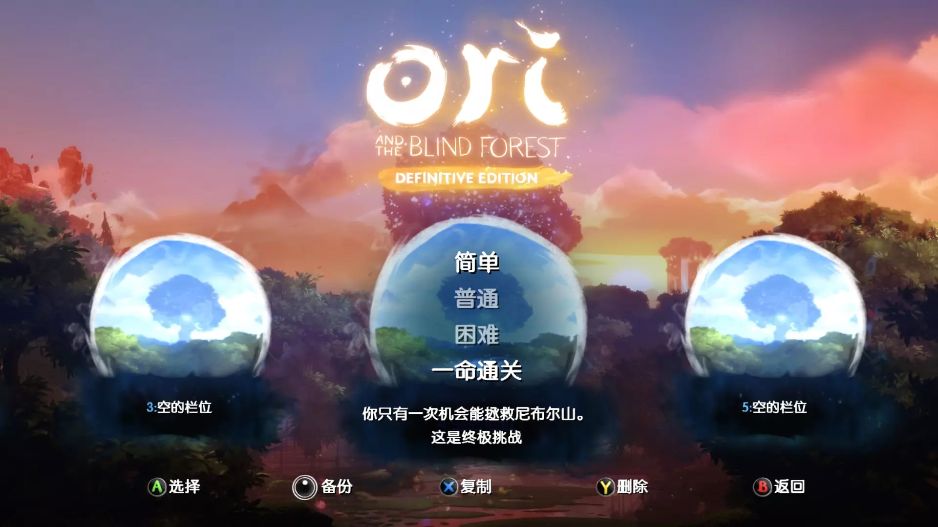 最后再重申一次,我不支持这种做法。毕竟别人用20个小时来熟悉摸索的成就,和你15分钟就轻而易举拿到的感觉是完全不同的。就讲到这,各取所需。 《奥日与黑暗森林》终极版 终极版在完美的原版基础上又做了一次升华,深蓝的主题界面变为秋黄,背景乐也更动人,另新增了游戏内容。