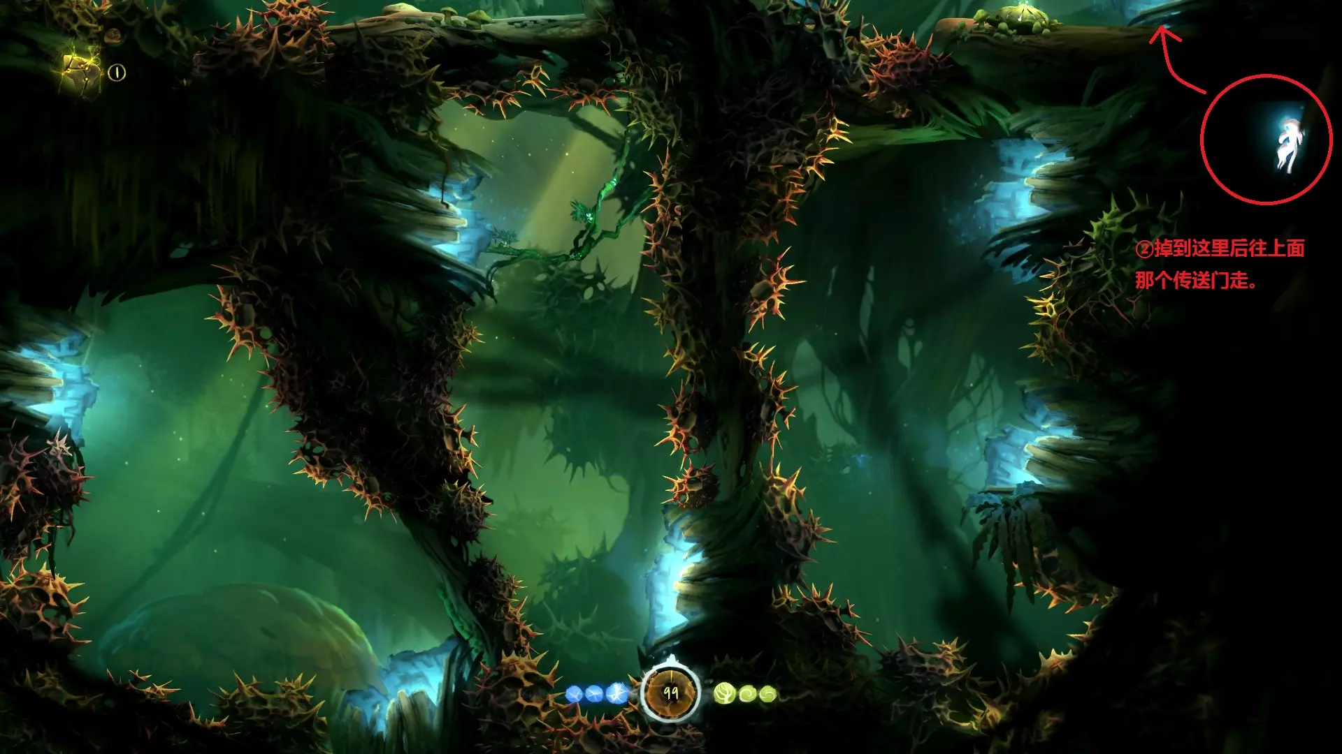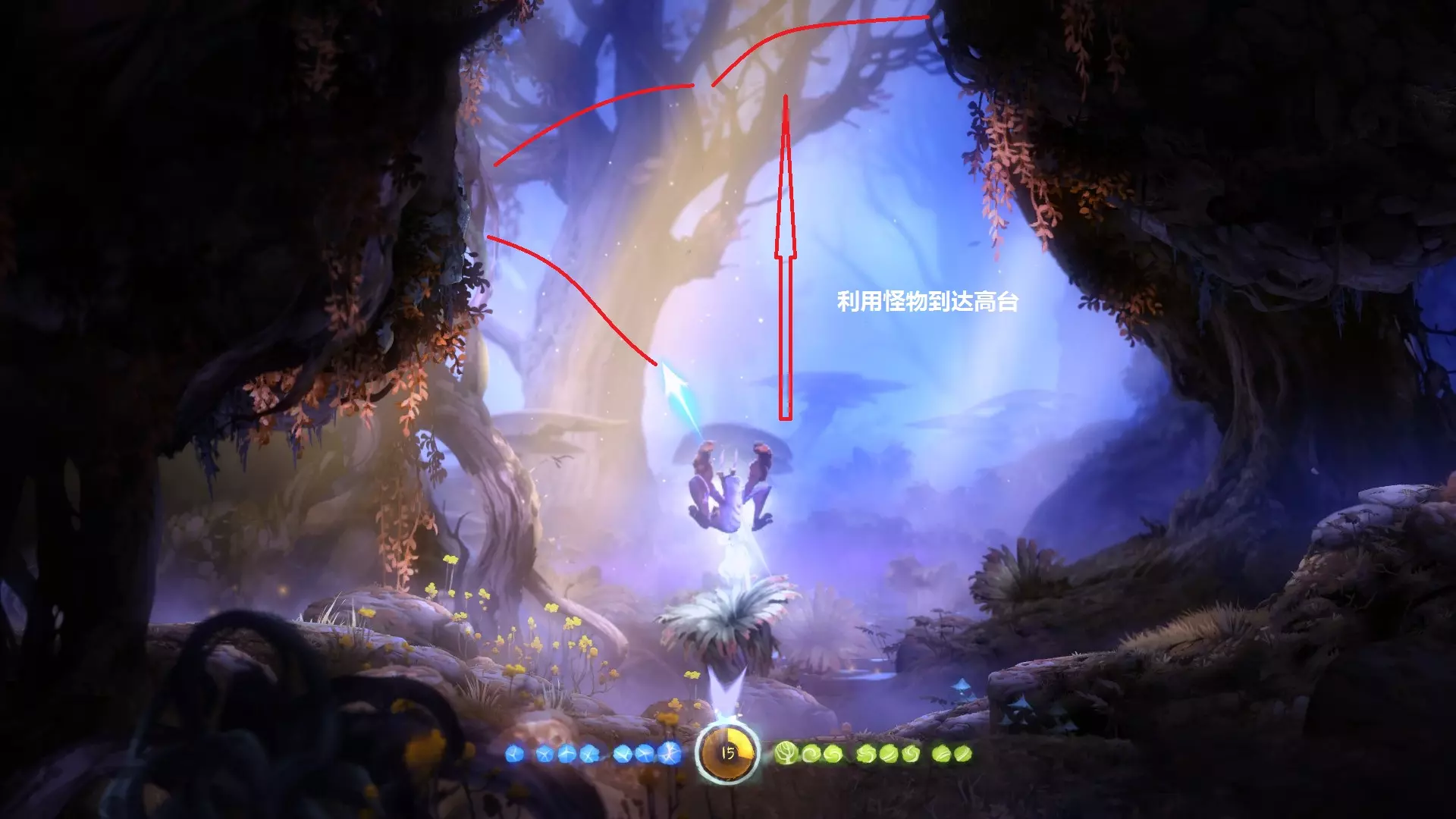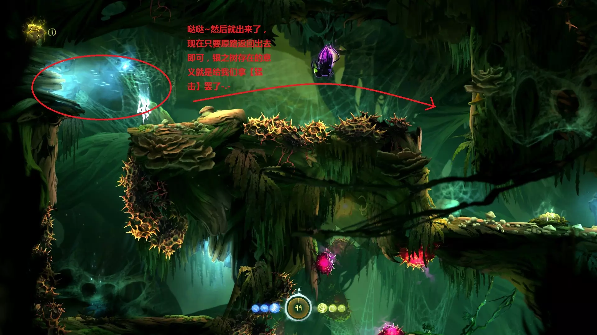 8.到达银树的目的,是为了学习【猛击】,也就是说拿到猛击后就可以离开,无需继续向上。此处省略获取【猛击】的正常流程。 9.第二个重点是关于如何返回,我们需要利用一个漏洞才能回到银之树的顶端,具体方法如下。