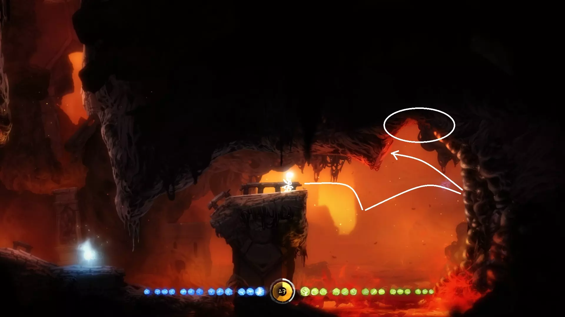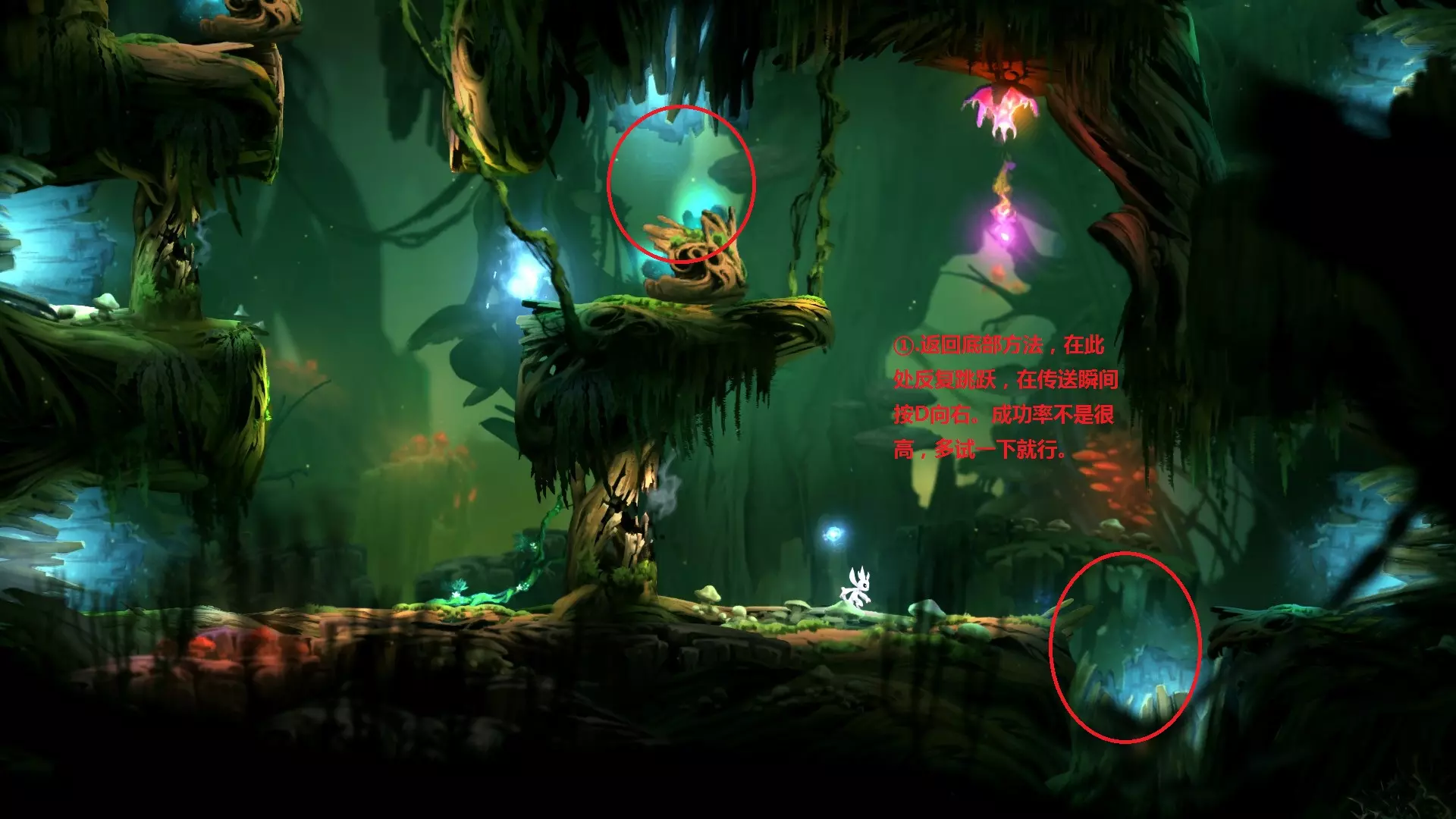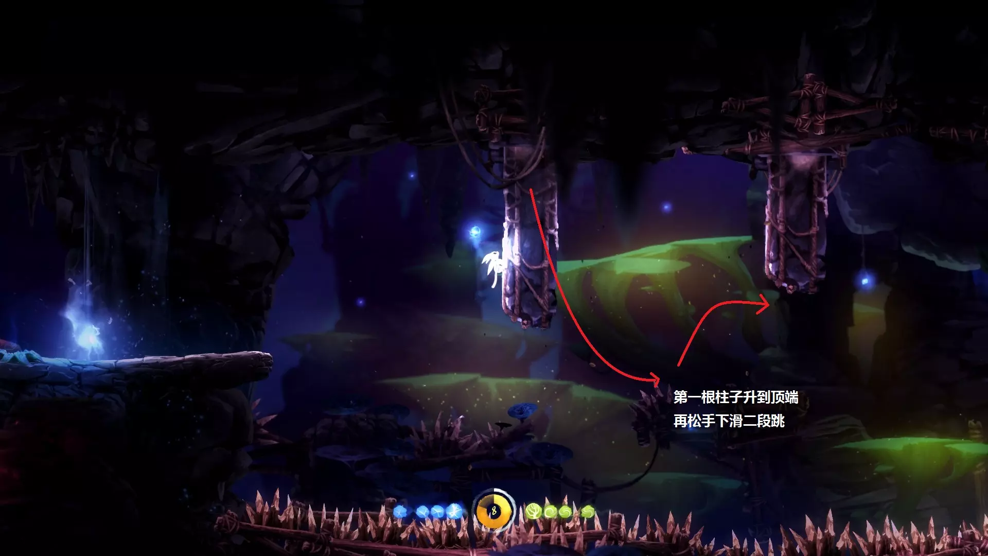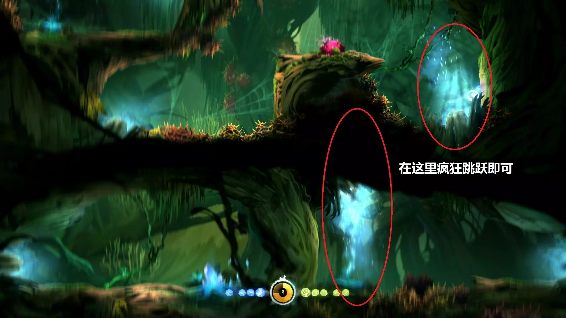 8.到达银树的目的,是为了学习【猛击】,也就是说拿到猛击后就可以离开,无需继续向上。此处省略获取【猛击】的正常流程。 9.第二个重点是关于如何返回,我们需要利用一个漏洞才能回到银之树的顶端,具体方法如下。