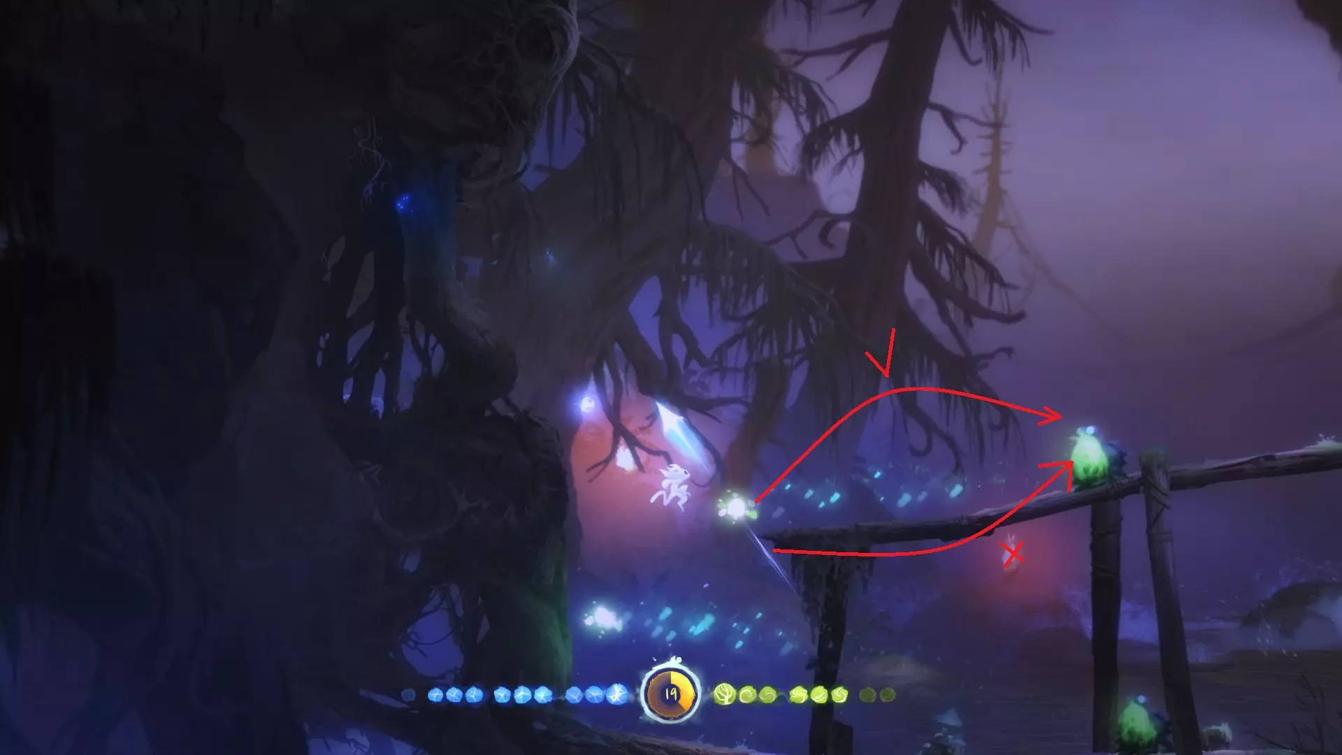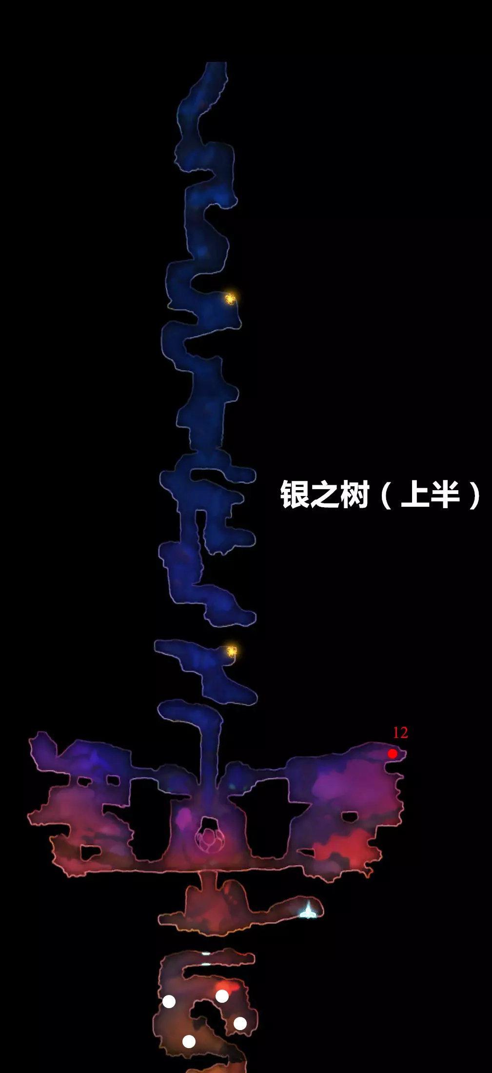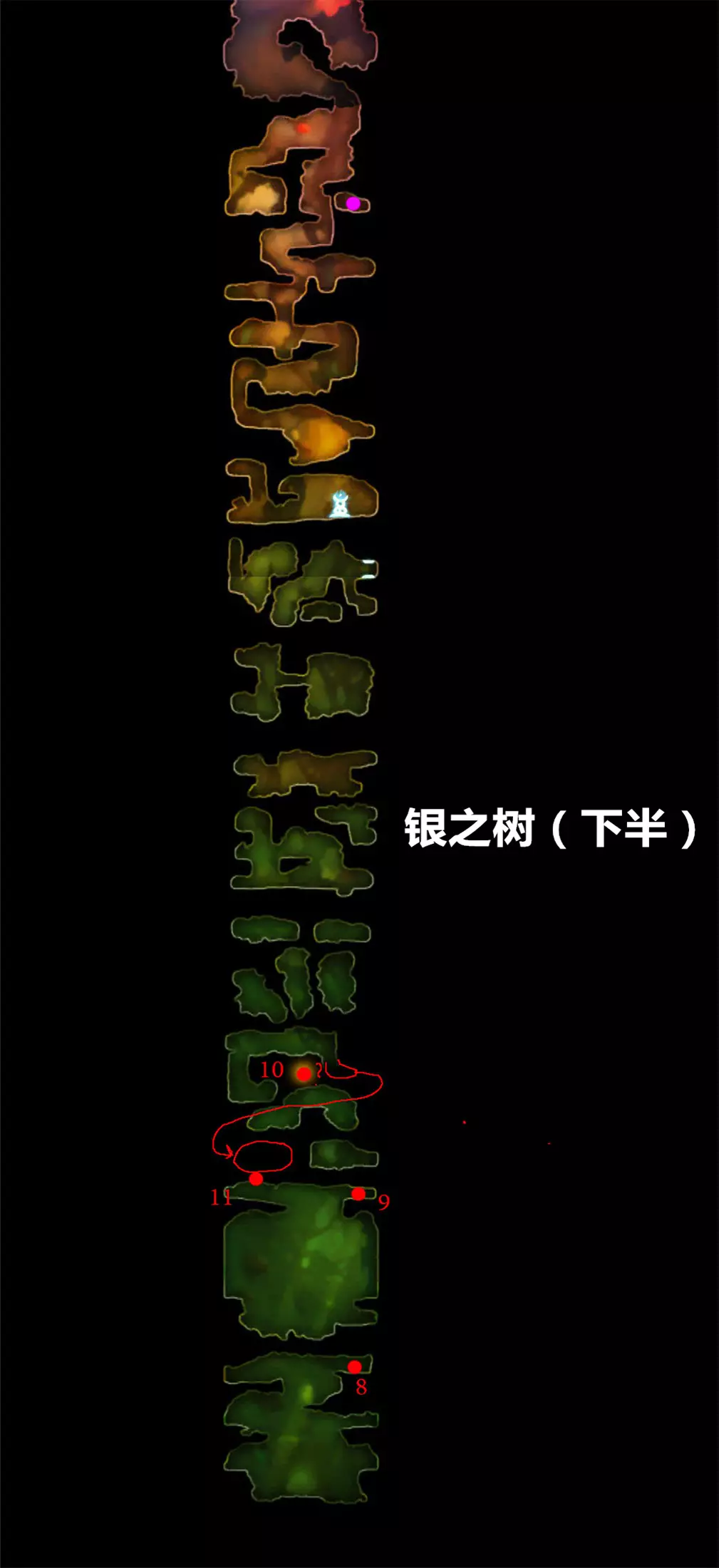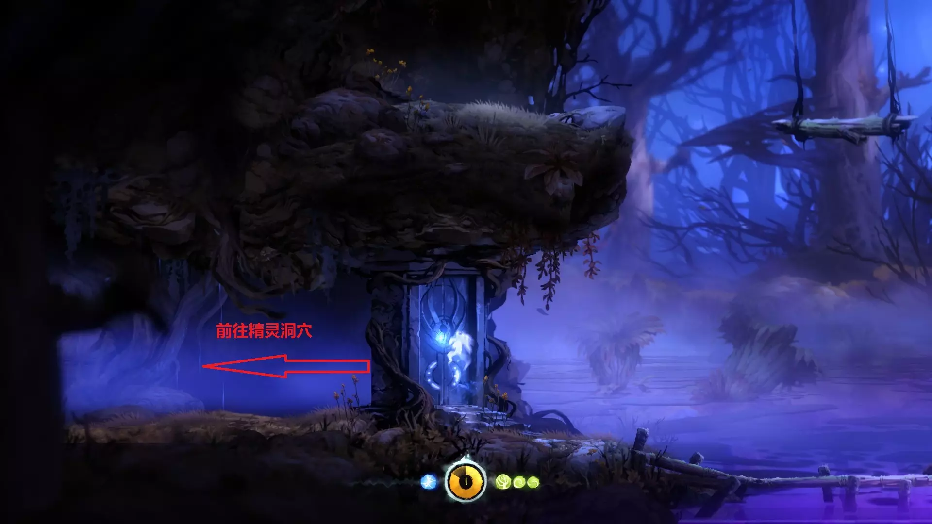 7.继续正常流程,一路向下到达咕噜的藏身处,习得【二段跳】后(此处省略部分正常流程内容)返回前往银之树(不记得路线可参考上文地图)。途中经过激光区域时,会发现激光尚未激活——这是因为相关剧情还未触发,此时无需走右侧路径,应向左走前往银之树。
