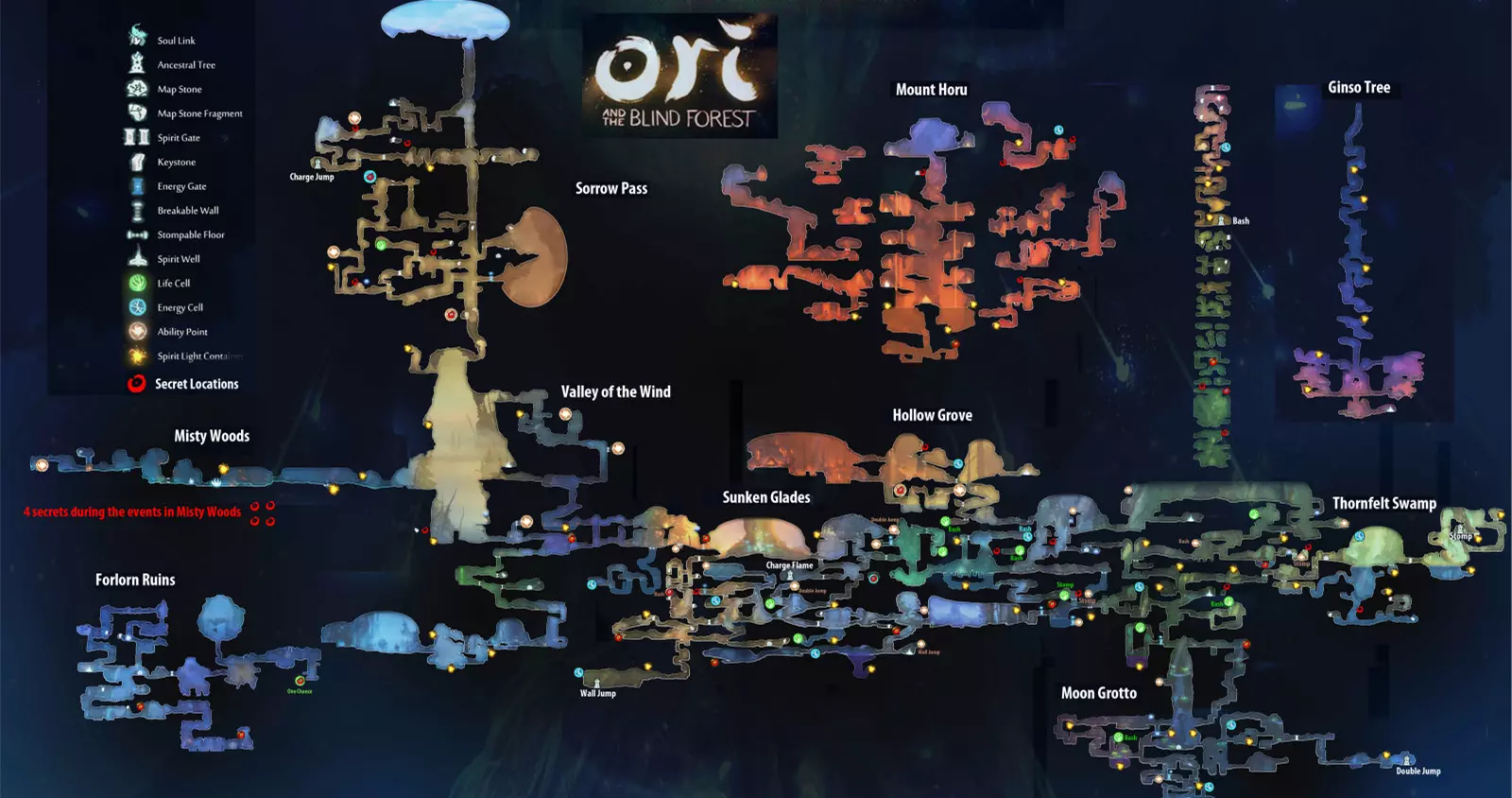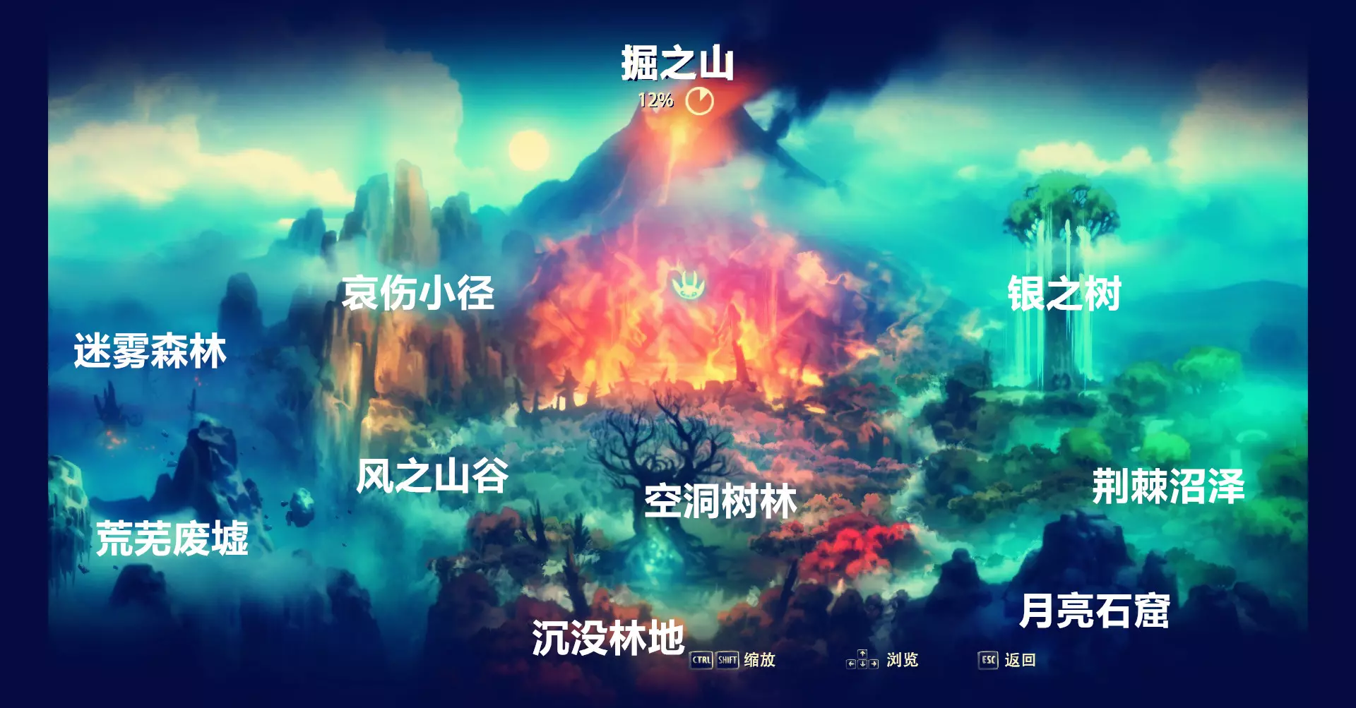 从地图上我们可以看出,《奥日与黑暗森林》的地图是2D相互联系的。各部分小地图请参照【成就part2(全收集)】 整个大地图共分为10个小部分: 沉没林地、荒芜废墟、月亮石窟、迷雾森林、哀伤小径、 荆棘沼泽、风之山谷、空洞树林、银之树、掘之山 **游戏保存机制** 在这里先说一下,其实游戏可以有10个存档空位,而不是三个,往右拖动就有了。想做一个成就党就得有不断备份游戏的好习惯。 游戏内的所有怪物都是可以重复刷的。所以在解锁某些成就时,不小心把怪物打死拿不到不要紧,走出视线范围就会重刷了。 再次强调下!这个游戏没有二周目!所以成就得在故事完成前拿完,否则你又得再打一遍!切记,【银之树】、【迷雾森林】、【荒芜废墟】是剧情地点,无法再次返回,因此收集成就和隐藏要素需一次性完成。强烈建议在进入以上地点前进行存档备份! 【终极版(锁区)的荒芜废墟有补救机会,在最后通过远古之井传送后仍可再次返回。普通版则无此机会,需一次性完成所有收集后再离开】此内容附加于荒芜废墟的全收集说明之后。 在此列举上述地点相关的成就(不包括必定获得的),以防各位游玩时疏忽遗漏,后续我会再次提及。 成就描述不可错过地点