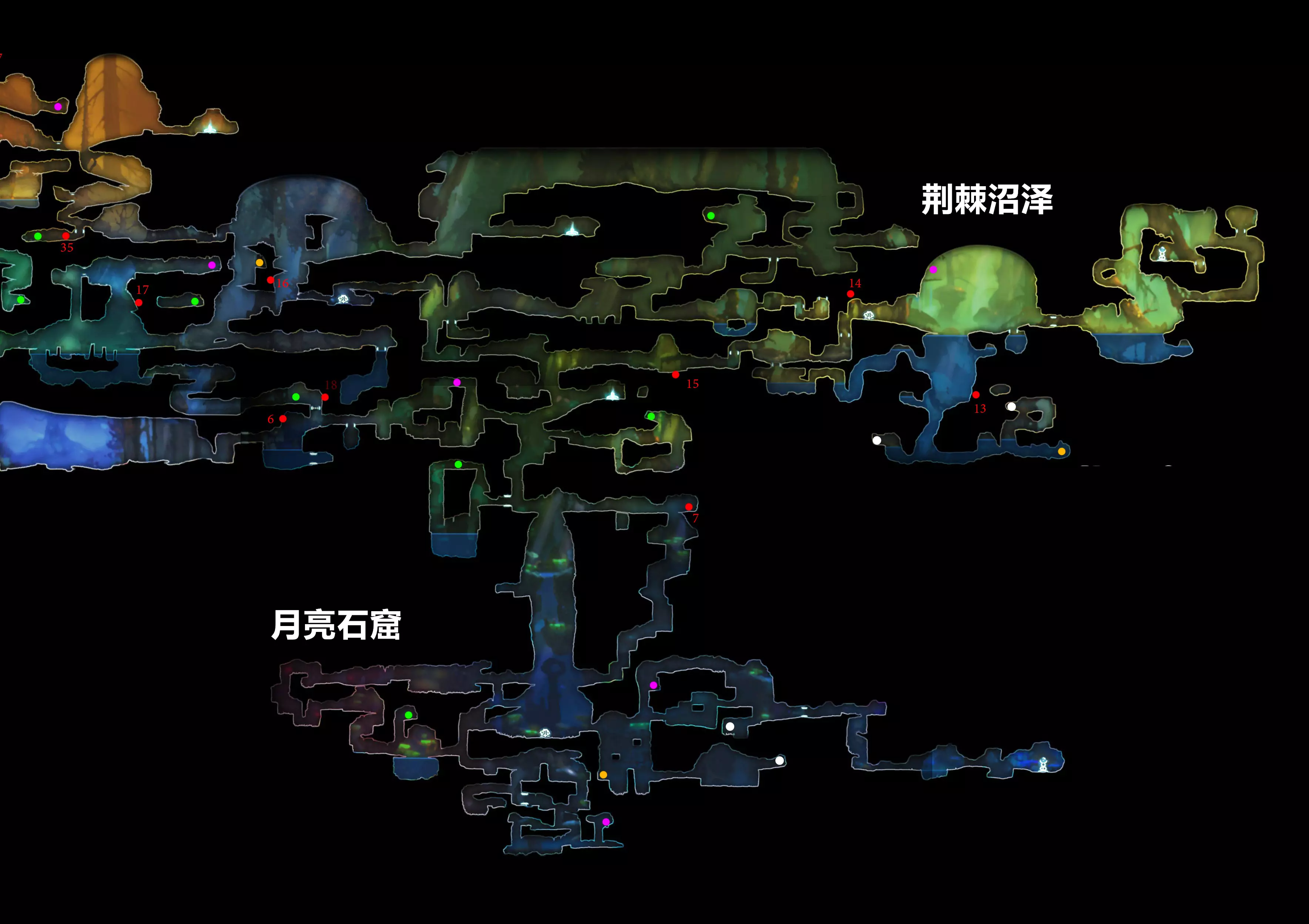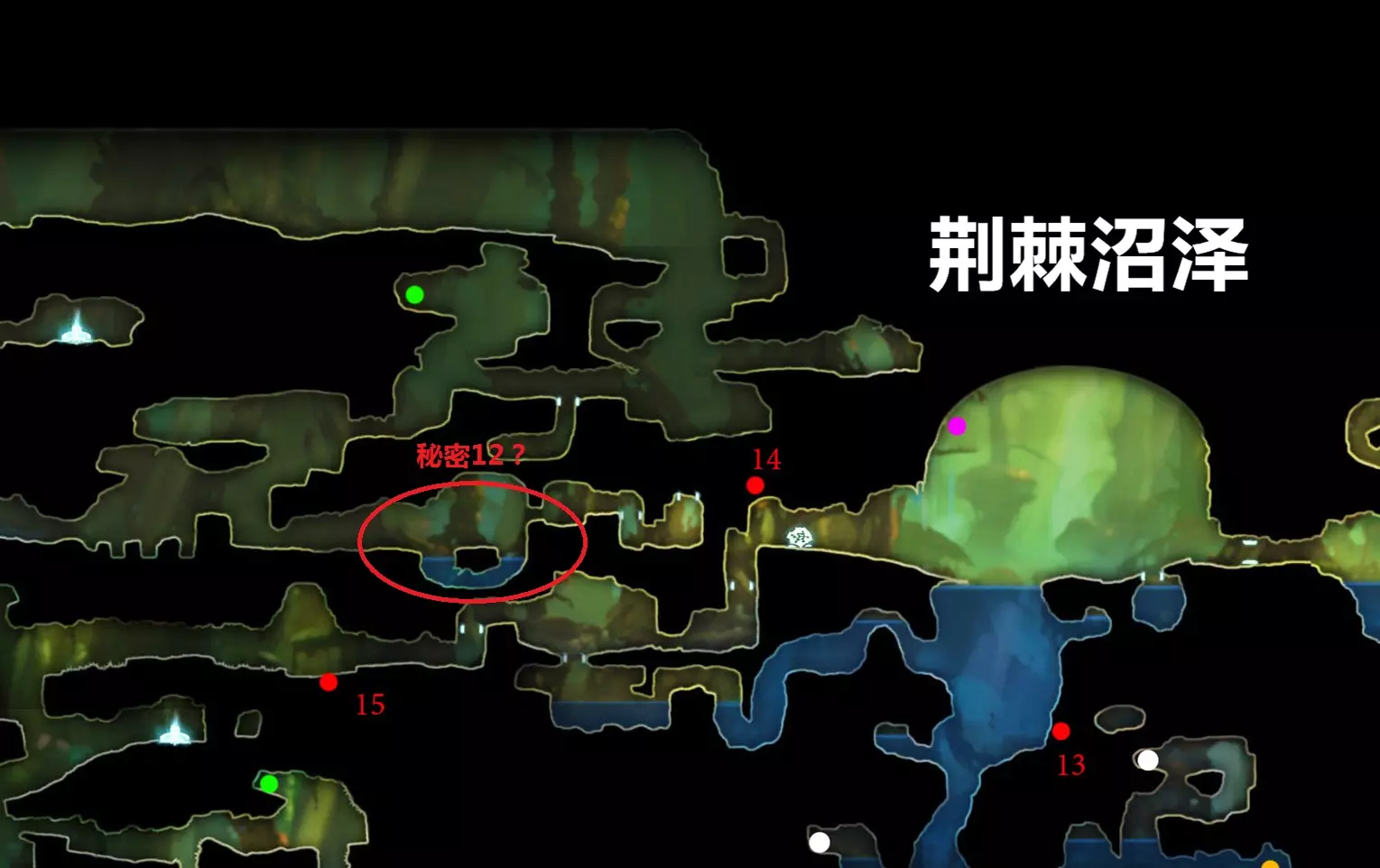 以上就是全部的隐藏跳点了。这些都是我独自花费大量时间截取的,希望大家能尊重我的劳动成果。 关于上图中“秘密12”不计入成就的问题,有资料显示实际上存在43个隐藏点(但成就仅有42个),这意味着迷雾森林中有4个隐藏点(已在上文标出)。另外,关于下方荆棘沼泽的这个点,哪位玩家测试后若发现其不计入成就,请留言告知我,我目前无法确认它是否计入。 感谢热心玩家Kira协助测试,确认该秘密点的确计入成就,而银之树上方的那个点则不计入。