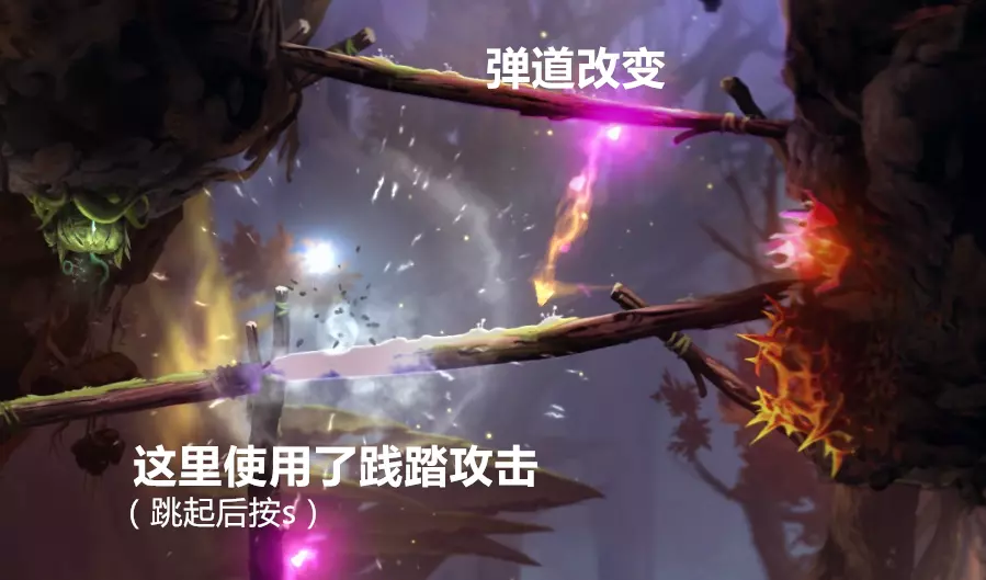 践踏攻击滞空时按S键向下可以破除地面障碍,也能震碎冲撞者的护甲,还可以清理地面上的尖刺。但这个技能在“无伤噩梦”难度下是个坑——很多紧急关卡都会因为你按下S键而功亏一篑……别问我怎么知道的。