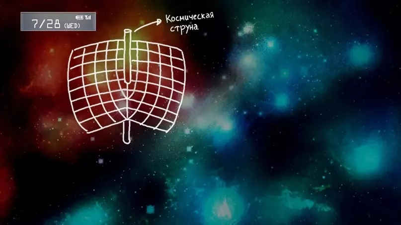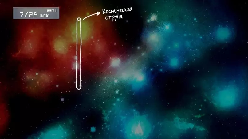 使用奇异物质可以稳定物体,从而实现穿越隧道。想象一下,入口在秋叶原的地洞,出口却在洛杉矶。再想象一下,洛杉矶的洞口会以接近光速的速度往返于宇宙尽头。根据相对论,对于以光速运动的物体来说,时间会变慢。那么,可以认为那个回到洛杉矶的洞口是处于过去的。因此,法因先生能够进入地洞,并在他抵达洛杉矶的数年前从地洞中出来。不过,目前我们只能将其称为伪时间旅行或相对论时间膨胀。关键的一步是回到洛杉矶的地洞。那么穿过隧道的时间将为零,法因先生会在他进入洛杉矶的裂缝的同一时间出现在秋叶原。时间旅行将宣告结束。相比弦理论,地鼠洞理论的条件更容易满足。 1) 所谓的地鼠洞。它们应该存在于宇宙的某个地方,但从未有人见过。2) 用于使虫洞以接近光速的速度往返于宇宙两端的能量。 3) 证实奇异物质的存在。" 6. 奇异物质理论 正如在虫洞理论的描述中所述,奇异物质可能具有负质量。但是,由于至今尚未证实奇异物质的存在,负质量也仍然只是一个假设性的事实。 可以假设它位于宇宙的边缘,以这种方式阻止宇宙运动。但这一理论同样无法得到证实。 7.弦理论 弦理论同样由栗津(Kurisu)进行了描述: -“宇宙弦是一种类似弦的、具有巨大质量的细长裂隙。宇宙弦的直径远小于基本粒子,而其长度则略小于一个星系。”