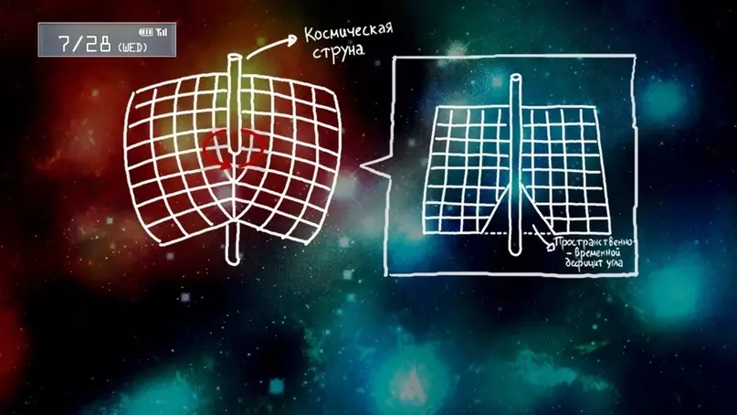 “宇宙弦质量极大,因此能够扭曲时空。如果你尝试在扭曲区域内完成一整圈旋转,实际转过的角度会小于360度。”