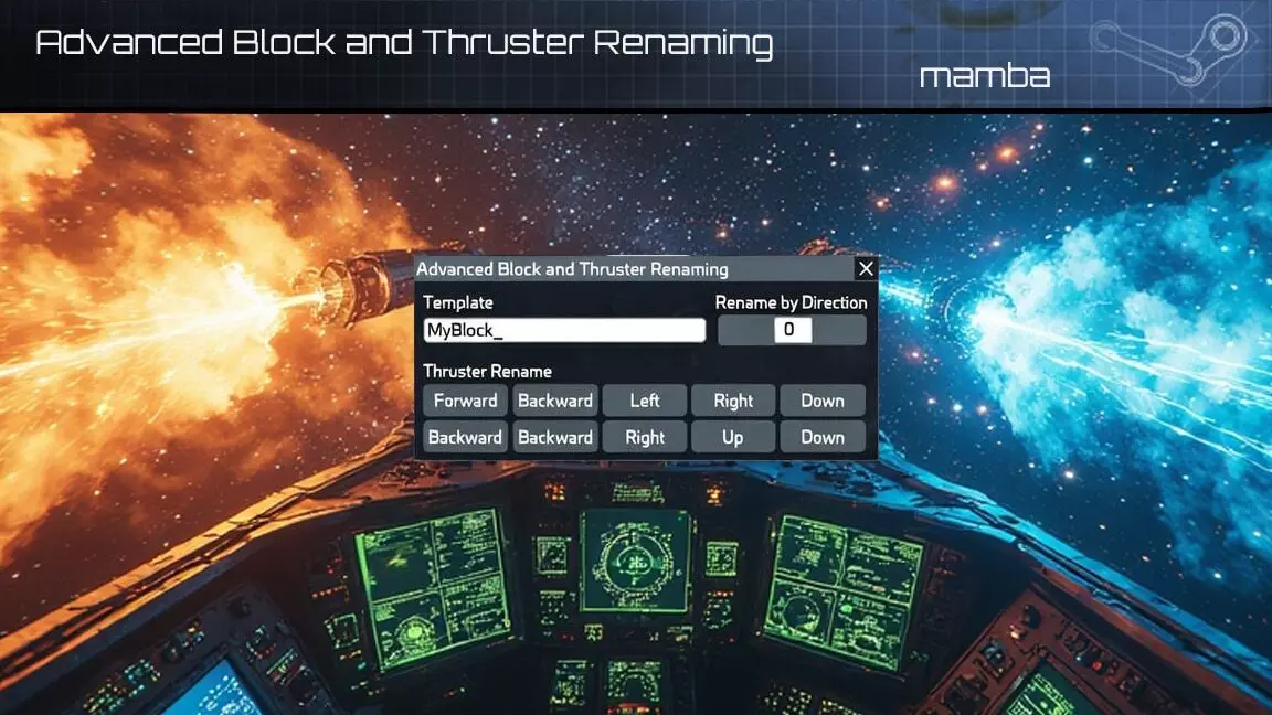 mamba 的高级方块与推进器重命名 该模组通过为推进器及其他方块添加高级控制功能,增强了《太空工程师》中的方块重命名操作,让你能够轻松地一次性重命名多个方块。