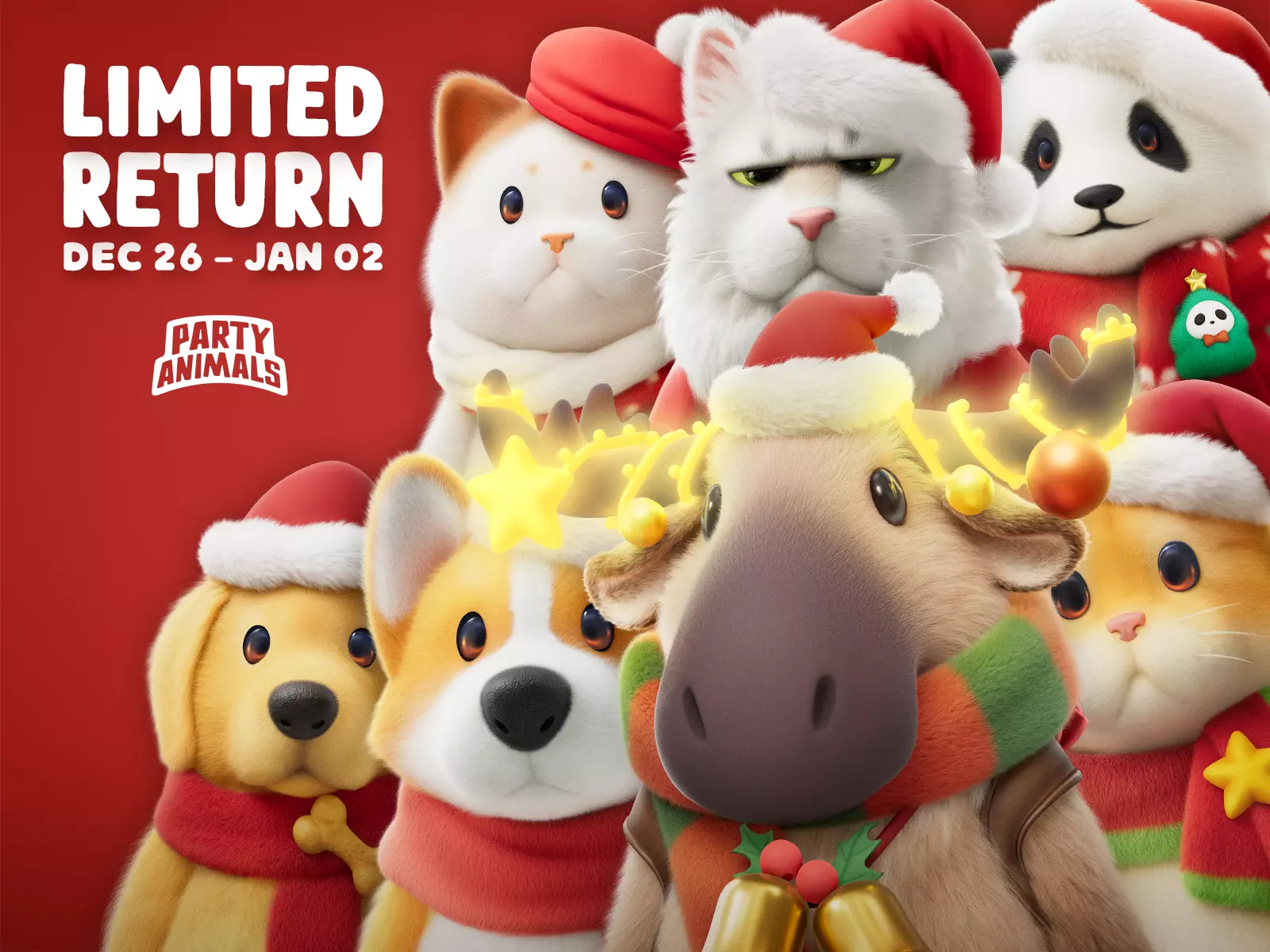 《猛兽派对》限时活动及功能更新内容 1. **投掷物“雪球”与“黄金炸弹”限时回归** 投掷物“雪球”和“黄金炸弹”将在2025年12月19日20:00至2026年1月2日20:00(太平洋时间)期间限时返场。 2. **圣诞每日登录奖励** 可领取尼莫币!在2025年12月23日20:00至2025年12月26日20:00(太平洋时间)期间登录《猛兽派对》,每日可获得200尼莫币,共计3天。 3. **功能更新** ① **冬季小屋地图优化**: - 新增钓鱼点“冰洞”。 - 新增天气系统。 - 新增互动物品“收音机”。 - 新增区域“水族馆”。 - 支持坐着钓鱼。 - 支持在工具箱中切换当前鱼竿。 - 支持在水桶中“锁定”特定鱼类,锁定的鱼类在出售所有鱼时会被保留。### 更新内容 1. **恢复了雪球大战和拉雪橇玩法**。 2. **调整了钓鱼日志中条目的顺序**。 3. **在“WHAT IF?模式”下的自定义游戏中启用了地图选择功能**。 4. **创建自定义游戏大厅时,将“WHAT IF?模式”和“SMASH模式”重新归类为“Last Stand”(此前列于“The Lab”分类下),并将原“Last Stand”分类下的地图重新归类为“Last Stand Classic”**。 5. **新增“同步动作”功能**:玩家在一定距离内使用相同动作时,可同步彼此的动作。(仅支持部分动作) ### 优化内容 - **冬季小屋 - 钓鱼玩法中新增保底机制**:该机制可确保玩家在长时间钓鱼后更容易获得合理回报。本次调整后,高品质鱼类的整体掉落率预计将略有提升。 优化冬季小屋的经验值奖励:完成桌游或成功出售鱼类后将立即获得经验值,而颁奖阶段不再提供经验值,仅保留用于拍照。 优化自定义游戏的大厅设置,根据所选模式显示不同选项。 在设置 - 音频中新增麦克风输入设备选择功能。 在设置 - 声音下新增“AI 降噪”开关(此前默认开启。此设置仅支持 Windows 系统)。 在设置 - 常规 - 特别鸣谢中新增翻译与测试贡献者名单。新增支持在当前大厅的下一场游戏中直接使用新解锁的成就服装或升级服装。