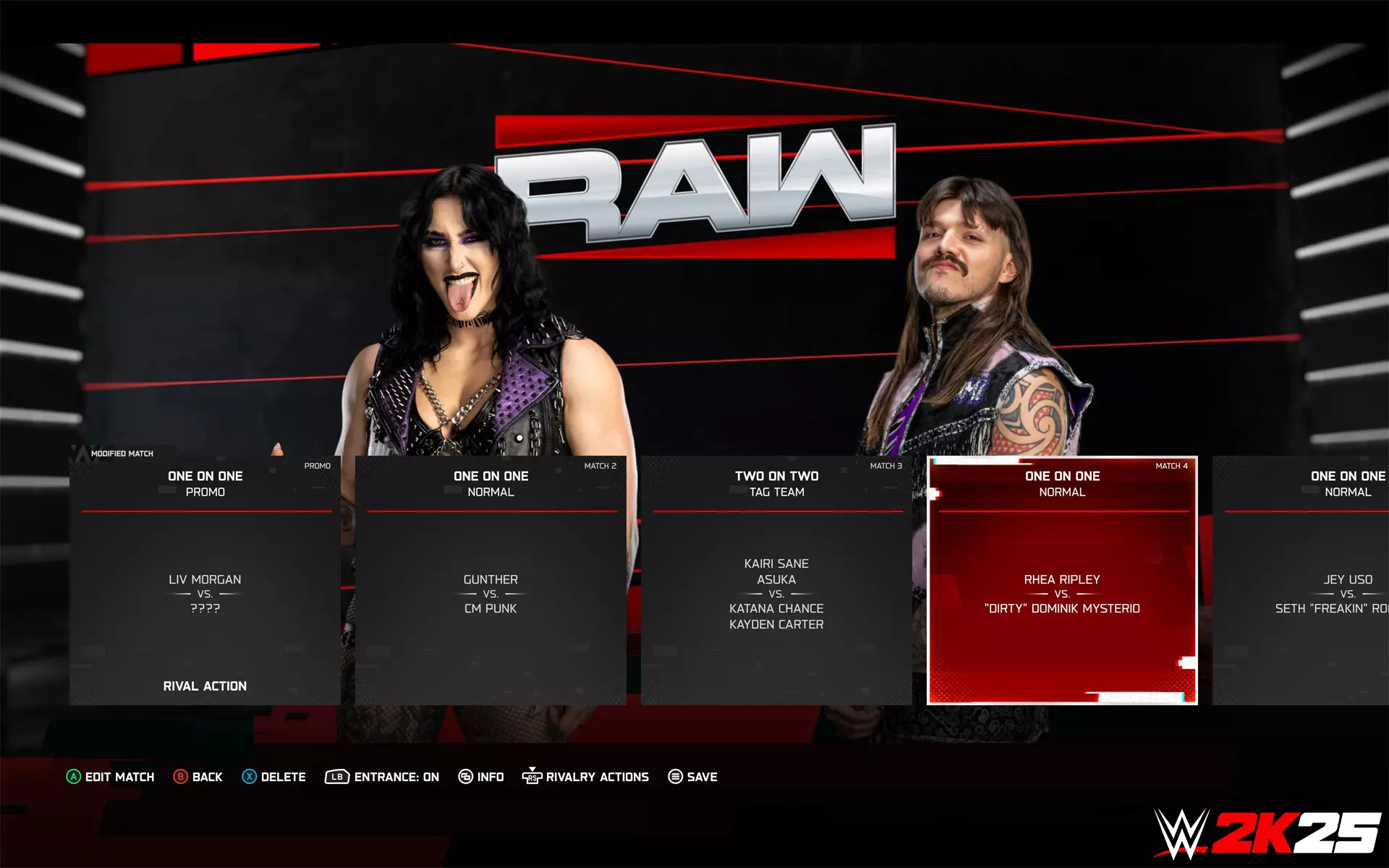 团队成员现在可以在团队中拥有自定义角色: - **单打(Singles)**:优先参与单打和混战比赛 - **双打(Tag)**:优先参与双人组队比赛,并可与另一名双打角色团队成员共同参与双打组别冠军争夺 - **三人组队(Trio)**:优先参与三人团队比赛 - **四人组队(Quad)**:优先参与四人团队比赛 - **经理(Manager)**:优先作为团队成员比赛的经理 团队现在还支持3人或以上稳定阵容的分组。这些分组是大型团队中的较小团体,可以拥有自己独特的名称、出场宣告、观众反应、入场仪式、胜利庆祝以及与基础团队不同的角色设定。 创建新分组时,默认会继承其基础团队的设置作为起点,但可以进行编辑。匹配机制与跨性别对战 在今年的游戏中,我们对匹配机制进行了改进,以提升稳定性和可靠性。此外,在比赛卡片生成过程中还加入了新的评分和排序系统。该新系统会综合考虑每场比赛的多个因素,例如参赛超级巨星的综合评分、比赛是否为世界冠军头衔赛(以及更多其他因素),从而精心编排比赛卡片,同时将最大型的对决优先安排为节目的主战赛和开场赛。 比赛列表也新增了“主战赛”标签页,当你希望指定特定类型或子集的比赛作为节目的最终比赛时,可进行更多自定义设置。如果主战赛列表为空,则将使用标准比赛列表来确定主战赛。《WWE 2K25》宇宙模式将支持游戏中新引入的比赛类型——地下赛和血统规则赛,以及全新的乱斗场景。 随着《WWE 2K25》中跨性别摔角的加入,宇宙模式同样支持该功能,玩家可选择开启或关闭此选项。