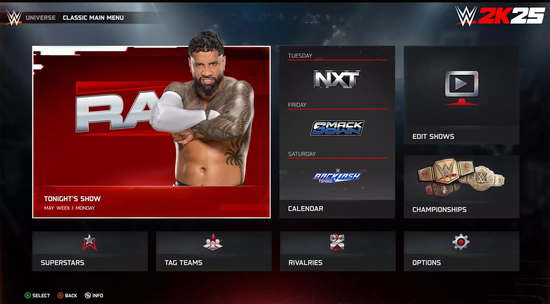 若你设置一个为期两晚的付费直播赛事(PLE),以下是一些可用选项和参数: - 付费直播赛事(PLE)的第二天可安排在第一天之后的4周内的任意一天,因此你的付费直播赛事(PLE)的两天活动不一定需要连续进行。 - 匹配将在为期两天的付费直播赛事(PLE)的两个晚上进行分配,选手名单会分布在两个晚上,因此你不能重复安排同一位超级巨星。 - 比赛数量也会影响两个晚上。例如,如果你将赛事设置为7场比赛,这意味着两个晚上各有7场比赛,总共14场。 - 现在可以在日历菜单中与其他付费直播赛事(PLE)互换,并且可以通过编辑菜单将赛事移至不同日期。《WWE 2K25》宇宙模式更新内容 1. **新增锦标赛PPV支持**:宇宙模式日历中新增了对“擂台之王”和“擂台之后”等锦标赛PPV的支持。在这些锦标赛中,来自主办节目的8名超级巨星将进行一系列1v1对决,每场比赛的胜者晋级,败者淘汰。官方锦标赛的最终胜者将获得在《夏日狂潮》大赛中挑战冠军的资格。 2. **自定义锦标赛PPV**:玩家可使用“擂台之王”或“擂台之后”PPV模板,创建自定义的锦标赛PPV。 3. **团队管理系统**:宇宙模式中加入了全新的团队管理系统,玩家可将超级巨星分配到多个团队中。