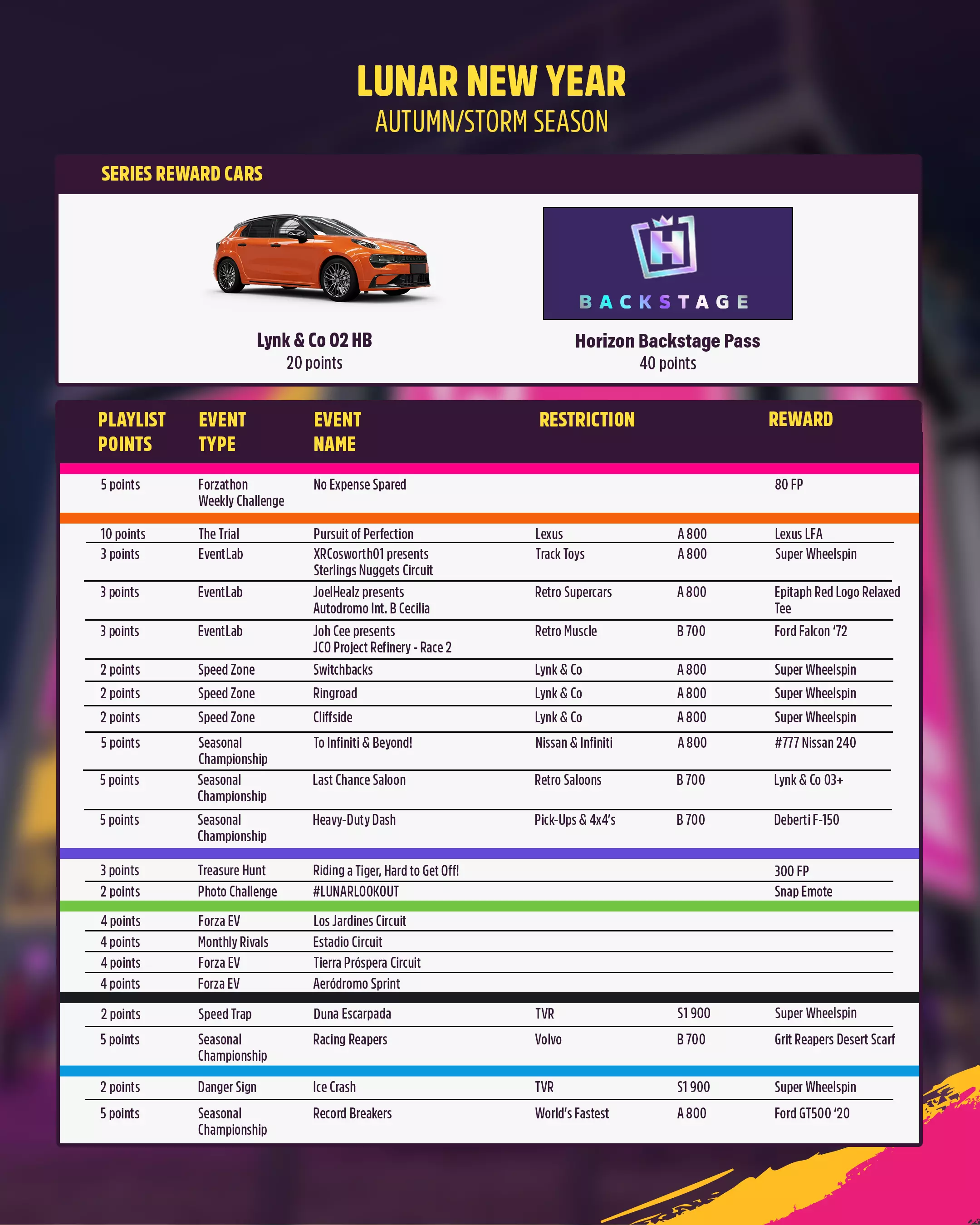 系列奖励 80点:2022款现代IONIQ 6 160点:2016款蔚来EP9 春季奖励 20点:2022款领克02 Hatchback 40点:后台通行证(Backstage Pass)