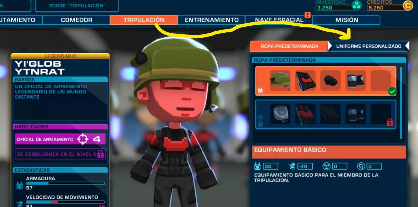 仔细考虑哪个属性最适合船员的每个成员,例如,工程师需要速度以便快速到达各个地方进行维修,但也需要抗性来保证生存。装备的装甲越厚,速度就越慢。工程师需要的速度多于装甲,而武器官和安全官则需要更多的装甲而非速度。 通常,在配置船员时,你可以为你的官员购买一套标准装备,但如果你想自定义装备,就必须前往“自定义制服”。