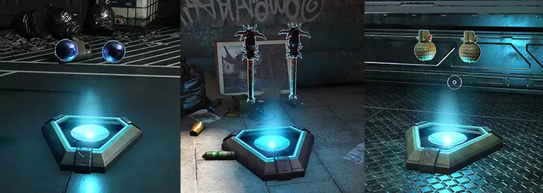 可以用手榴弹命中目标并使其爆炸 等离子手榴弹可以挂在队友身上 等离子手榴弹可以击落刷新点处的武器(示例) 如果扔出手榴弹后立即向其方向使用斥力装置,手榴弹会飞得更远 服装模组