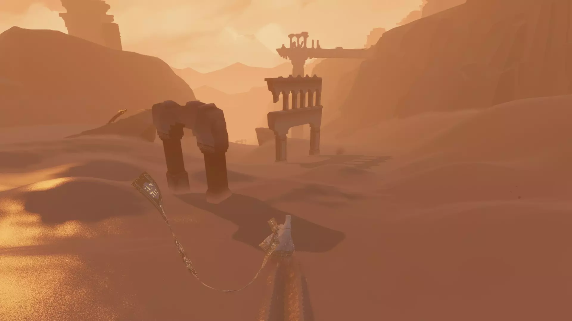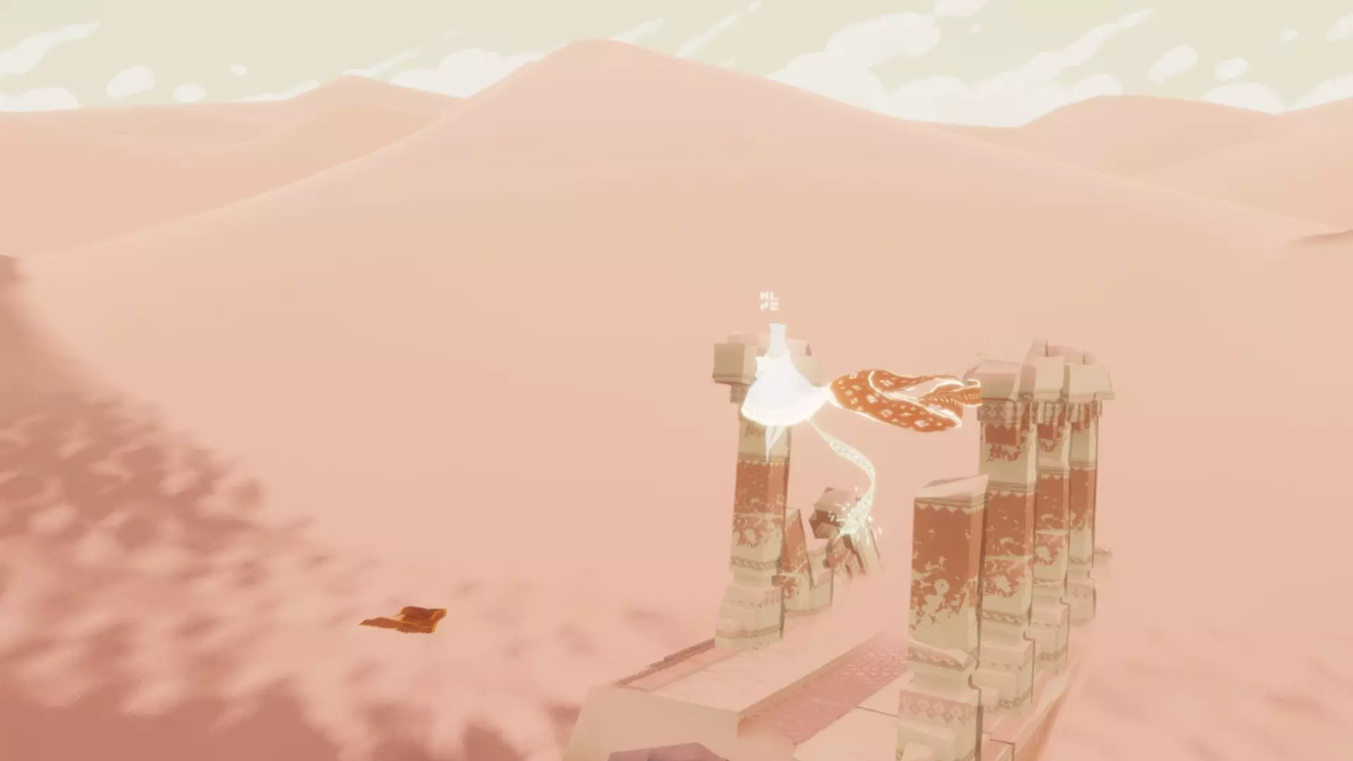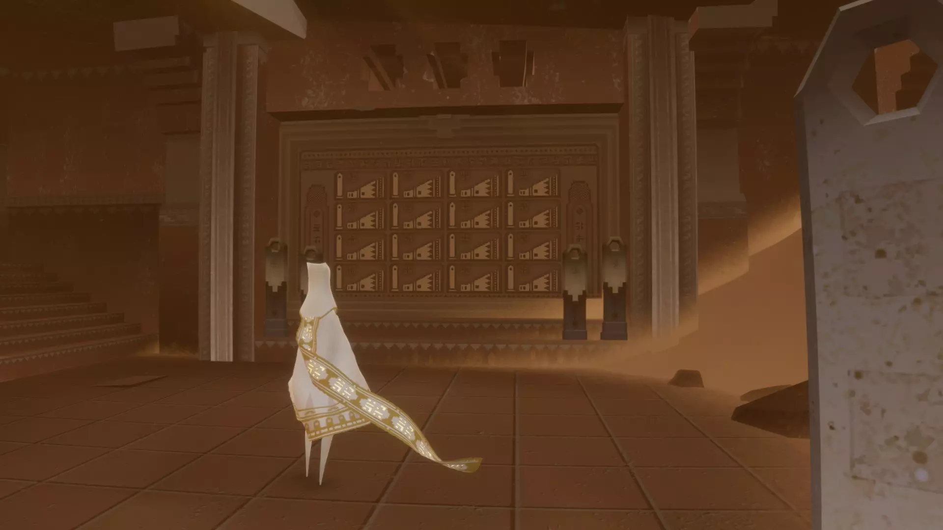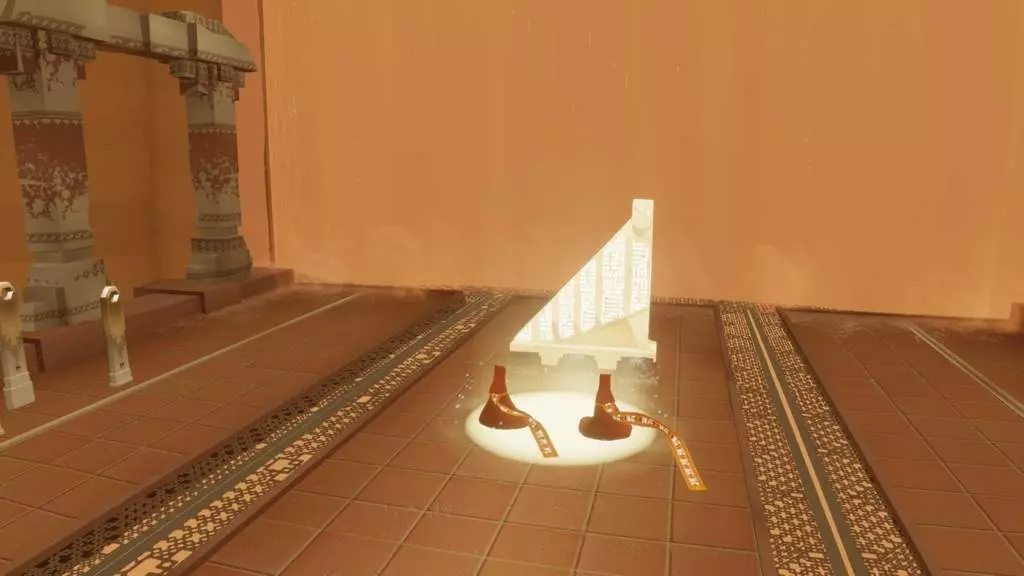 在区域起点,向前穿过几座沙丘,直到发现藏有一些布偶生物的废墟。从这里出发,朝着另一座沙丘上的山峰前进,就能找到一座小型神殿,里面有一个符文。