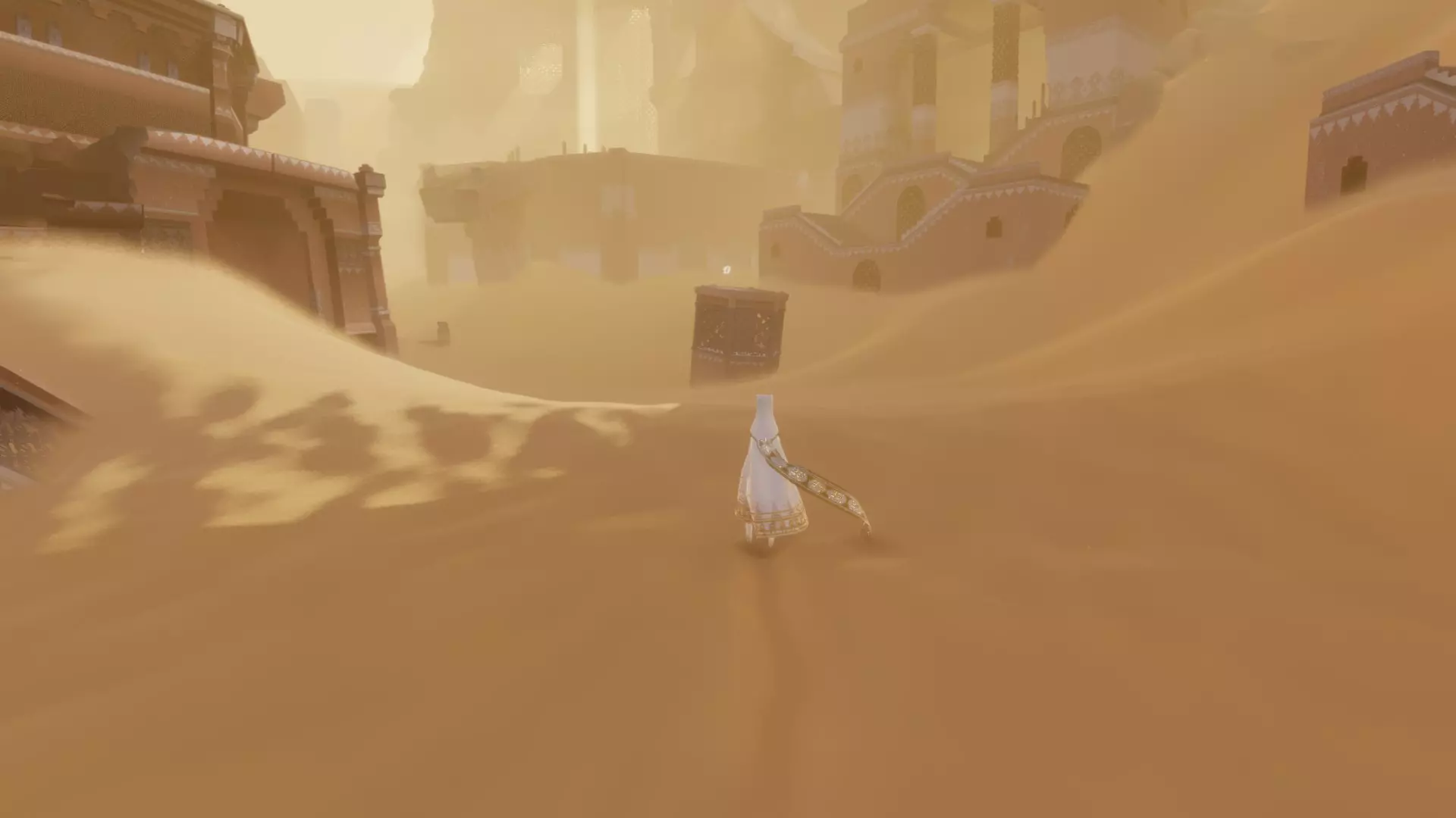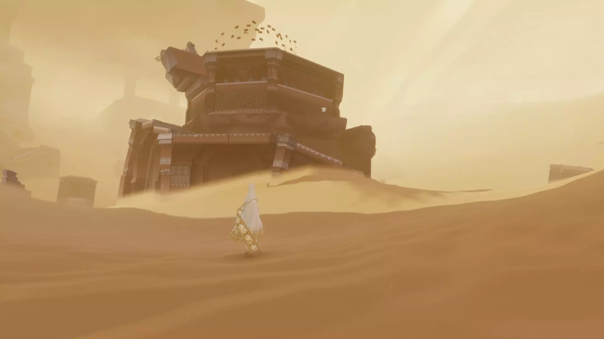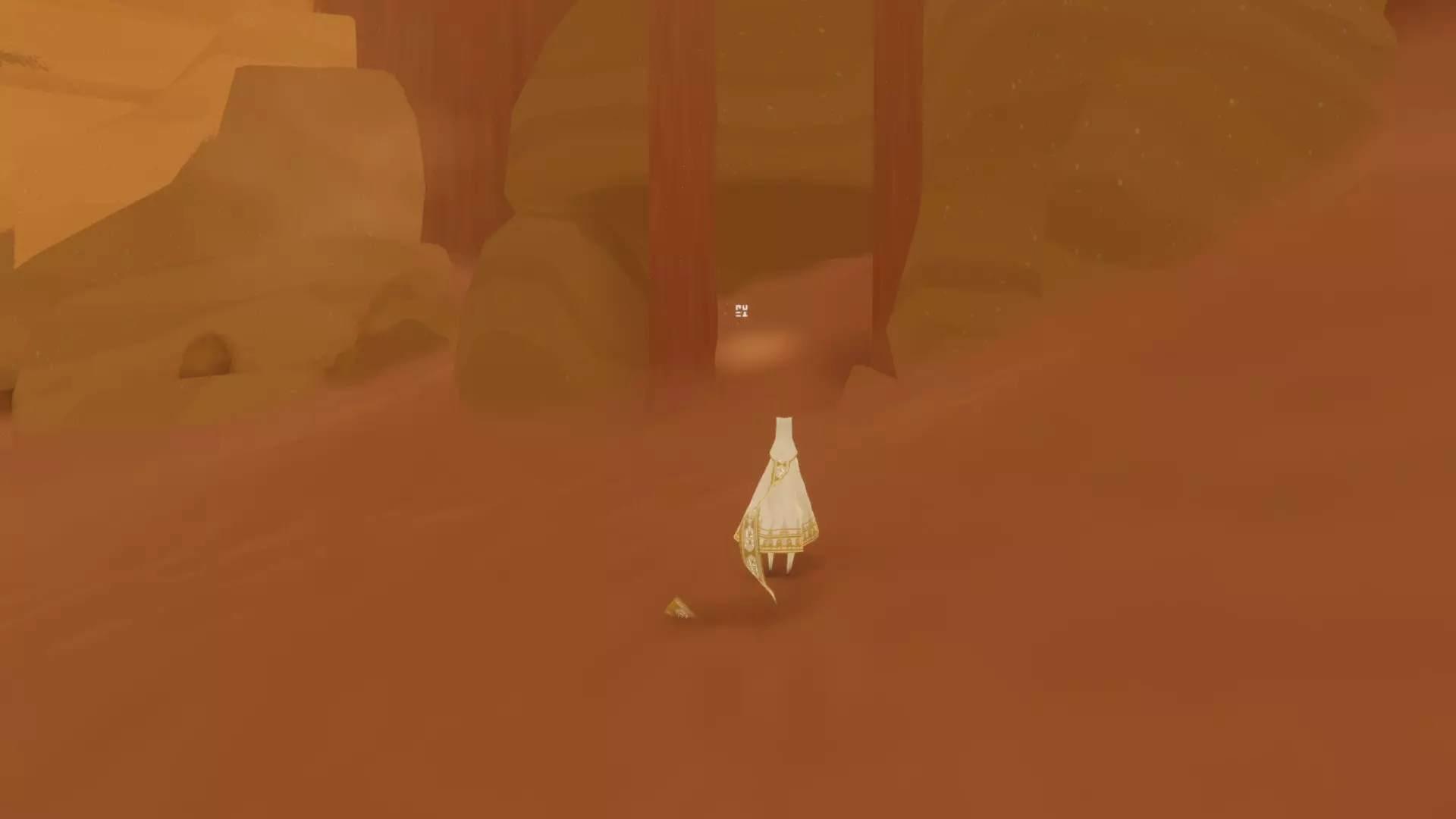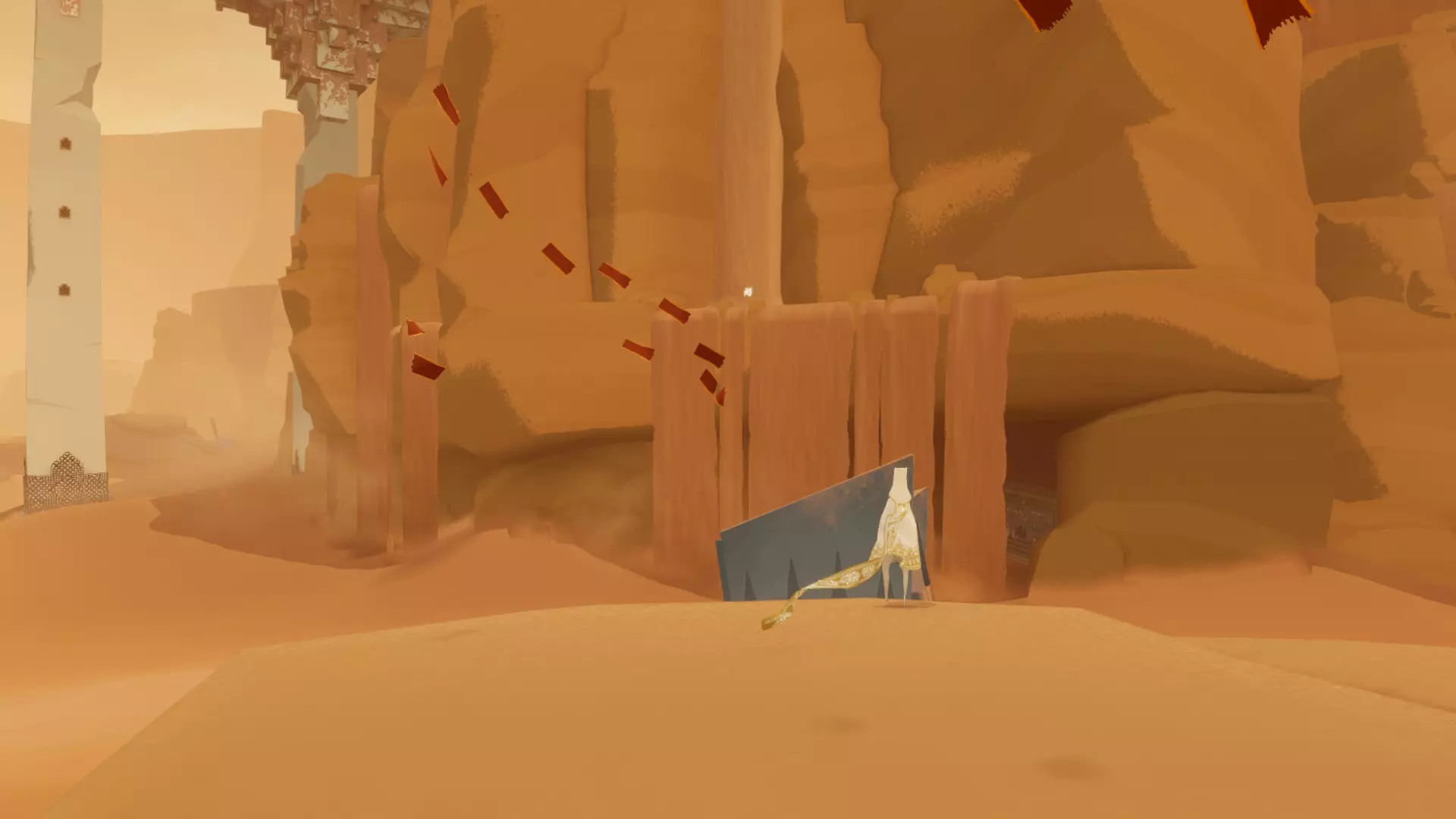 在区域起点,向前穿过几座沙丘,直到发现藏有一些布偶生物的废墟。从这里出发,朝着另一座沙丘上的山峰前进,就能找到一座小型神殿,里面有一个符文。