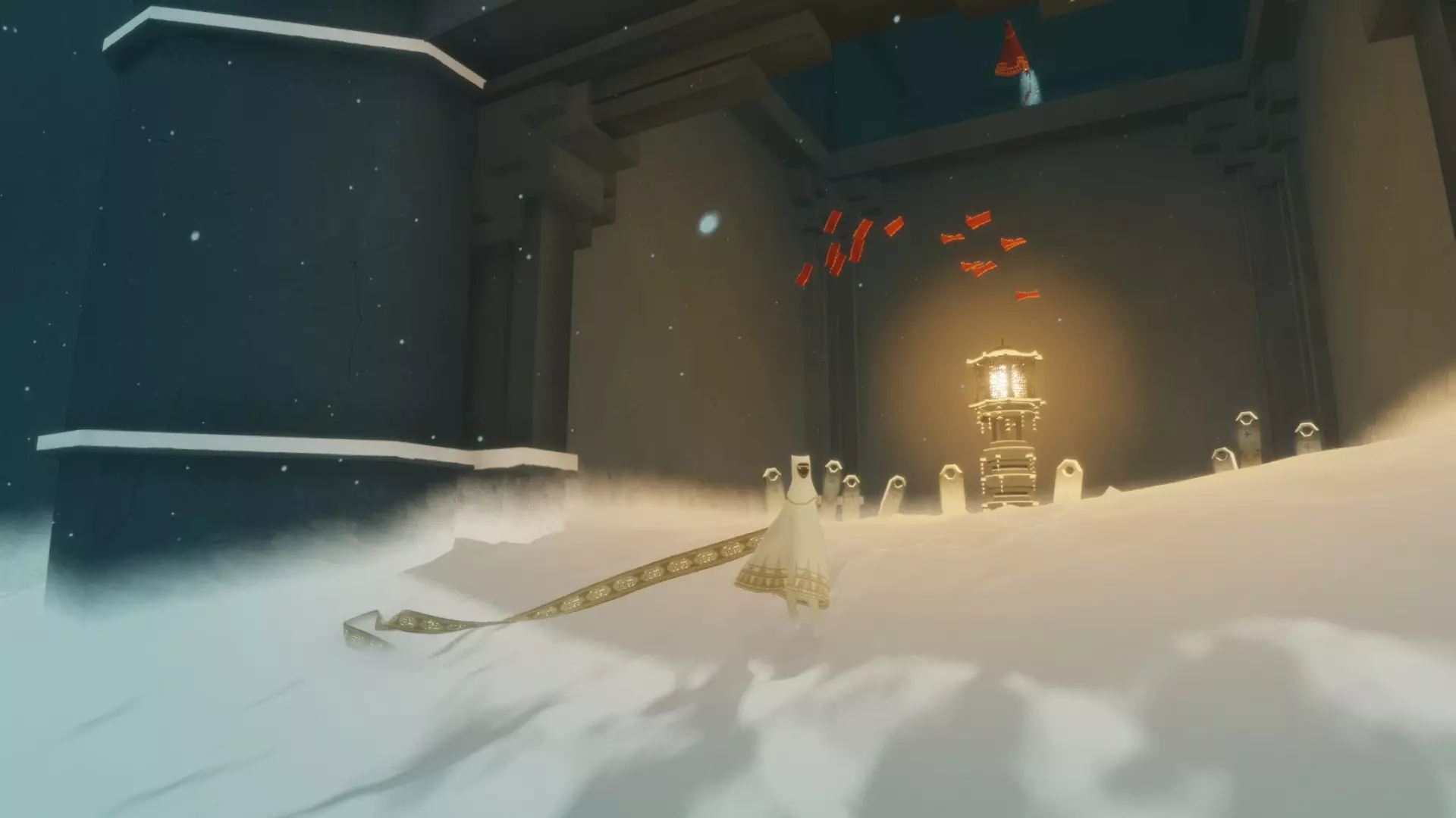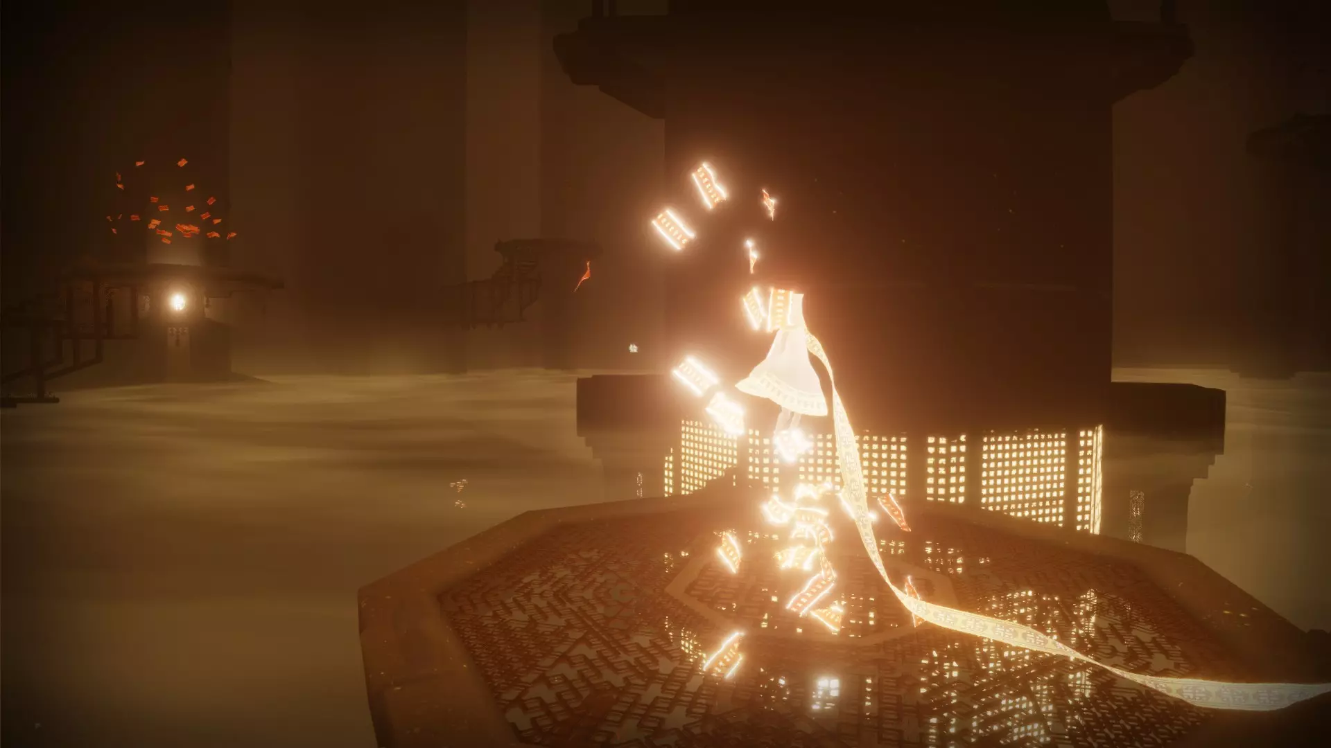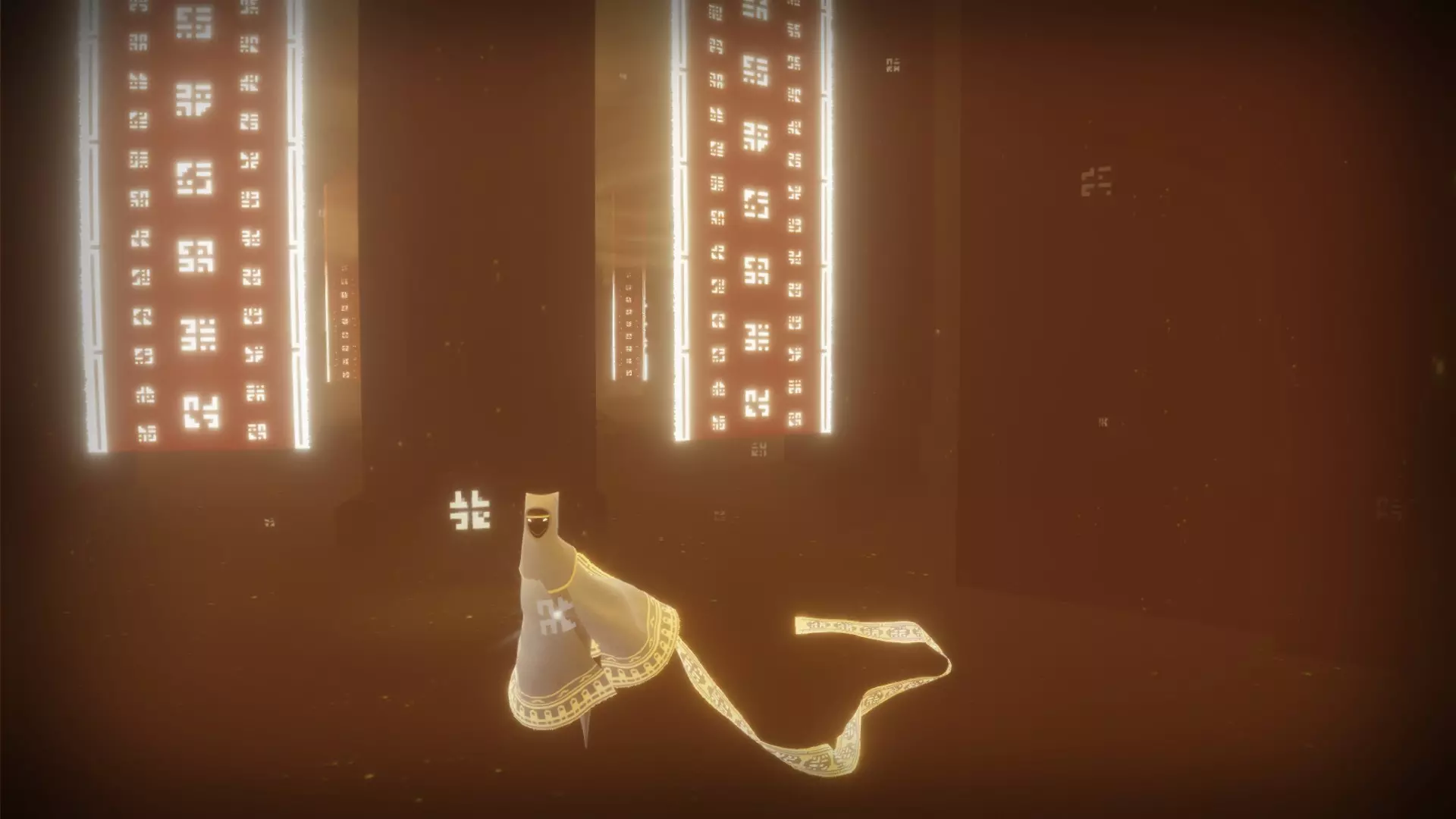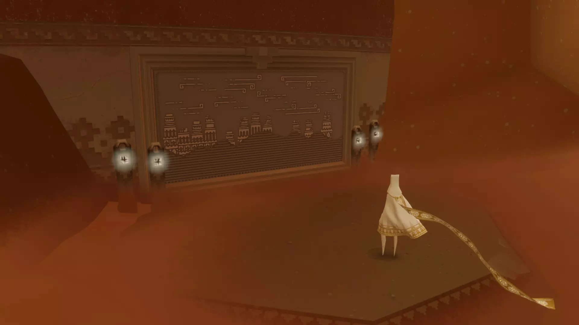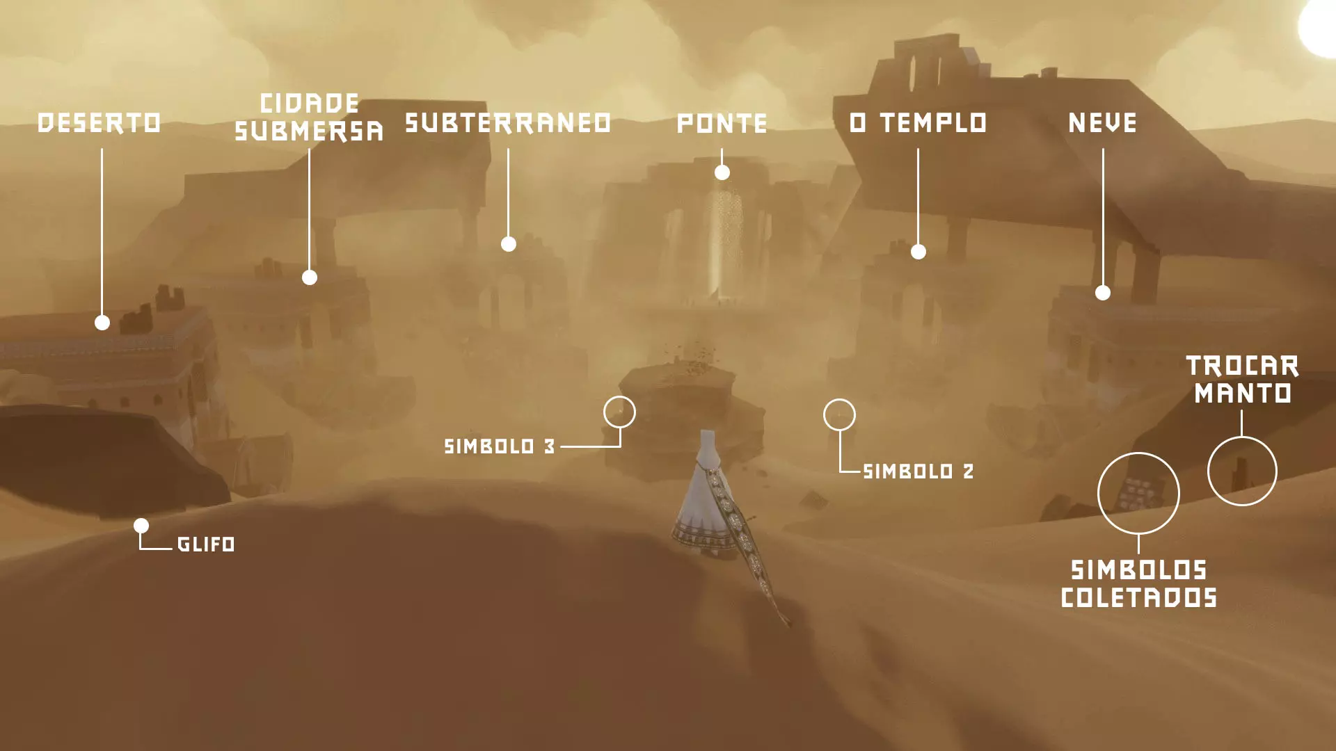 超越 在一次或多次旅程中收集所有发光符号。 总共有21个独特的符号,随着你获取这些符号,你的围巾会变得更长。 包含符号的章节如下: 传送门:3个 桥梁:3个 沙漠:4个 水下城市:3个 地下:4个 神庙:4个 雪地:0个 天空:0个 完成游戏后,你可以使用章节选择功能查看在哪些章节收集或遗漏了符号。前往本图片中已收集符号的位置。