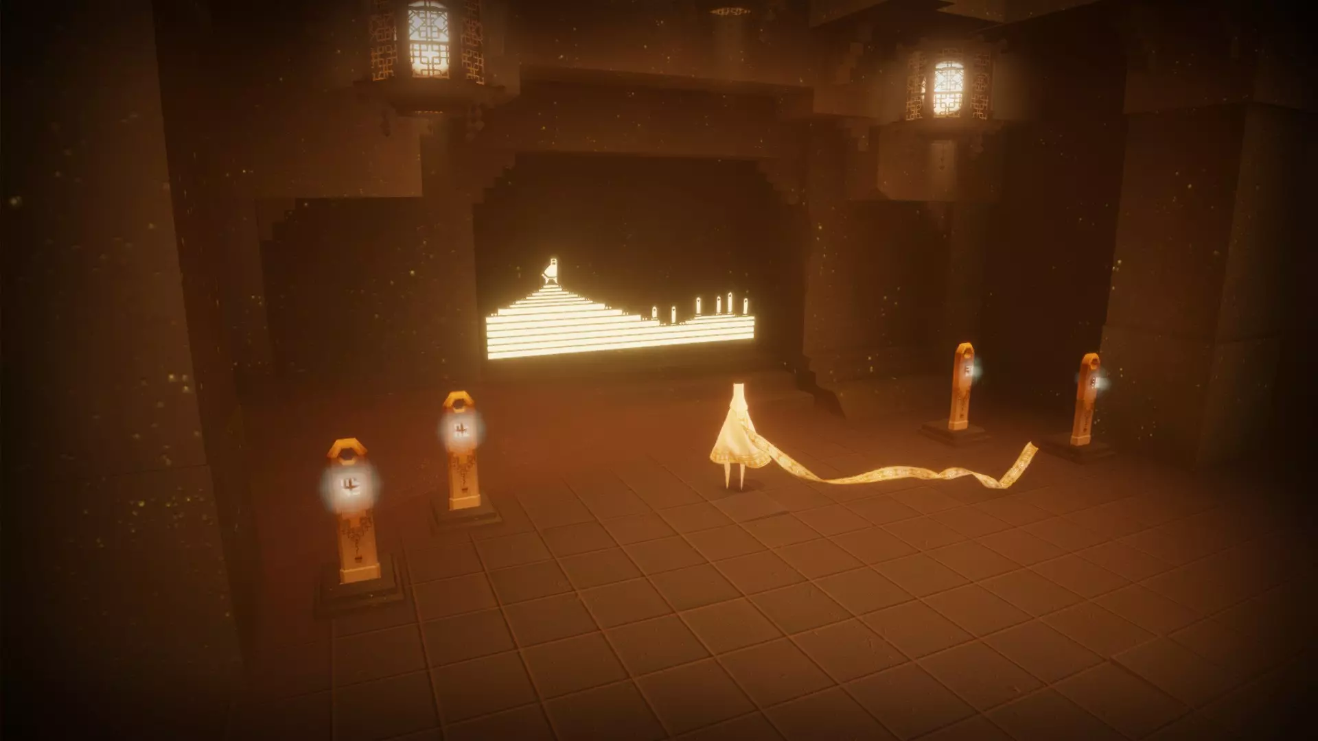 ● 完成此操作最简单的方法是尽量沿着左侧墙壁前进。 ● 最困难的部分是最后一个房间,里面有两名守护者在巡逻。这个房间的技巧是:沿着左侧缓慢移动,直到你看到最近的守护者的光线射向房间深处,然后快速滑到关卡终点。你可以尝试躲避光线,但由于速度很快,即使被他们发现,也能顺利通过而不会损坏围巾! 先祖们